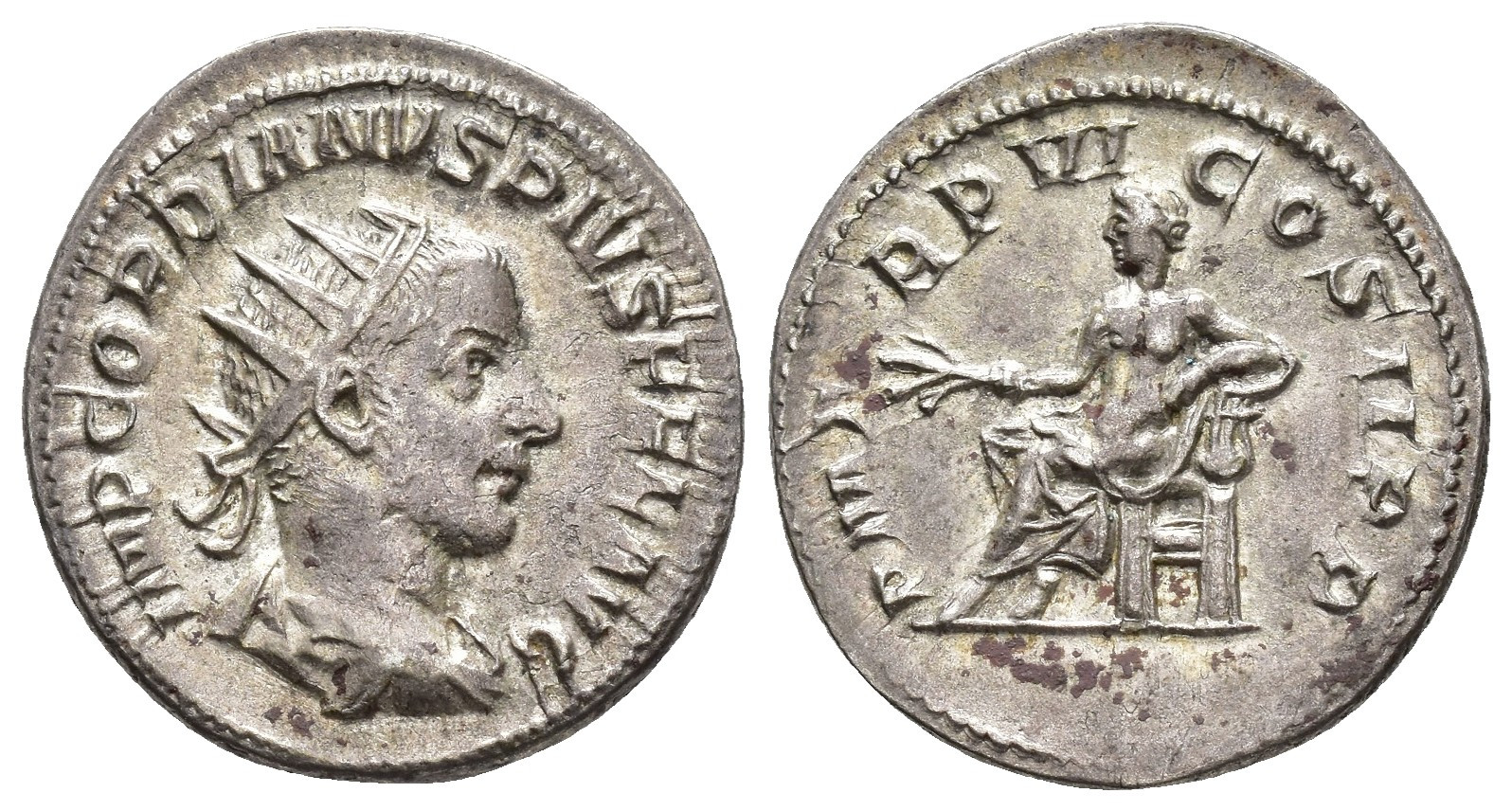 IMPERIO ROMANO. GORDIANO III. Antoniniano. Roma (241-243). A/ Busto radiado, drapeado y acorazado a der.; IMP GORDIANVS PIVS FEL AVG. R/ Apolo sentado a izq. con rama y apoyado en lira; P M TR P VI COS II P P. VE 3,72 g. 22,7 mm. RIC-90. MBC.