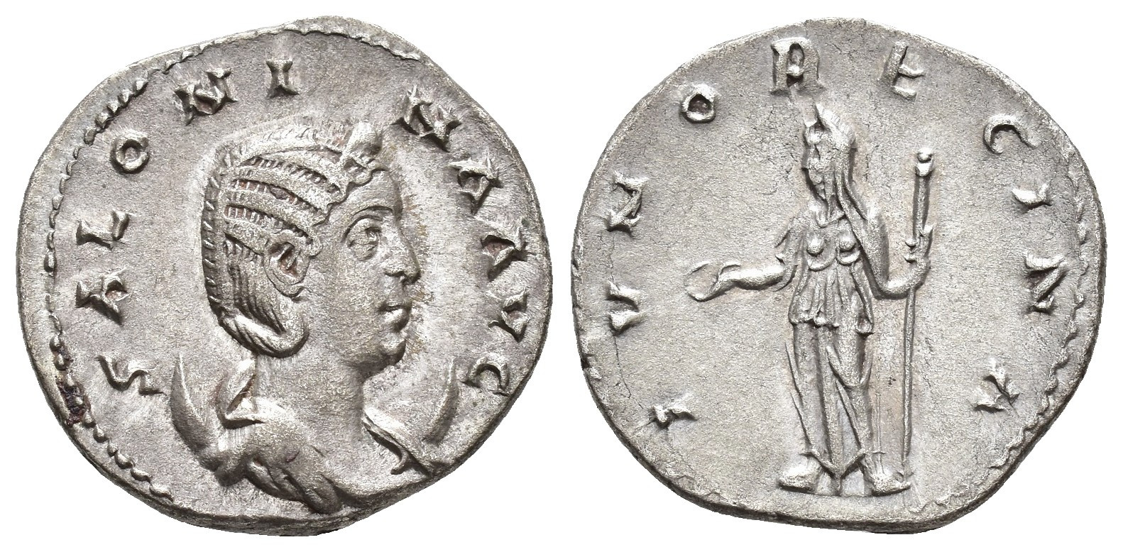 IMPERIO ROMANO. SALONINA. Antoniniano. Roma (257-258). A/ Busto diademado, drapeado y sobre creciente a der.; SALONINA AVG. R/ Juno a izq. con pátera y cetro; IVNO REGINA. VE 3,47 g. 21,2 mm. RIC-29. MBC+.