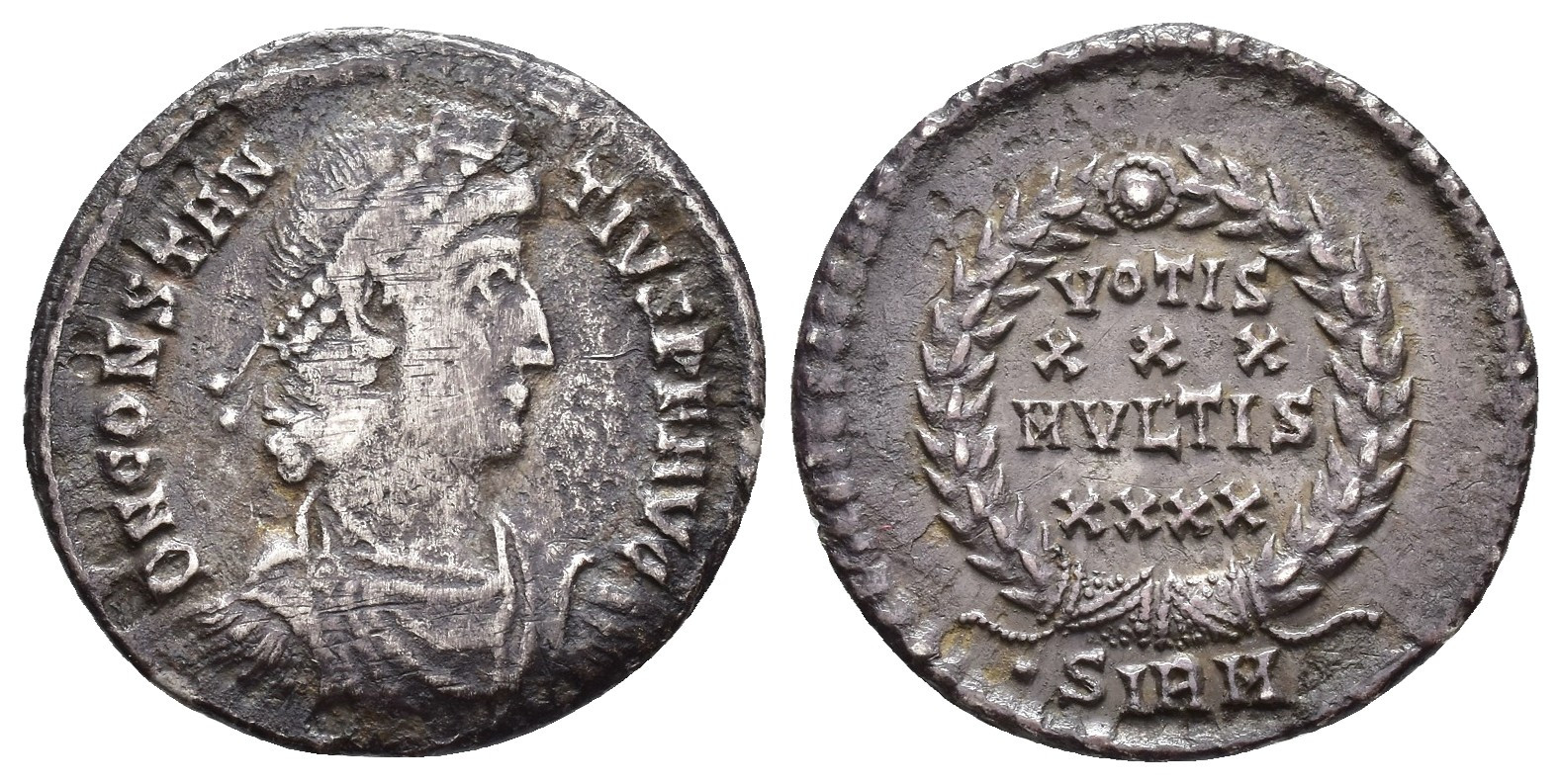 IMPERIO ROMANO. CONSTANCIO II. Silicua. Sirmium (351-355). A/ Busto diademado de perlas, drapeado y acorazado a der.; D N CONSTANTIVS P F AVG. R/ Láurea rodeando VOTIS/XXX/MVLTIS/XXXX; -/-//.SIRM.. AR 3,18 g. 20 mm. RIC-17. Pequeñas marcas. BC+/MBC+.
