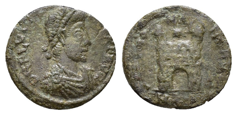 IMPERIO ROMANO. FLAVIO VÍCTOR. Follis. Aquileia (387-388). A/ Busto diademado de perlas, drapeado y acorazado a der.; D N FL VICTOR P F AVG. R/ Puerta de campamento; SPES ROMANORVM apenas visible; -/-//(S)MA(-). AE 0,95 g. 13,3 mm. RIC-55B. MBC-/BC-. Escasa.