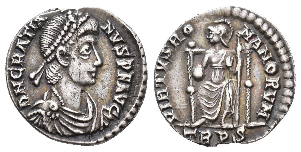IMPERIO ROMANO. GRACIANO. Silicua. Treveris (378-383). A/ Busto diademado de perlas, drapeado y acorazado a der.; D N GRATIANVS P F AVG. R/ Roma entronizada de frente con globo y cetro; VIRTVS ROMANORVM. -/-//TRPS. AR 1,92 g. 16,9 mm. RIC-58. Fina grieta. MBC/MBC+.