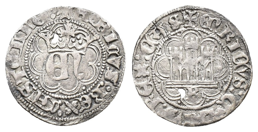 REINOS DE CASTILLA Y LEÓN. ENRIQUE IV. 1/2 real. Burgos. Punto a la der. del castillo. AR 1,64 g. 20,6 mm. III-696 var.; BMM-925.1. Perforación en el centro. MBC.