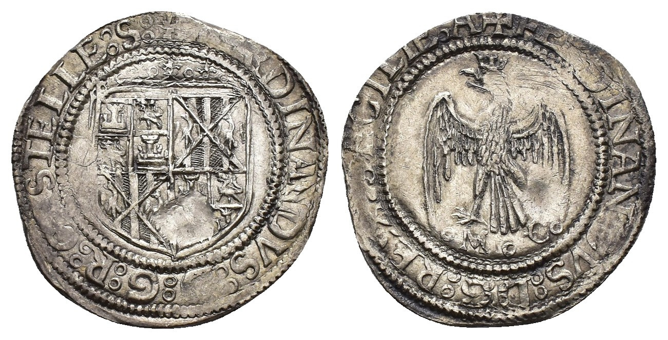 FERNANDO EL CATÓLICO. Pirral o tarí. Messina. M-C en rev. AR 3,52 g. 26,4 mm. Crus.-1239. Rayas en anv. MBC+.