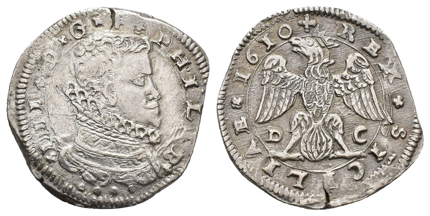 FELIPE III. 4 tarí. 1610. Messina. D-C. AR 10,4 g. 29,8 mm. Vti.-126. Cospel abierto. MBC+.