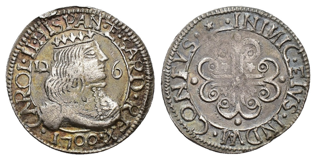 CARLOS II. 2 1/2 reales. 1700. Cagliari. AR 5,86 g. 25,2 mm. MIR-86.5; Vti.-240. Rayitas. Acuñación floja en rev. Golpe en gráfila. MBC.