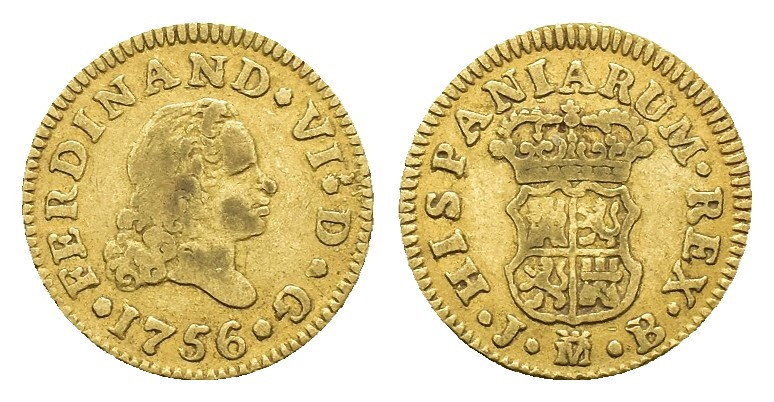 FERNANDO VI. 1/2 escudo. 1758. Sevilla. JV. Ley. con estrellas. AU 1,75 g. 14,5 mm. VI-435; AC-586. MBC-.