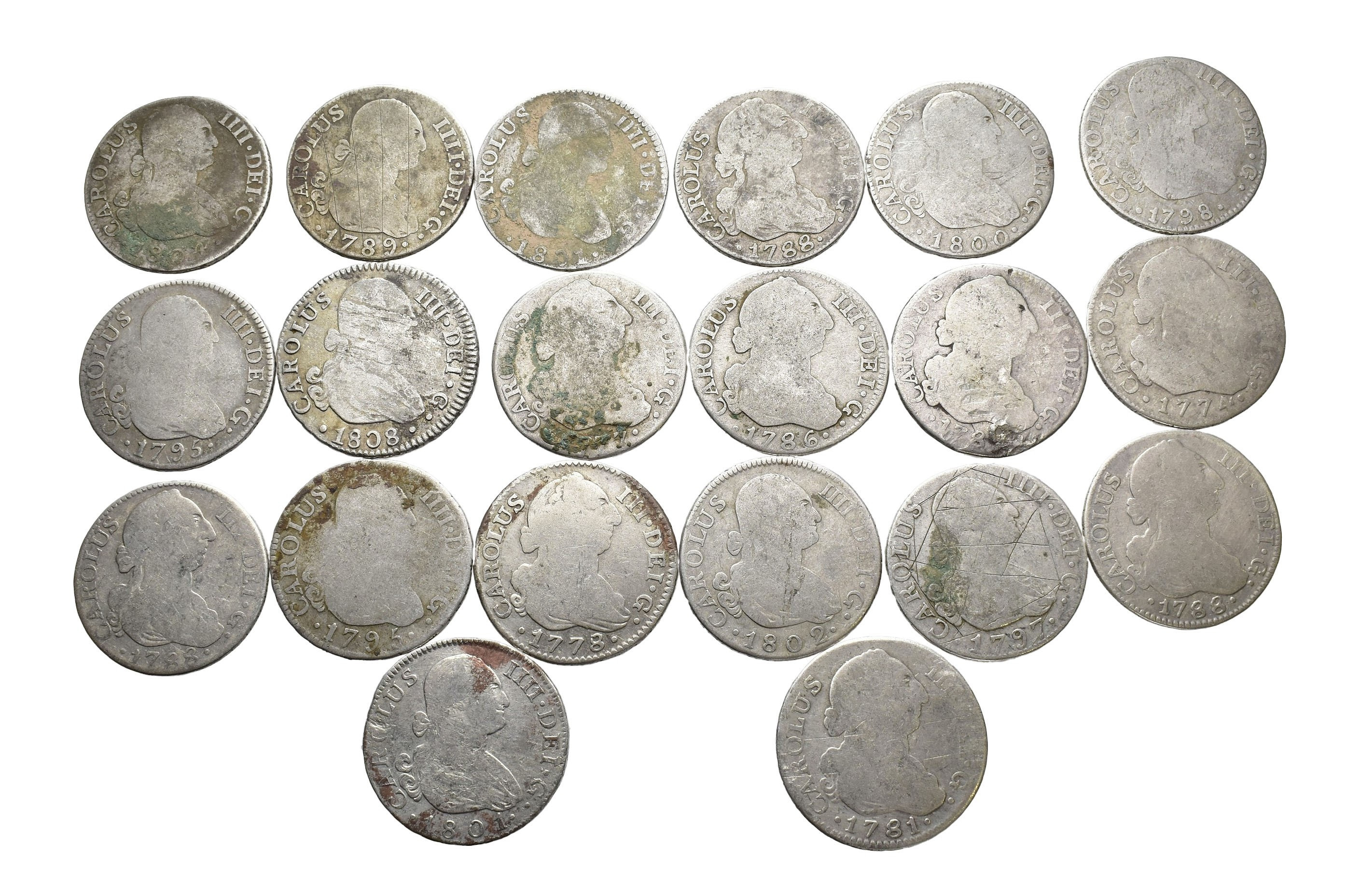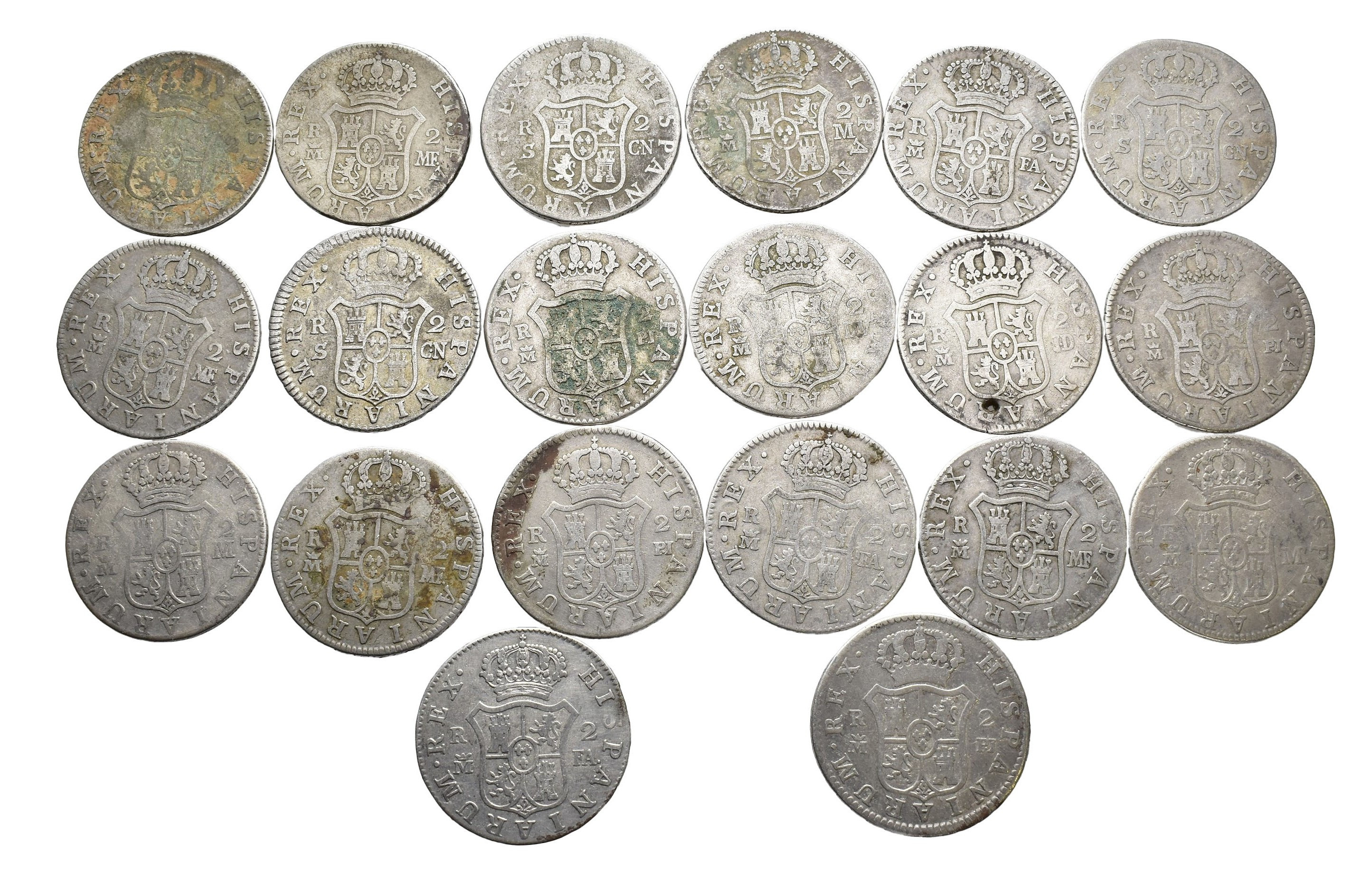 CARLOS III. Lote de 20 piezas de 2 reales, una con agujero. RC/BC+.
