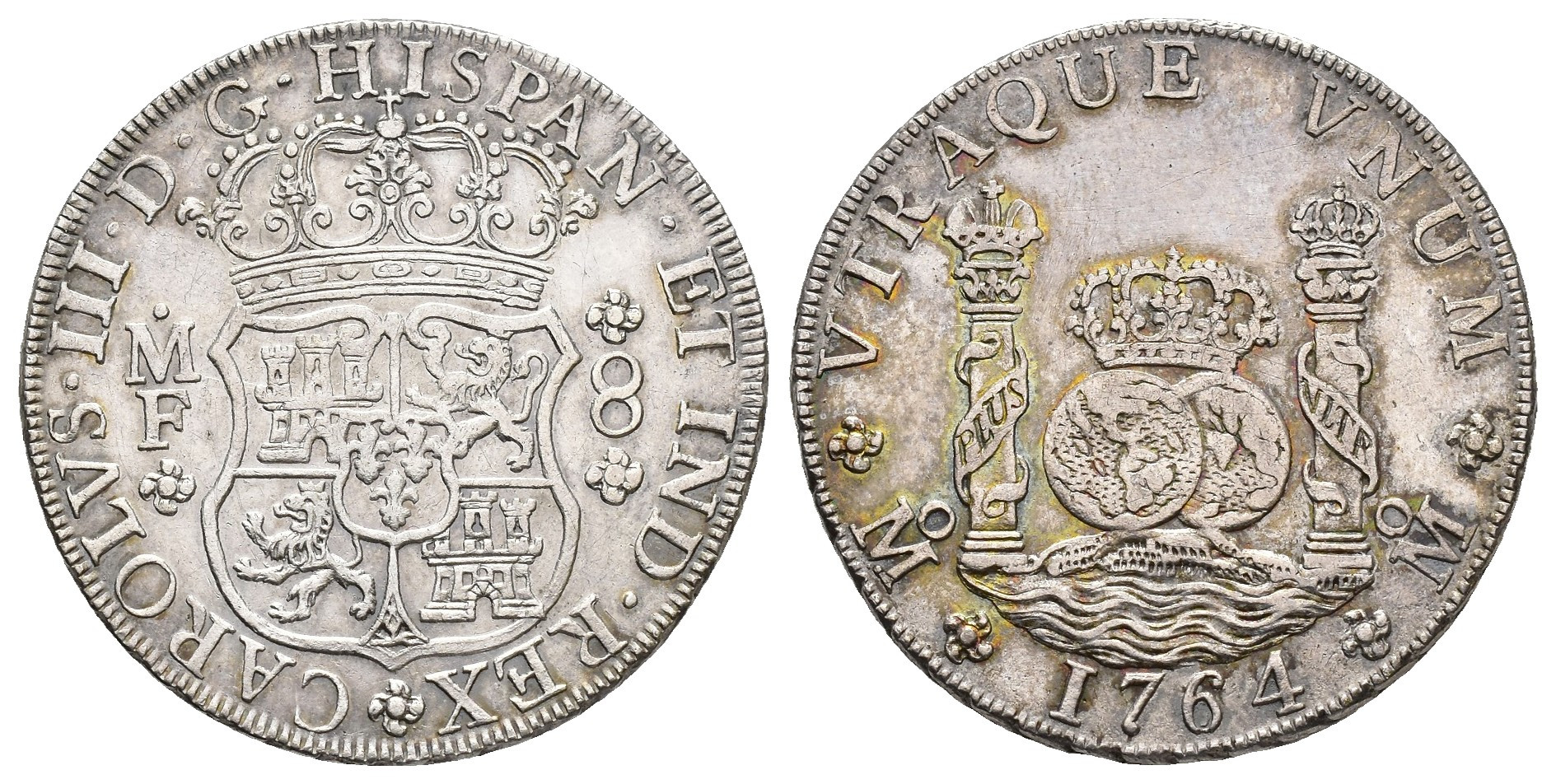 CARLOS III. 8 reales. 1764. México. MF. AR 26,75 g. 38,4 mm. VI-922; AC-1087. Leve limpieza mecánica en rev. MBC+.