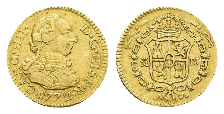 CARLOS III. 1/2 escudo. 1772. Madrid. PJ. AU 1,76 g. 14,7 mm. VI-1053; AC-1256. Golpecitos en anv. MBC.