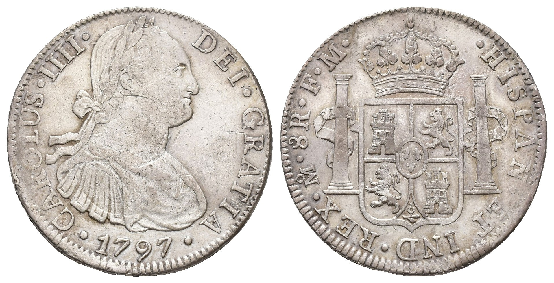 CARLOS IV. 8 reales. 1797. México. FM. AR 26,91 g. 39,6 mm. VI-793; AC-960. Rayas en rev. Acuñación incusa de parte de otra moneda en anv. MBC/MBC+.