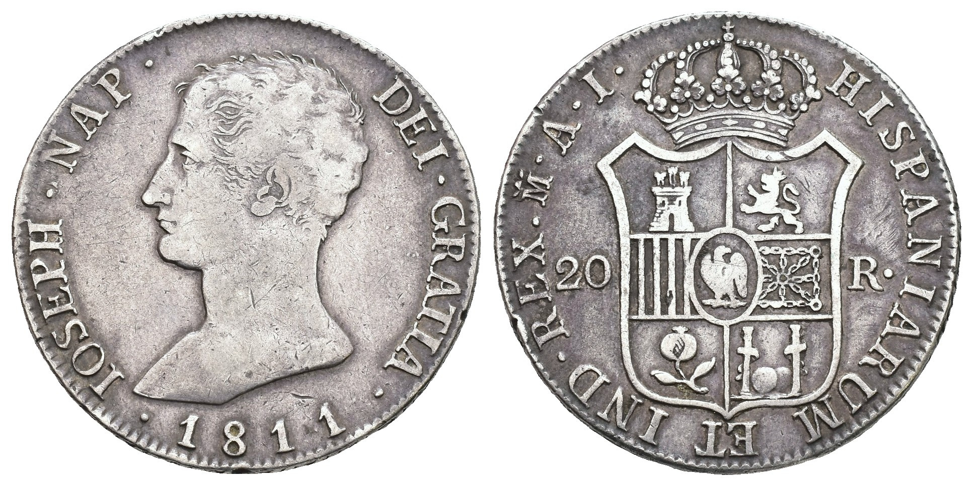 JOSÉ I BONAPARTE. 20 reales. 1811. Madrid. AI. AR 26,42 g. 39,1 mm. VI-34; AC-39. MBC/MBC-.