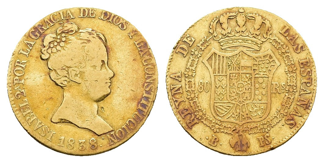 ISABEL II. 80 reales. 1838. Barcelona. PS. Ley. CONSTITUCION. AU 6,66 g. 20,8 mm. VI-578; AC-701. BC+/MBC-.