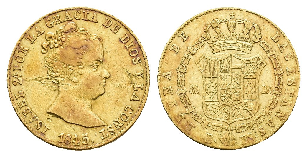 ISABEL II. 80 reales. 1845. Barcelona. PS. AU 6,75 g. 20,8 mm. VI-588; AC-713. Hojas en anv. MBC.