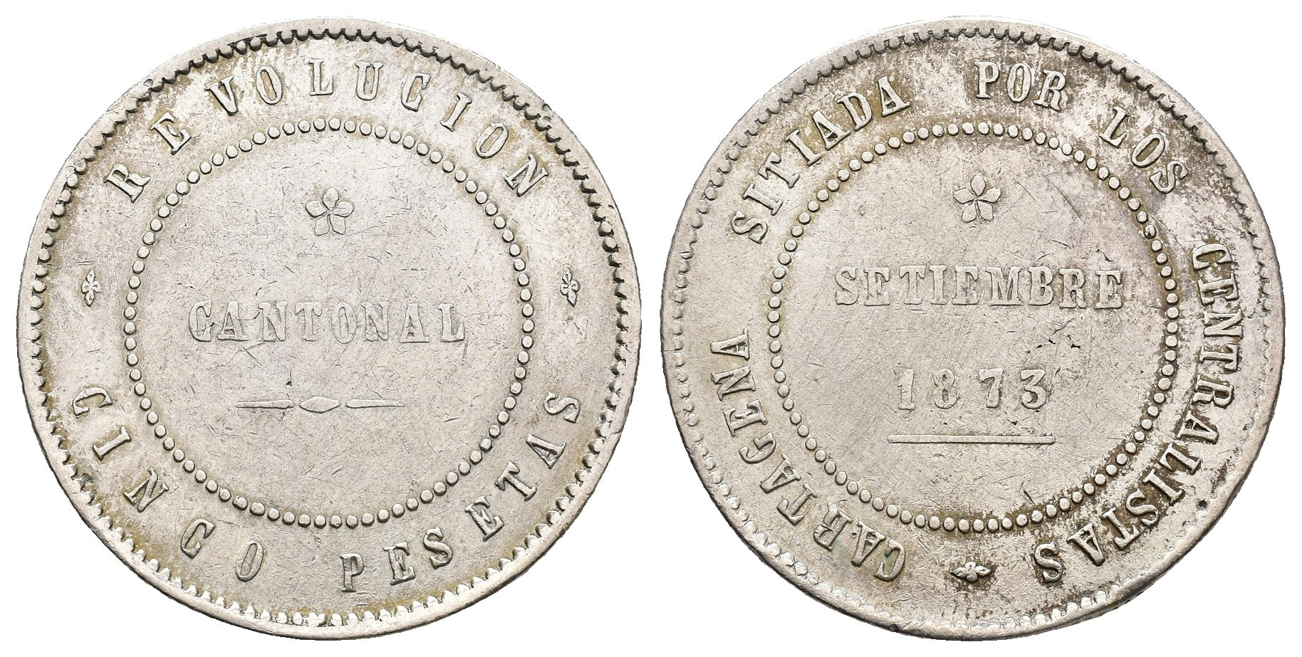 REVOLUCIÓN CANTONAL. 5 pesetas. 1873. Cartagena. No coincidente sobre eje horizontal. AR 26,87 g. 37,2 mm. VII-29. Múltiples finas rayitas. MBC-.
