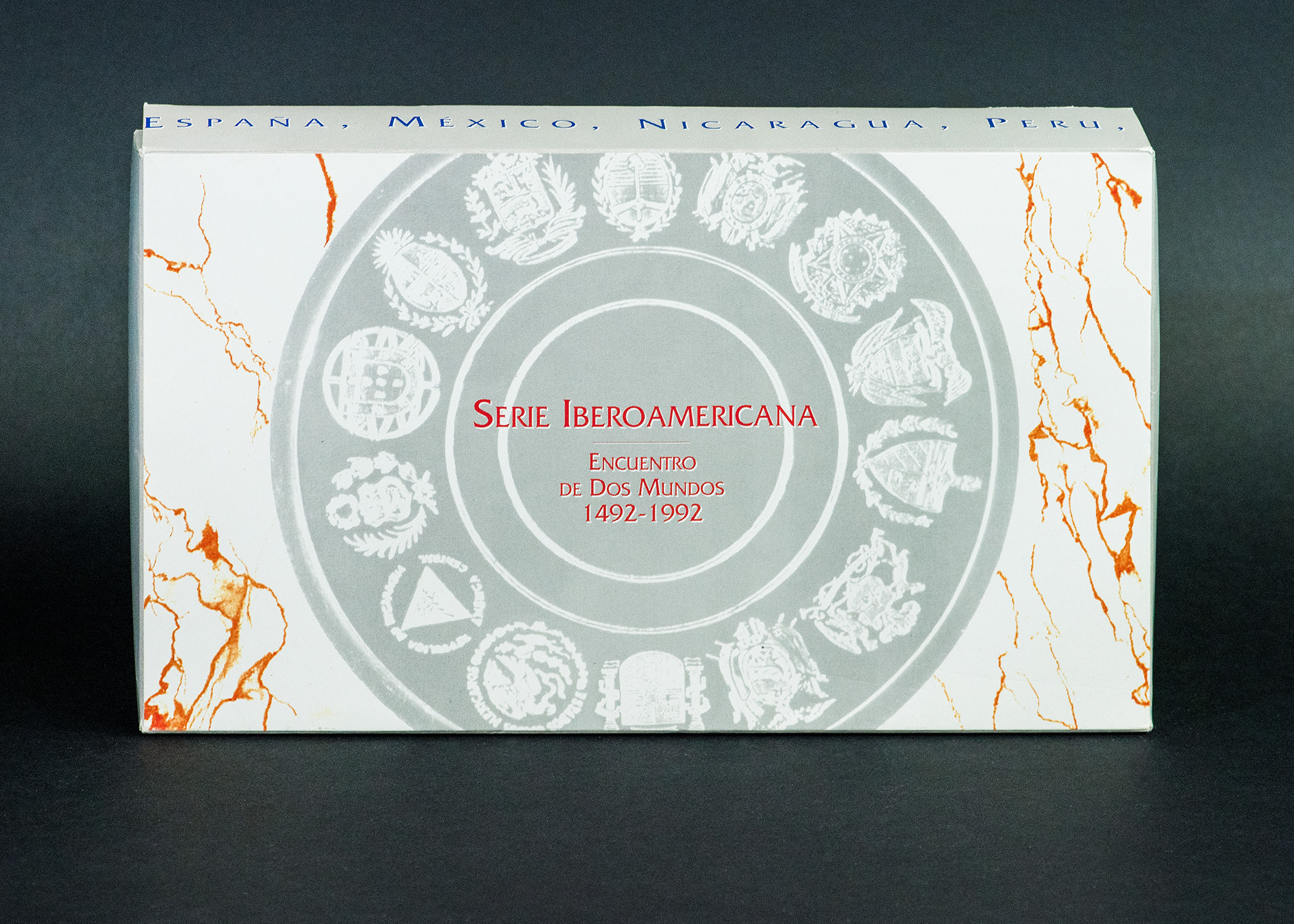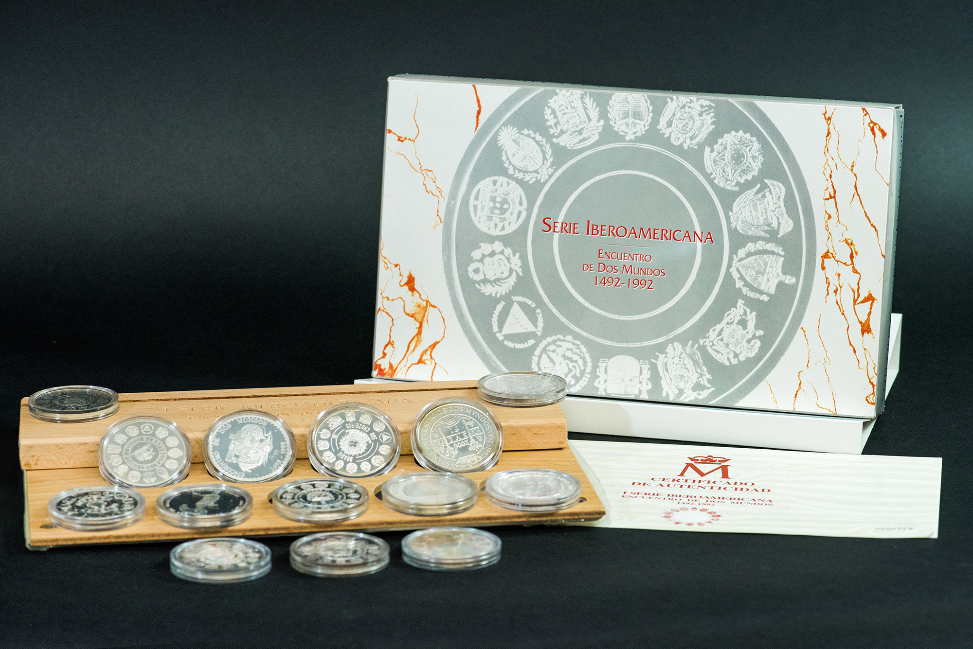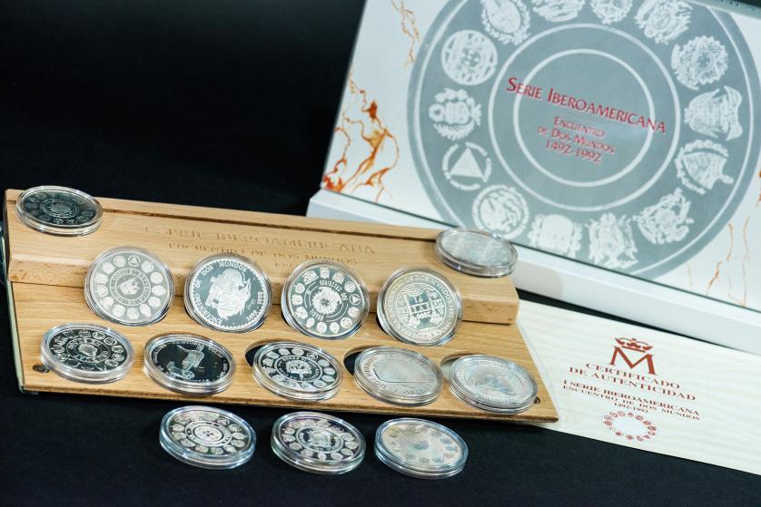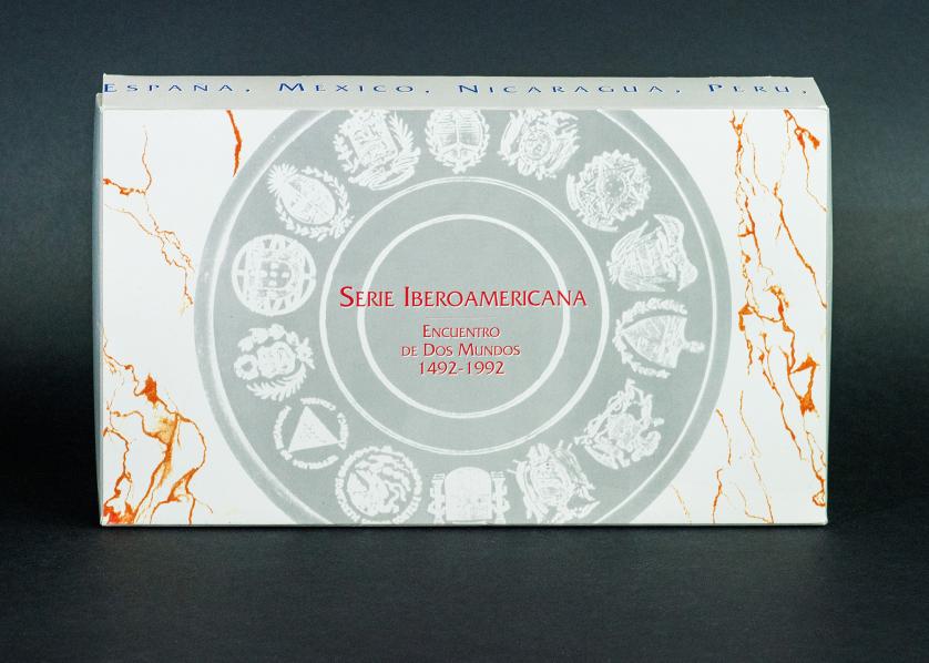 JUAN CARLOS I. Estuche FNMT: I Serie Iberoamericana Encuentro de dos mundos 1492-1992. Total: 14 piezas, AR 378 g. Prueba.