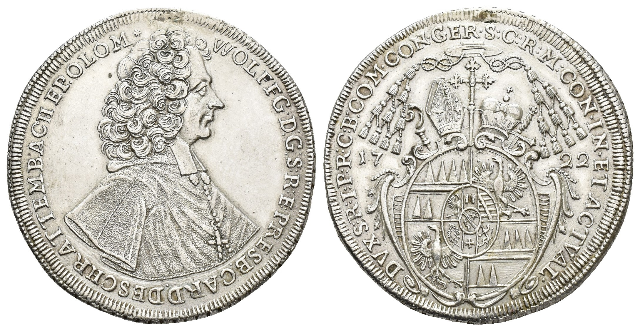 MONEDA EXTRANJERA. ALEMANIA Y ESTADOS ALEMANES. OLMUTZ. Wolfgang. Tálero. 1722. AR 28,78 g. 46 mm. Dav.-1218. Restos de soldadra a las 12 en anv. y rev. MBC+/EBC-.