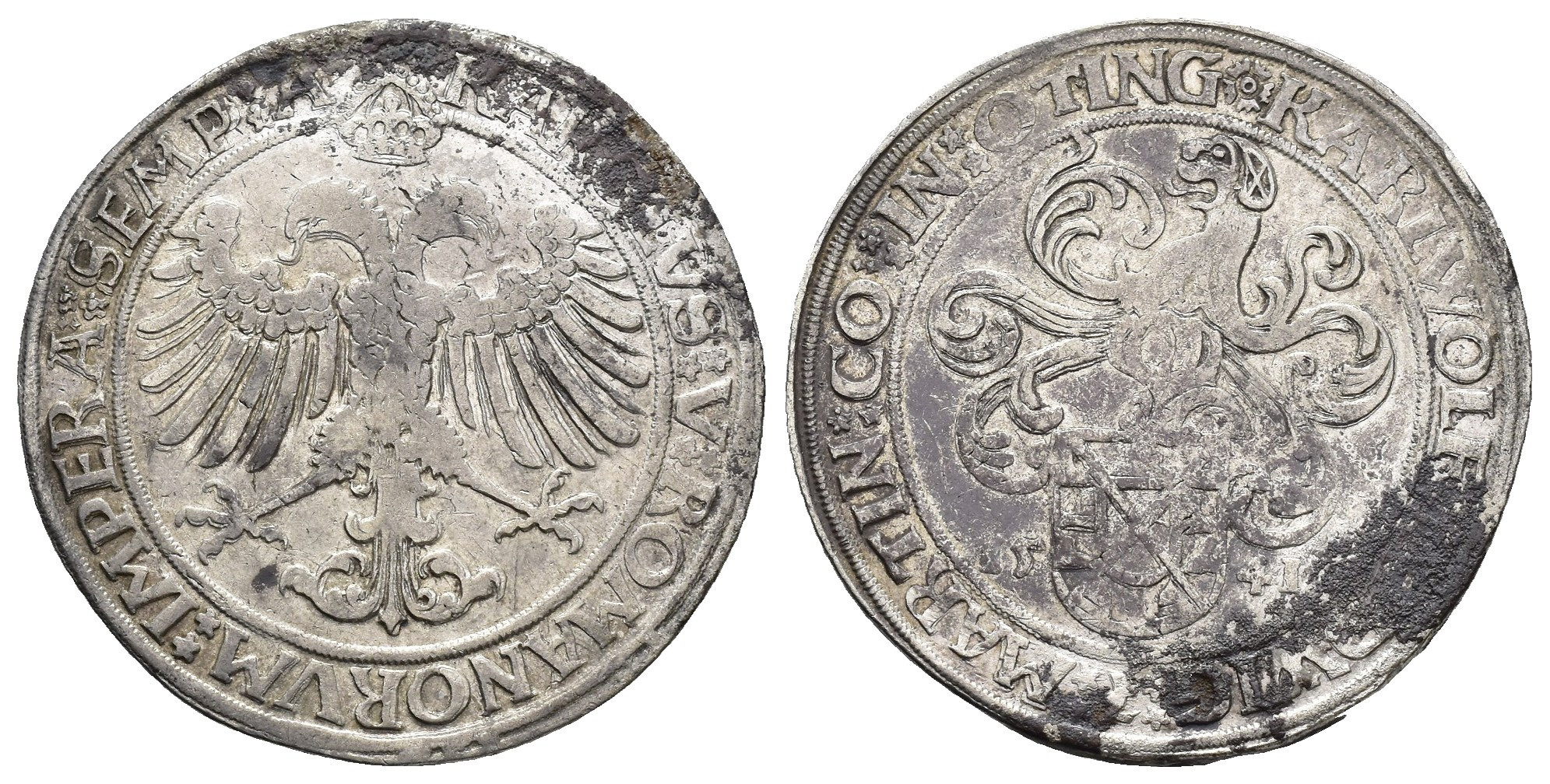MONEDA EXTRANJERA. ALEMANIA Y ESTADOS ALEMANES. OTTINGEN. Carlos V. Tálero. 1541. AR 28,93 g. 40,5 mm. Dav.-9617. Oxidaciones. MBC.
