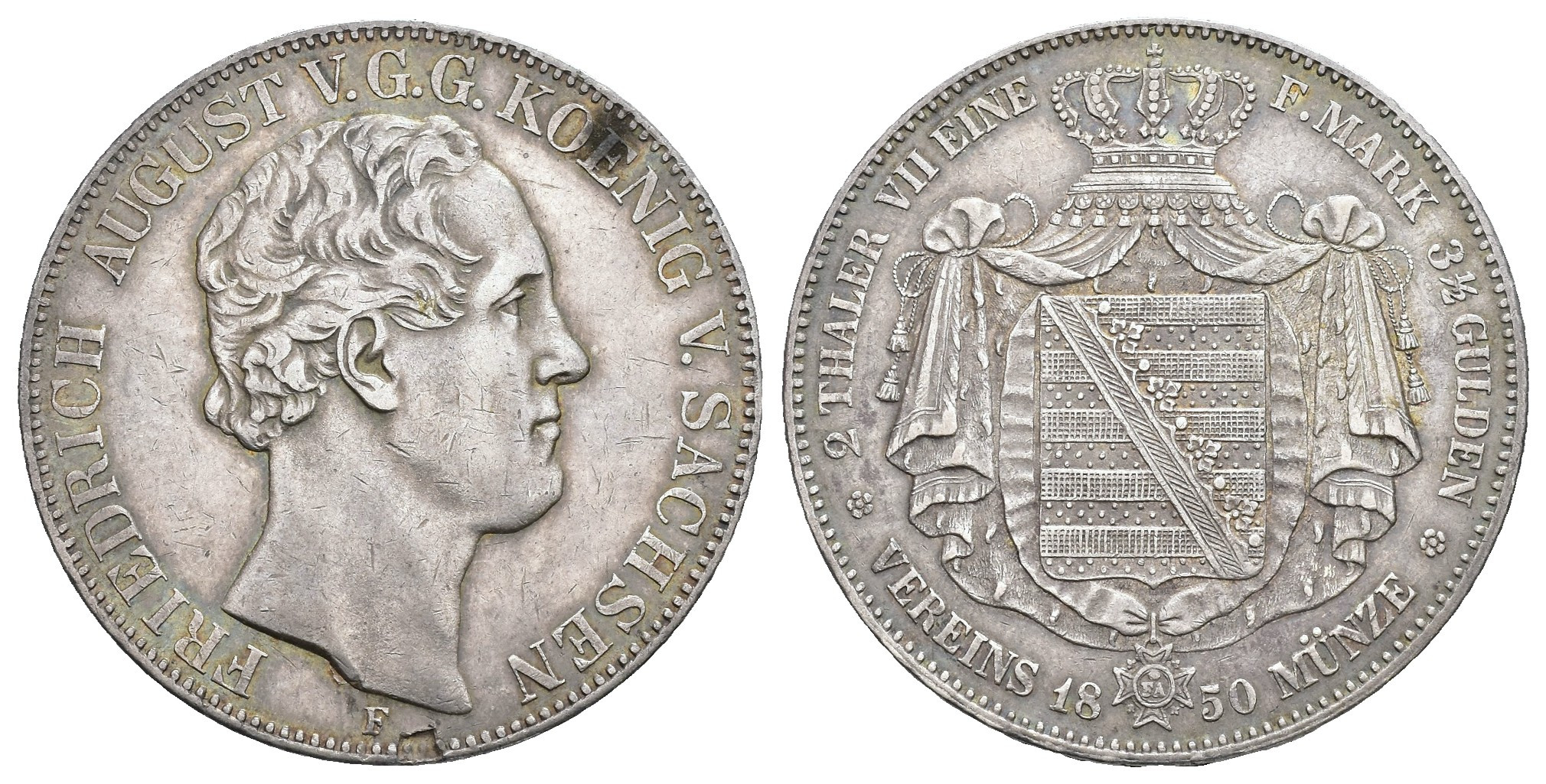 MONEDA EXTRANJERA. ALEMANIA Y ESTADOS ALEMANES. SAJONIA. Federico Augusto. Doble tálero. 1850. AR 37,12 g. 41,2 mm. KM-1149. Hojita en anv. MBC+.
