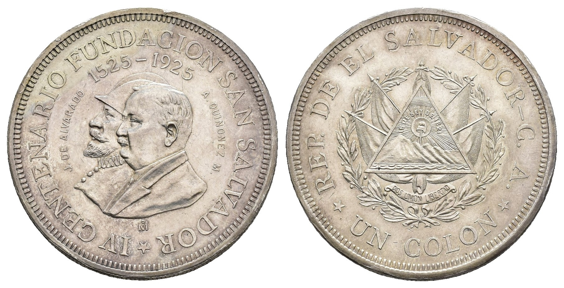 MONEDA EXTRANJERA. EL SALVADOR. Colón. 1925. IV Centenario fundación. AR 25,01 g. 37 mm. KM-131. Pequeñas marcas. EBC.