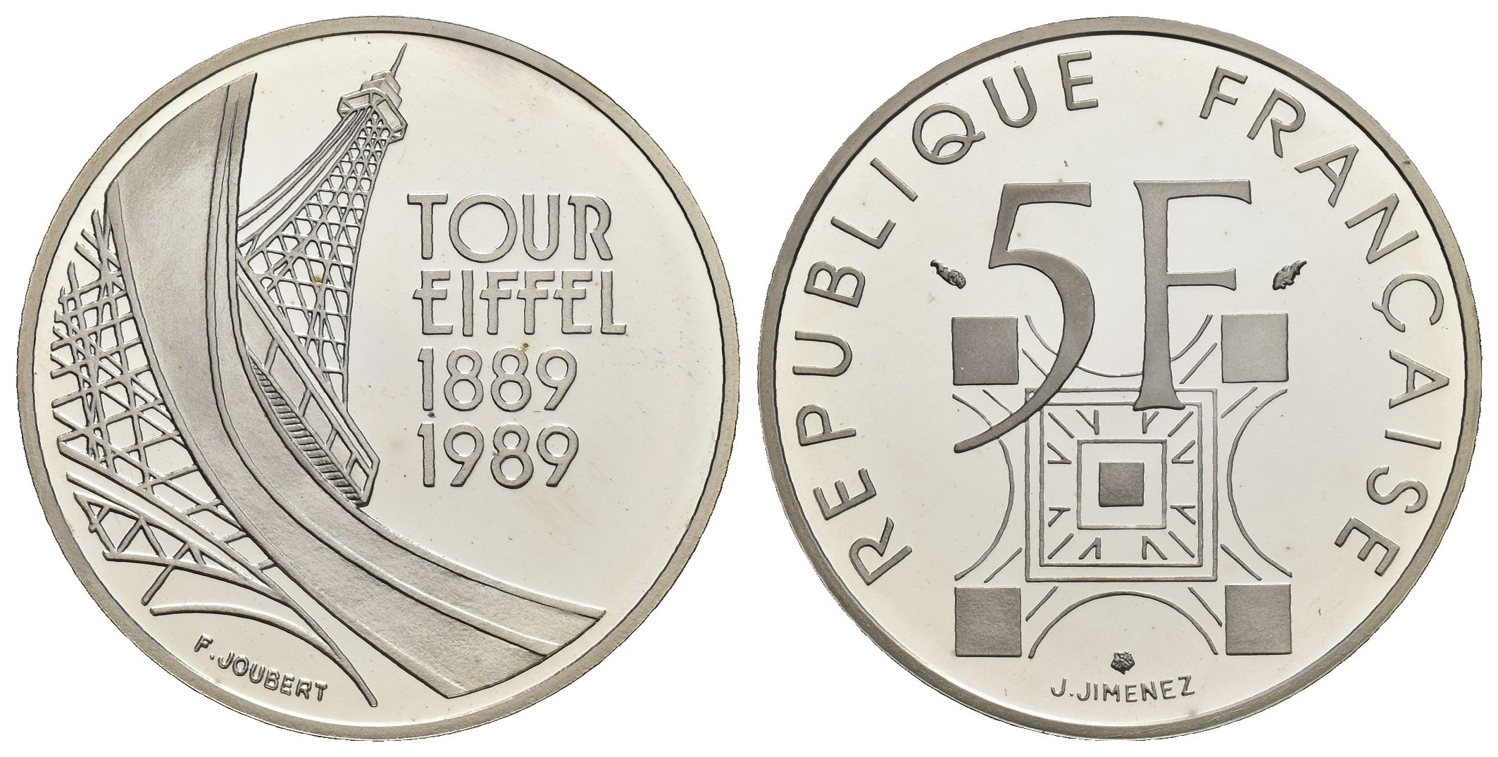 MONEDA EXTRANJERA. FRANCIA. V República. Centenario de la Torre Eiffel. 5 francos. 1989. AR 12 g. 28,85 mm. KM-968. SC. En su estuche.