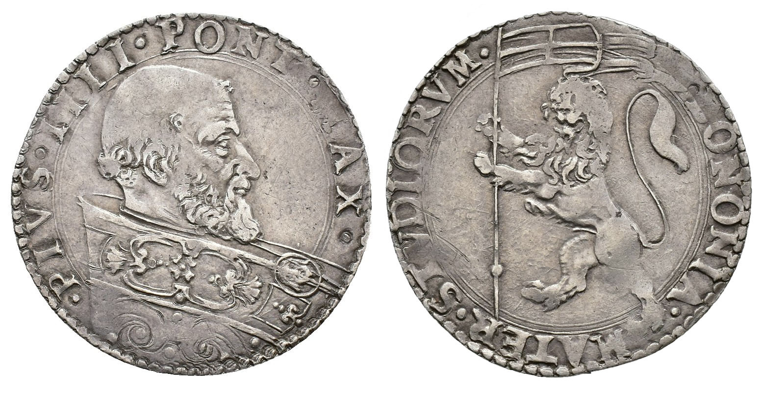 MONEDA EXTRANJERA. ITALIA Y ESTADOS ITALIANOS. ESTADOS PAPALES Y VATICANO. Pío IV (1559-1565). Bolonia. Bianco. AR 4,74 g. 29,2 mm. CNI-X-104,15. Finas rayas. MBC/MBC-.