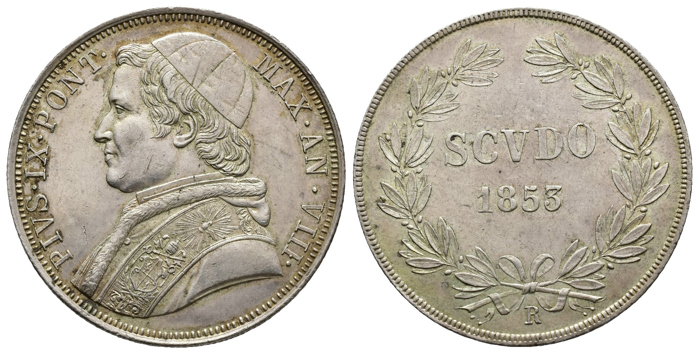 MONEDA EXTRANJERA. ITALIA Y ESTADOS ITALIANOS. ESTADOS PAPALES Y VATICANO. Pío IX. Escudo. 1853. Año VIII-R. AR 26,9 g. 37,4 mm. KM-1336.2. Rayitas. EBC-/MBC+.