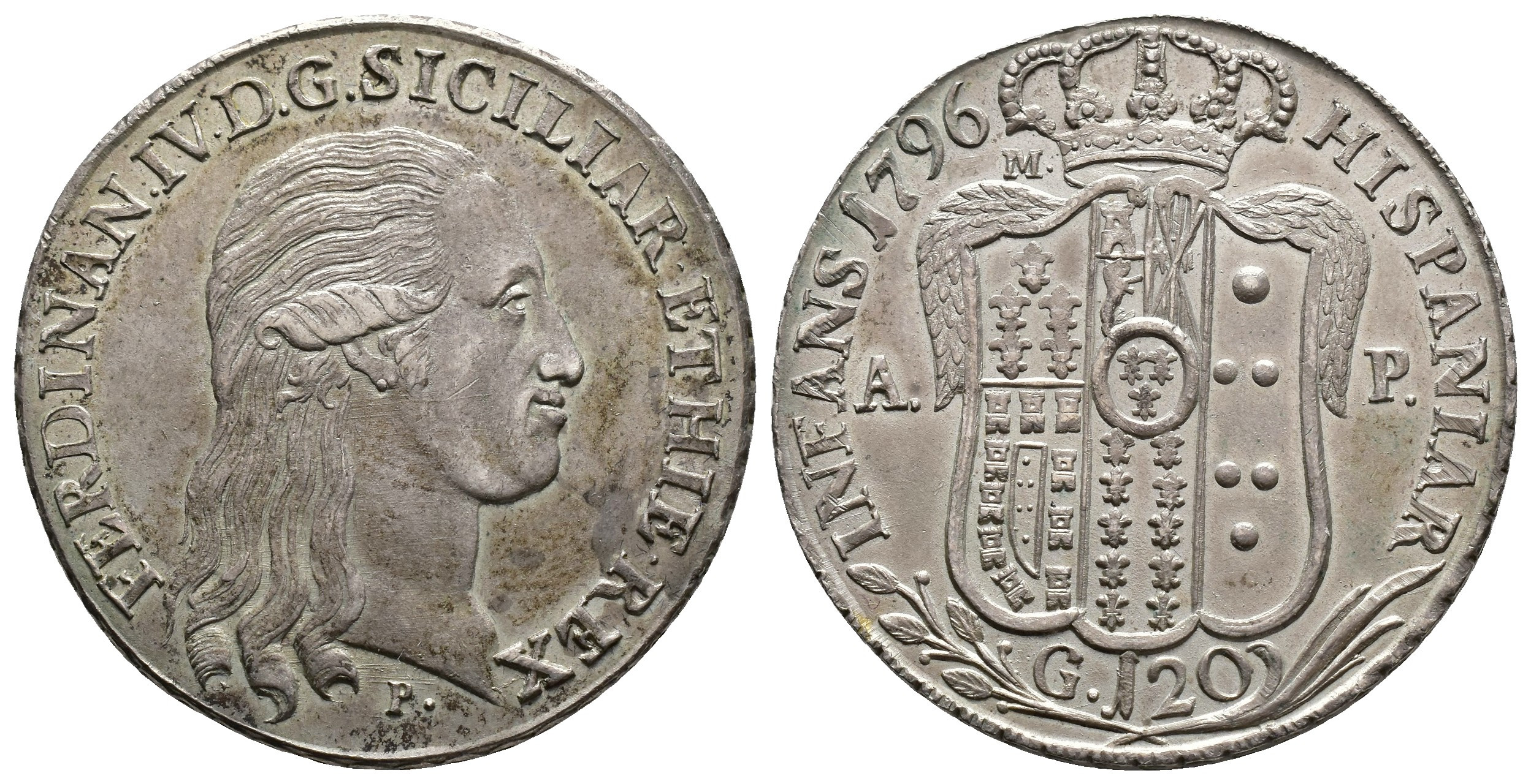 MONEDA EXTRANJERA. ITALIA Y ESTADOS ITALIANOS. REINO DE NÁPOLES. Fernando IV. Nápoles. 120 granos. 1796. A-P. AR 27,64 g. 40 mm. P.R. 62. Pequeñas marcas. EBC-/EBC.