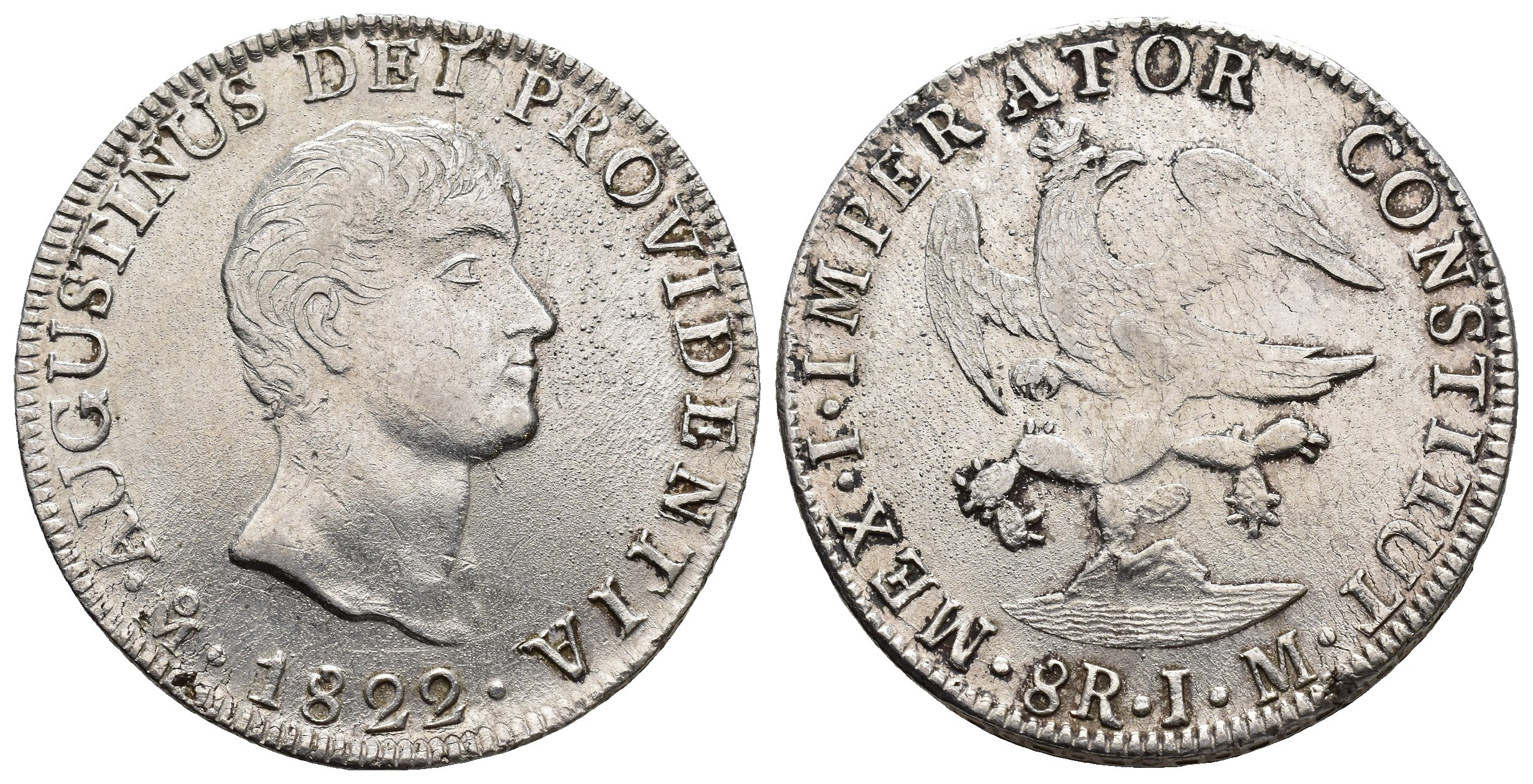 MONEDA EXTRANJERA. MÉXICO. Agustín de Iturbide. 8 reales. 1822. JM. "AUGUSTINUS". AR 27 g. 39,3 mm. KM-310. Oxidaciones limpiadas. MBC+.
