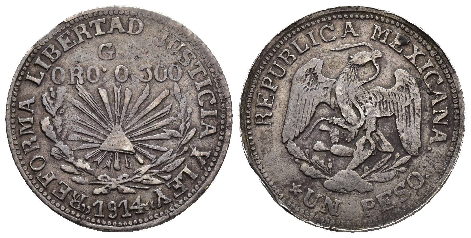 MONEDA EXTRANJERA. MÉXICO. Peso. 1914. Guerrero. Gorro frigio. AR 12,97 g. 30,2 mm. KM-641. Defecto de cospel en canto. MBC.