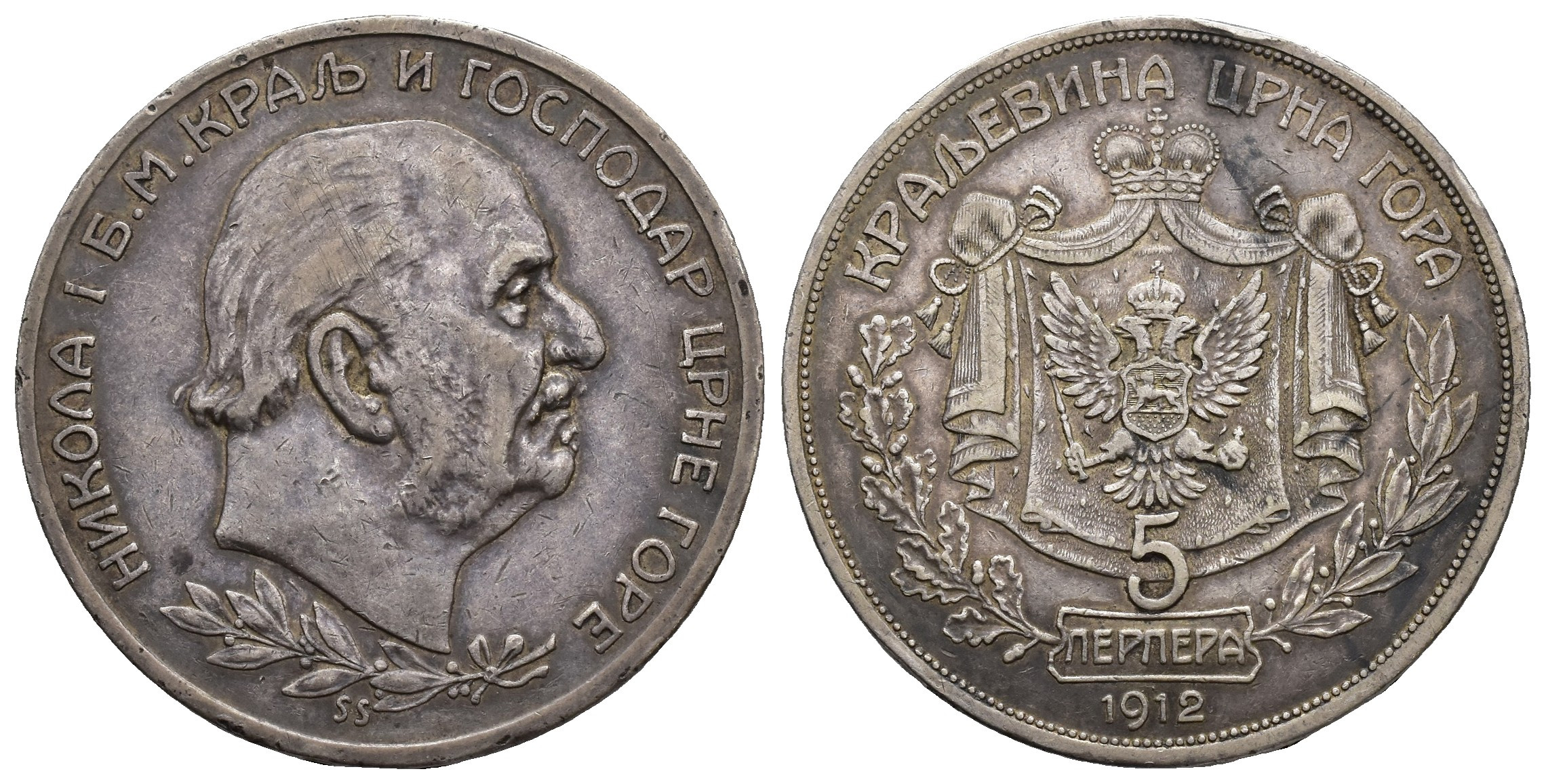MONEDA EXTRANJERA. MONTENEGRO. Nicolás I. 5 Perpera. 1912. AR 23,9 g. 35,8 mm. KM-15. Finas rayitas en anv. MBC.