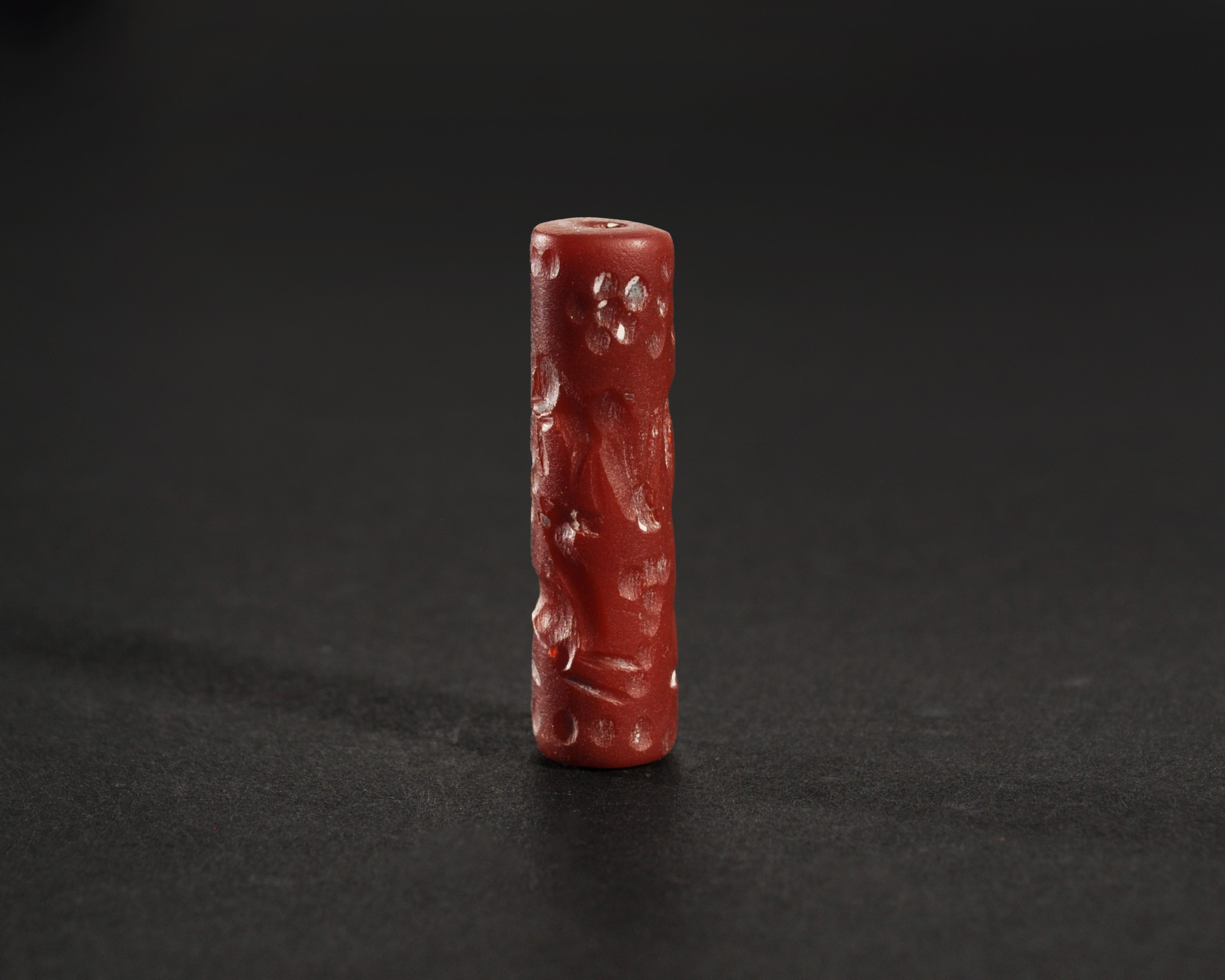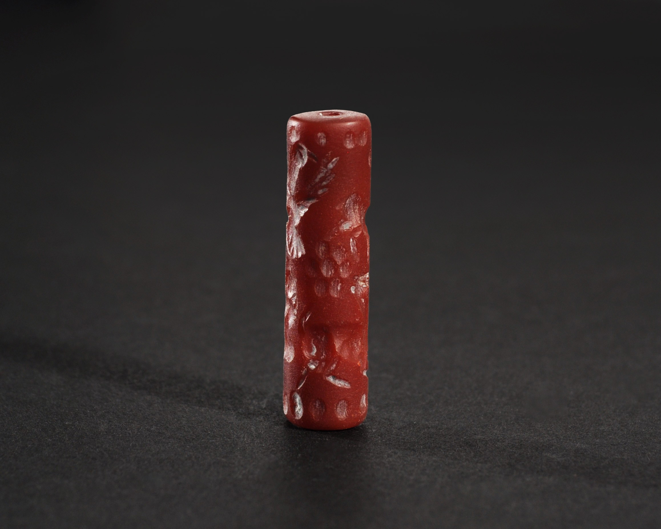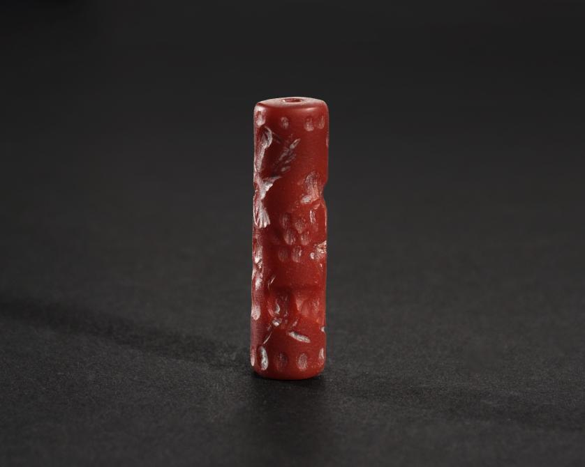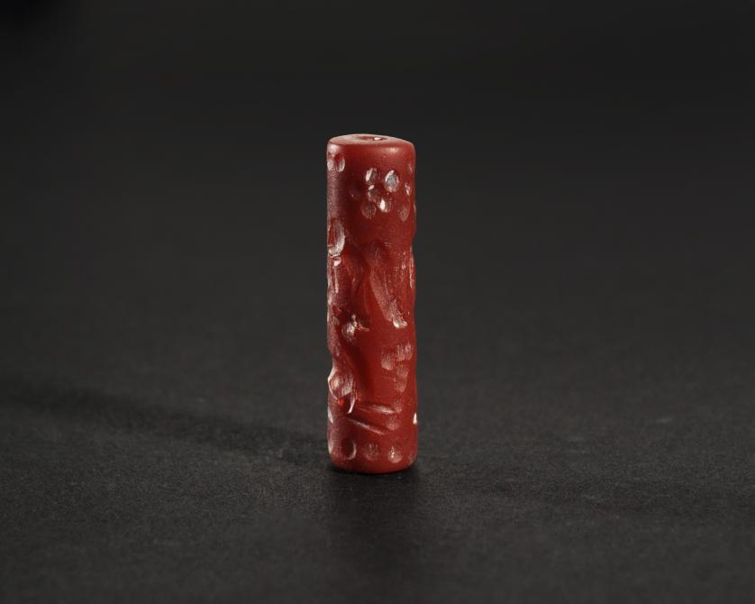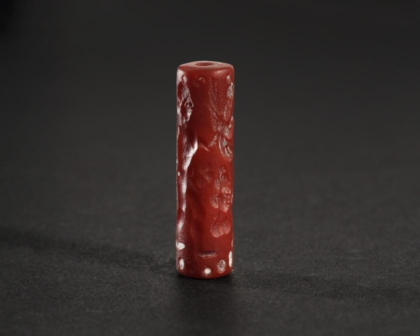 ARQUEOLOGÍA. PRÓXIMO ORIENTE. Mesopotamia. Sello cilíndrico con representación de figura, busto, ave y dos animales cuadrúpedos (II-I milenio a.C.). Cornalina. Longitud 3,6 cm.
