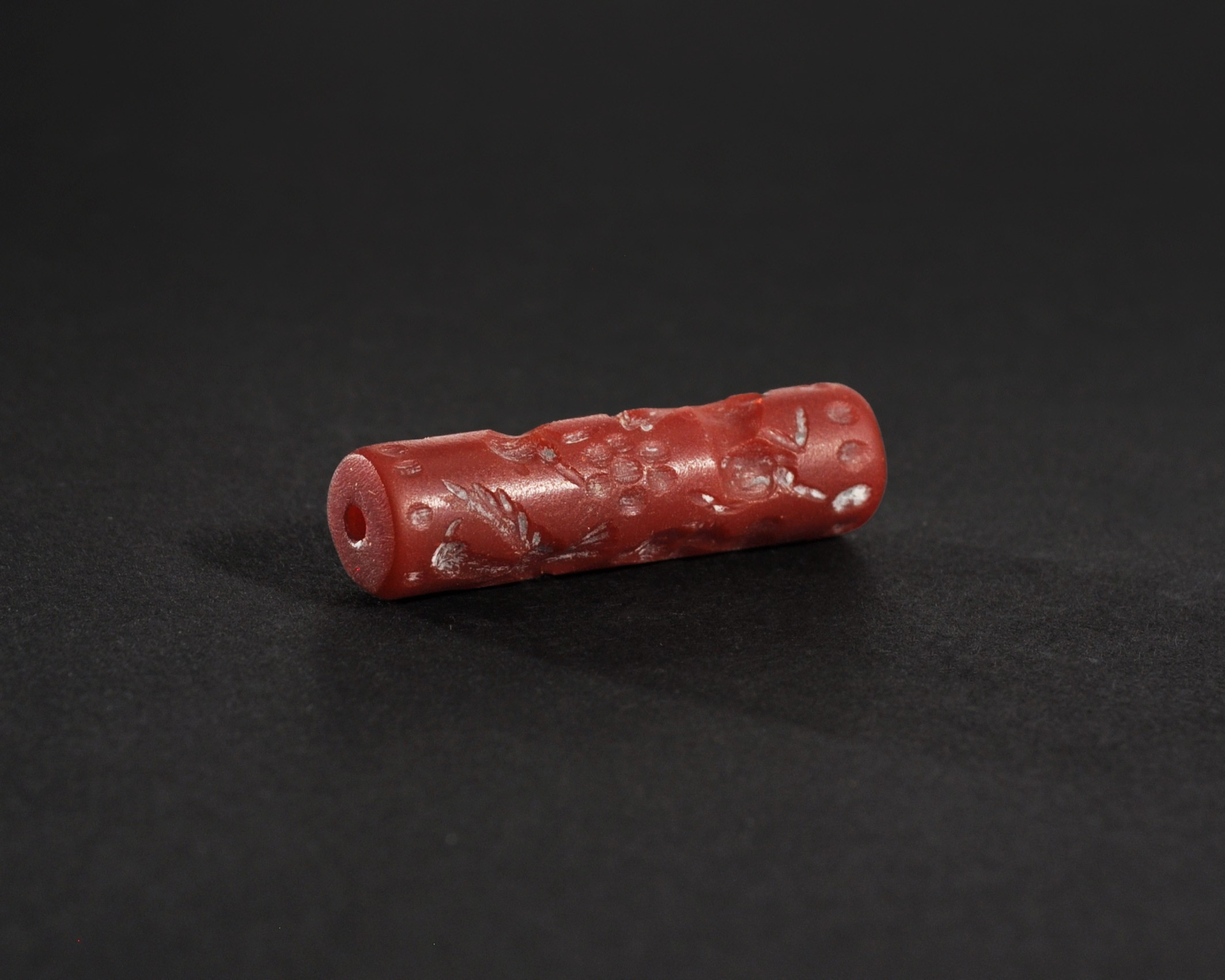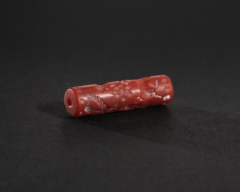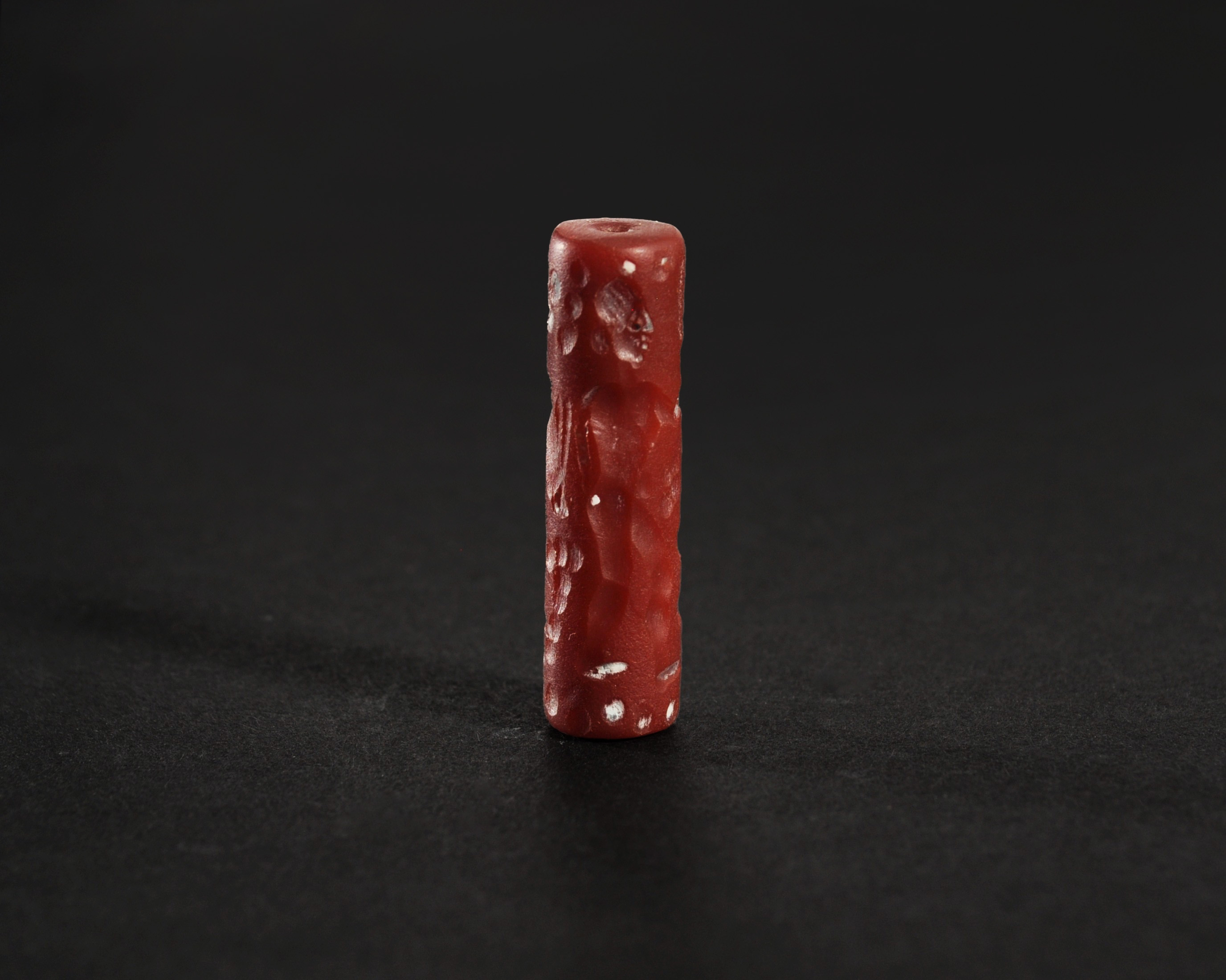 ARQUEOLOGÍA. PRÓXIMO ORIENTE. Mesopotamia. Sello cilíndrico con representación de figura, busto, ave y dos animales cuadrúpedos (II-I milenio a.C.). Cornalina. Longitud 3,6 cm.