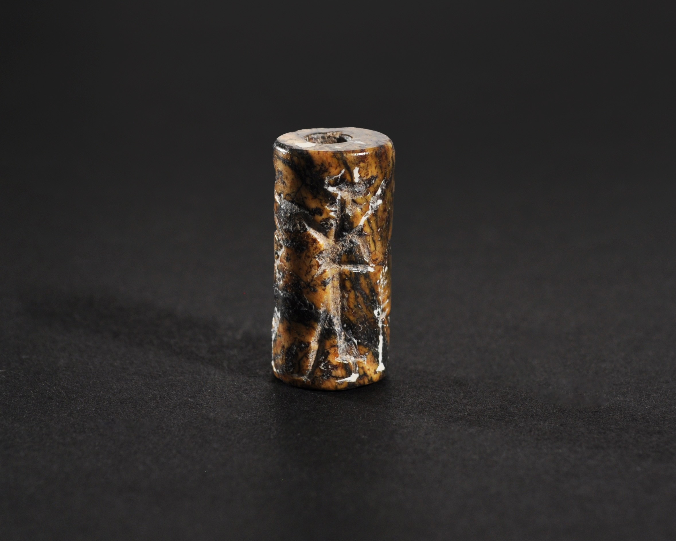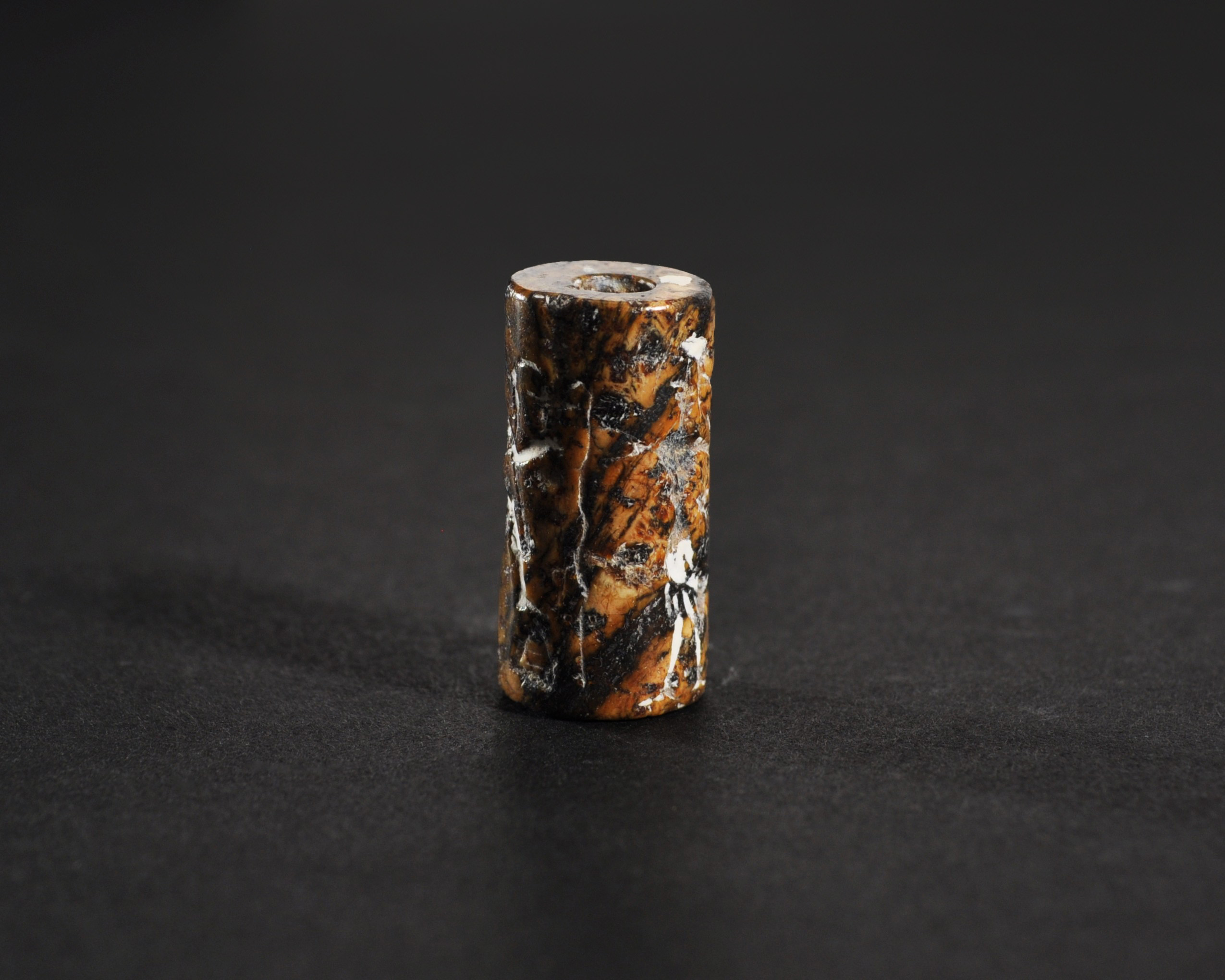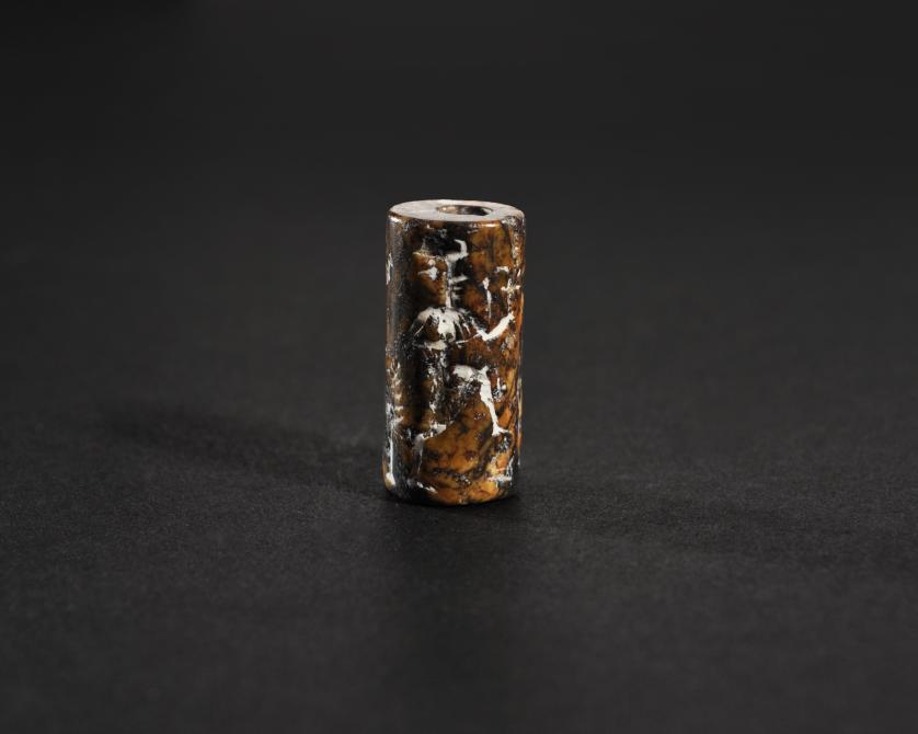 ARQUEOLOGÍA. PRÓXIMO ORIENTE. Mesopotamia. Sello cilíndrico con representación de tres personajes (II-I milenio a.C.). Piedra. Longitud 2,5 cm.