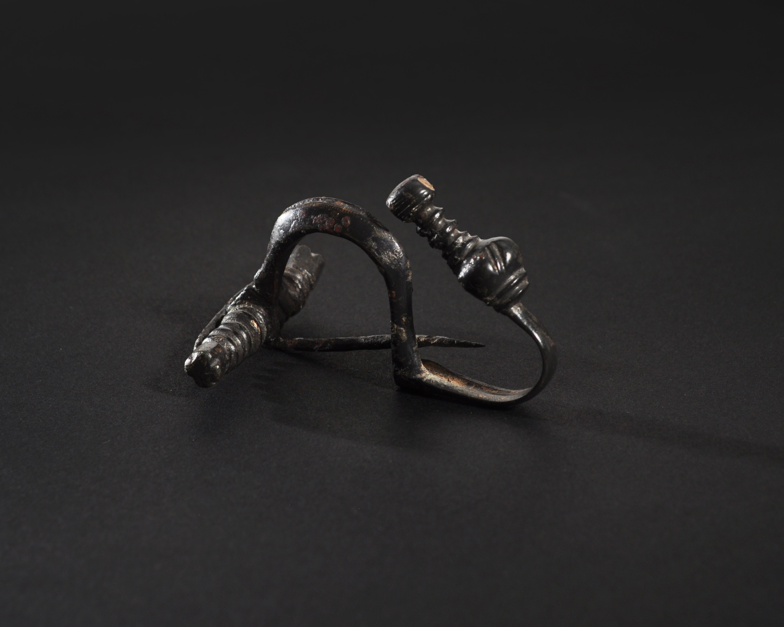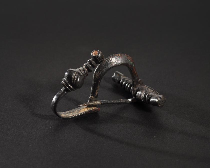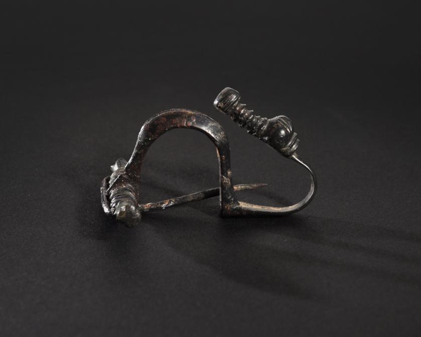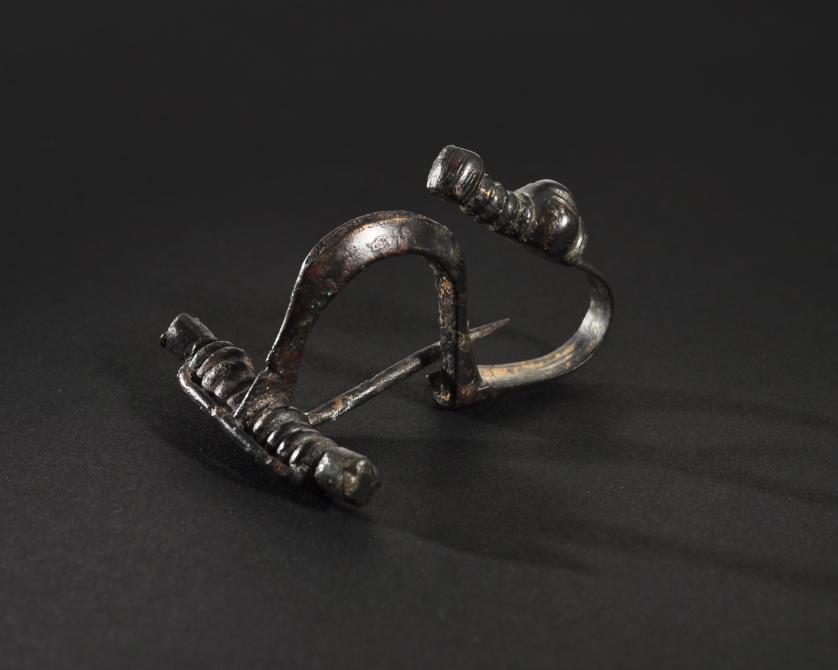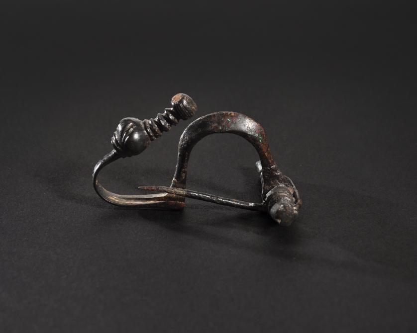 ARQUEOLOGÍA. HISPANIA ANTIGUA. Cultura celtibérica. Fíbula de pie vuelto con esquema de La Tène I (ss. IV-III a.C.). Bronce. Longitud 6,5 cm.