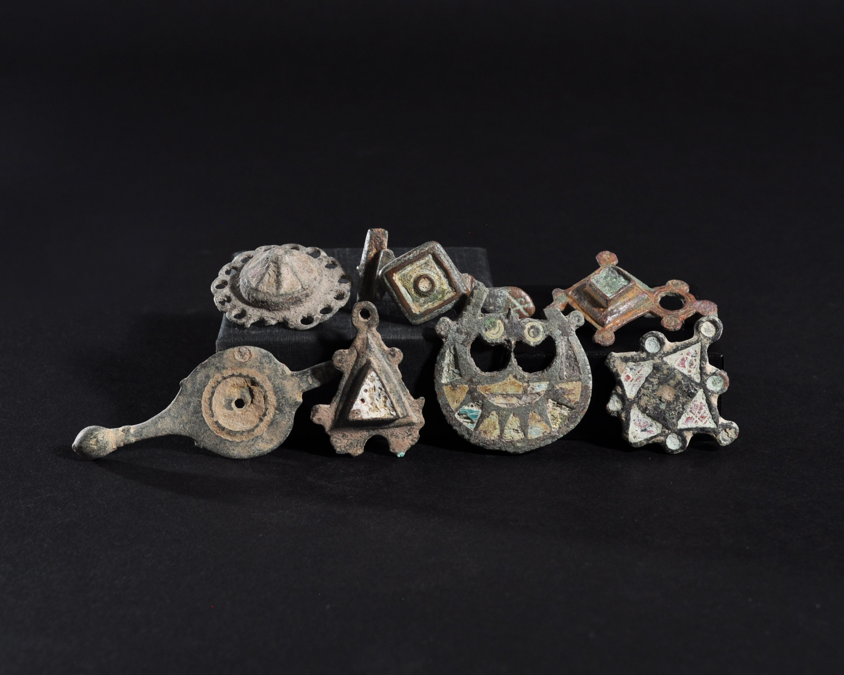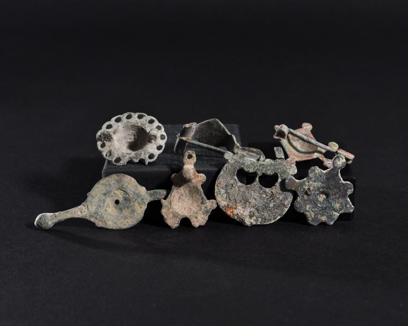 ARQUEOLOGÍA. ROMA. Lote de 7 fíbulas y apliques (ss. I-IV d.C.). Bronce y esmalte. Longitud de 2,9 a 5,8 cm.