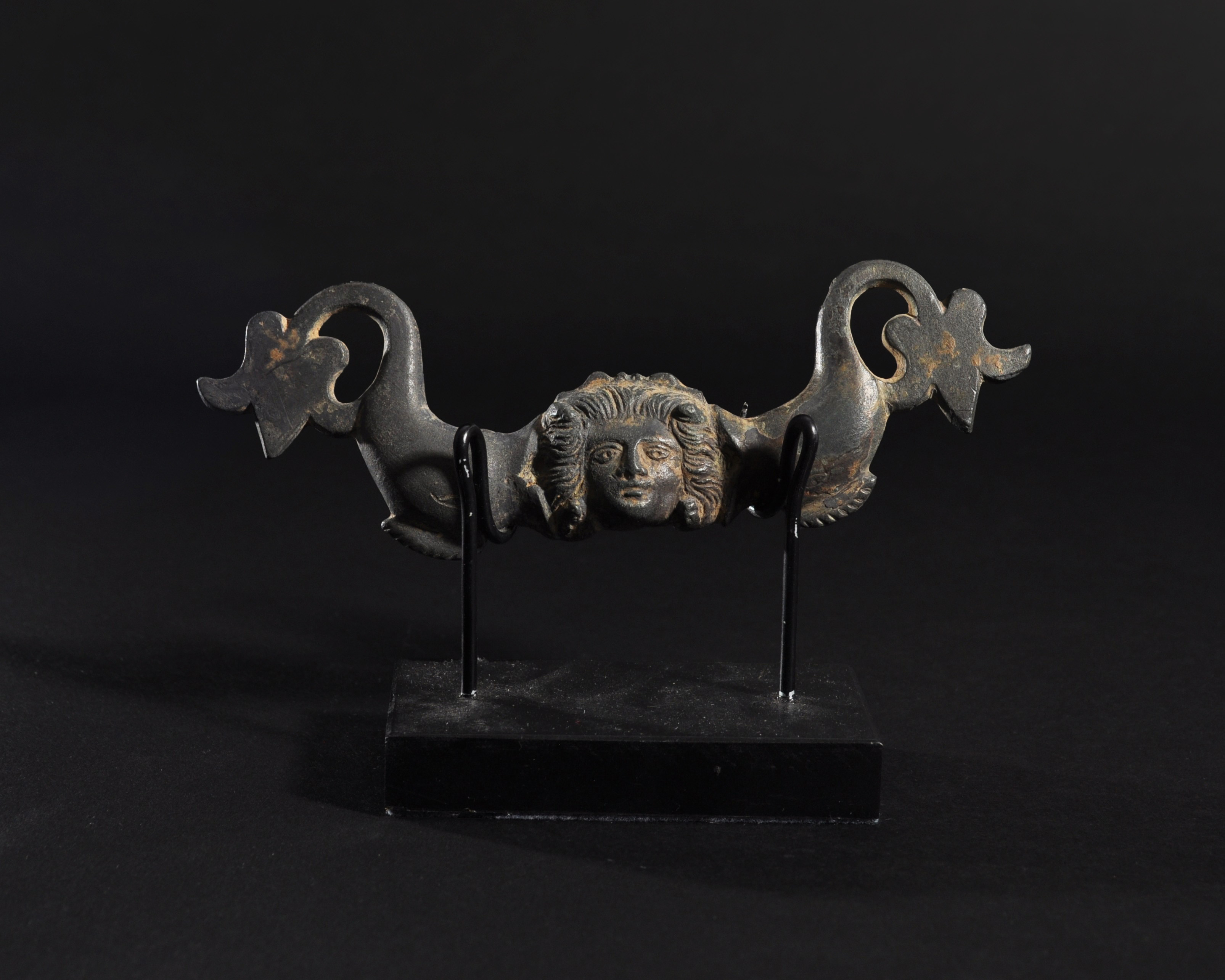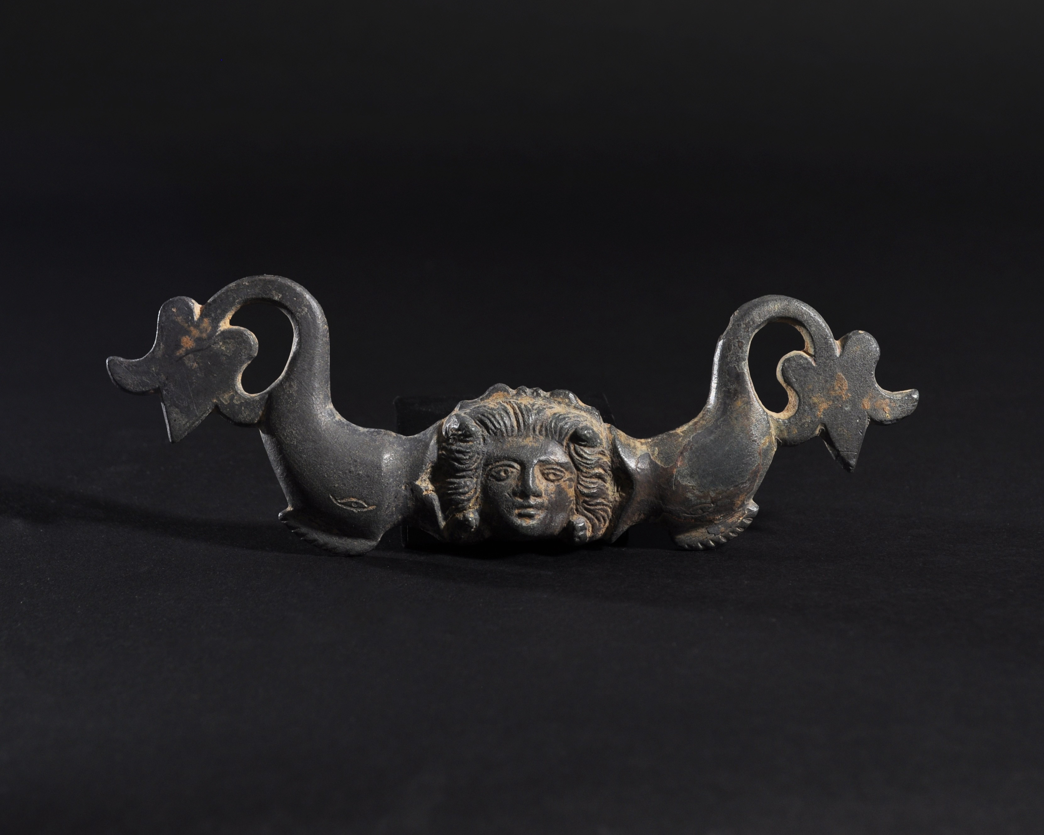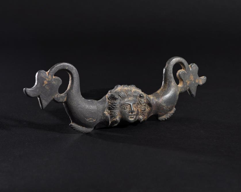ARQUEOLOGÍA. ROMA. Aplique con representación de Medusa y delfines (ss. I-III d.C.). Bronce. Longitud 16,1 cm.