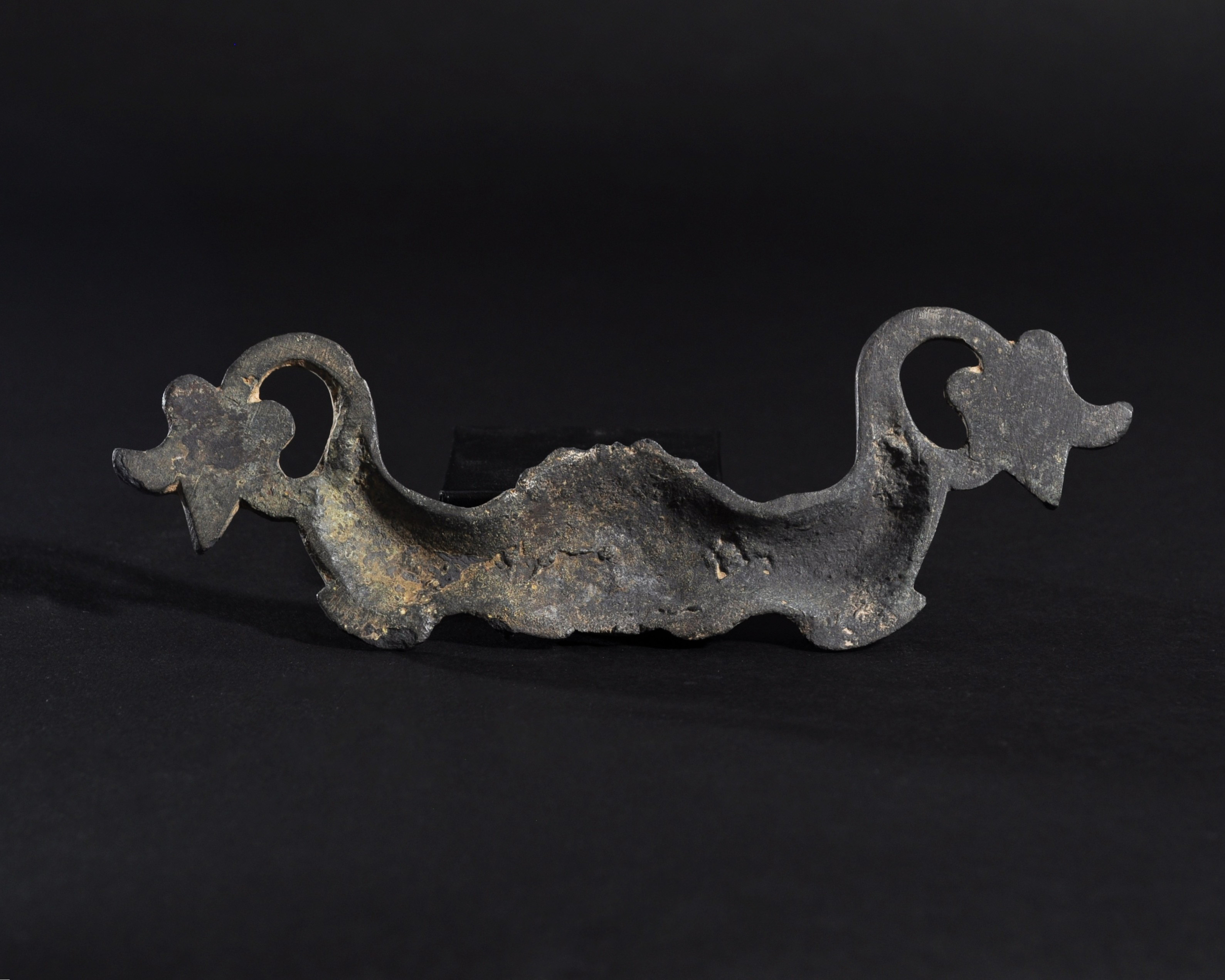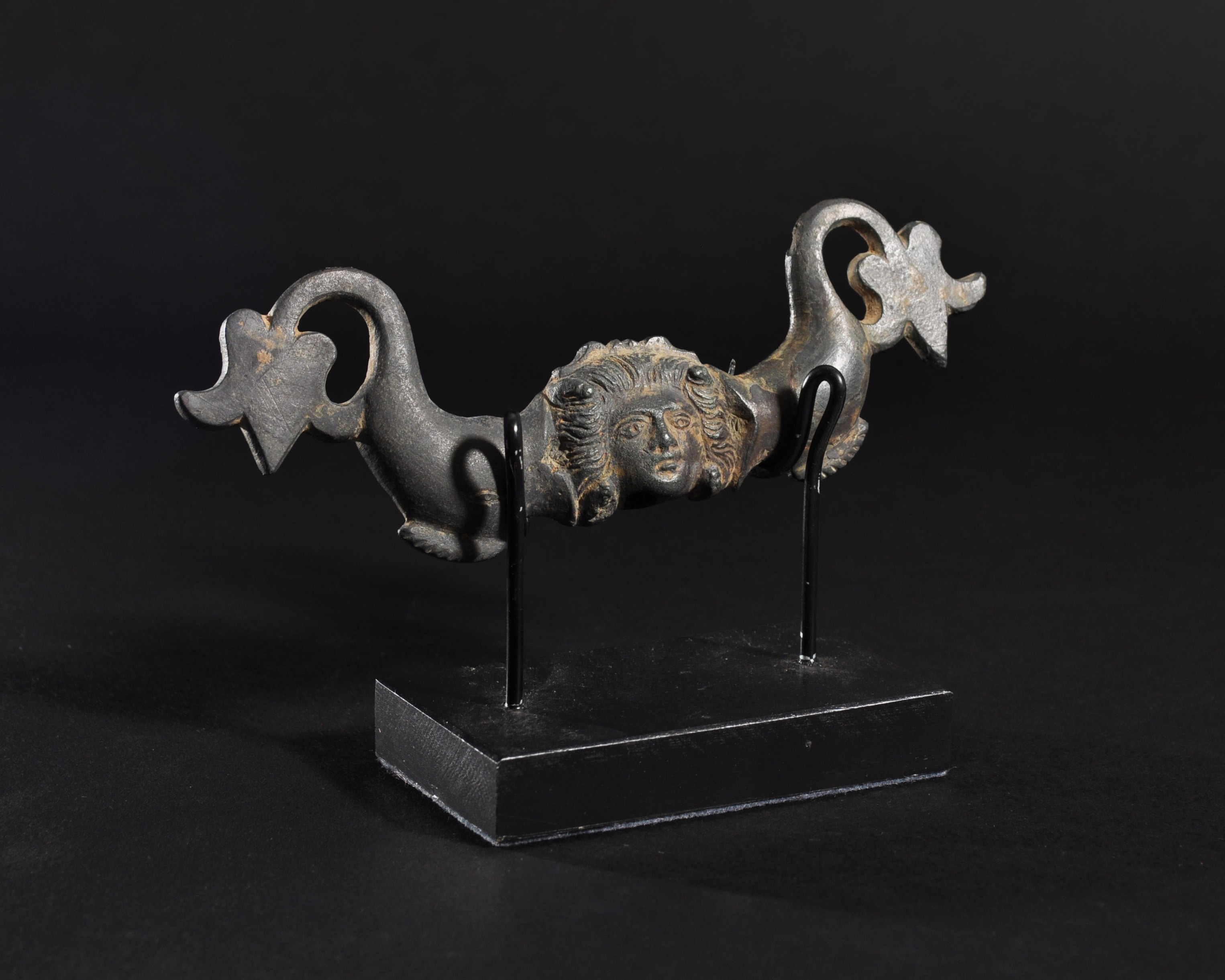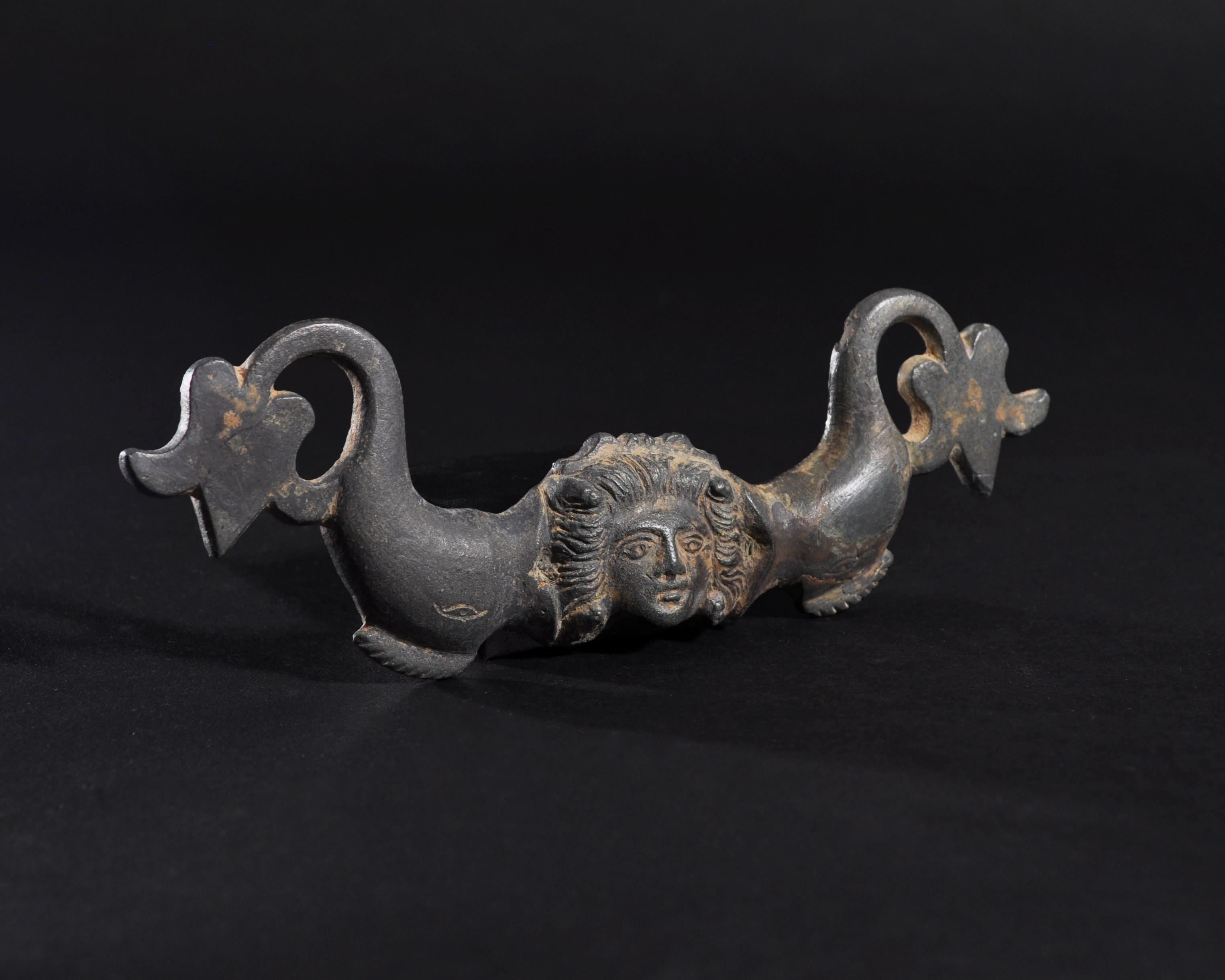 ARQUEOLOGÍA. ROMA. Aplique con representación de Medusa y delfines (ss. I-III d.C.). Bronce. Longitud 16,1 cm.