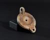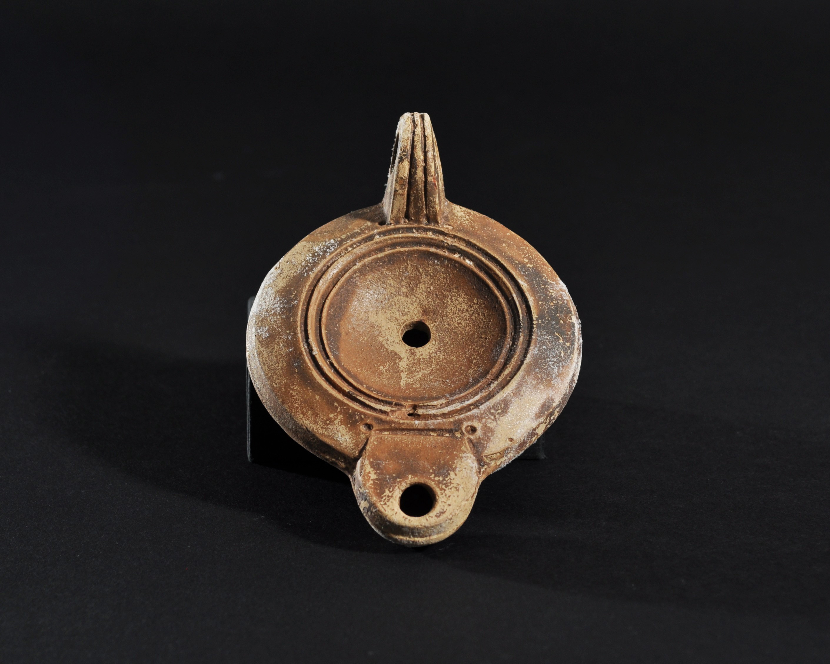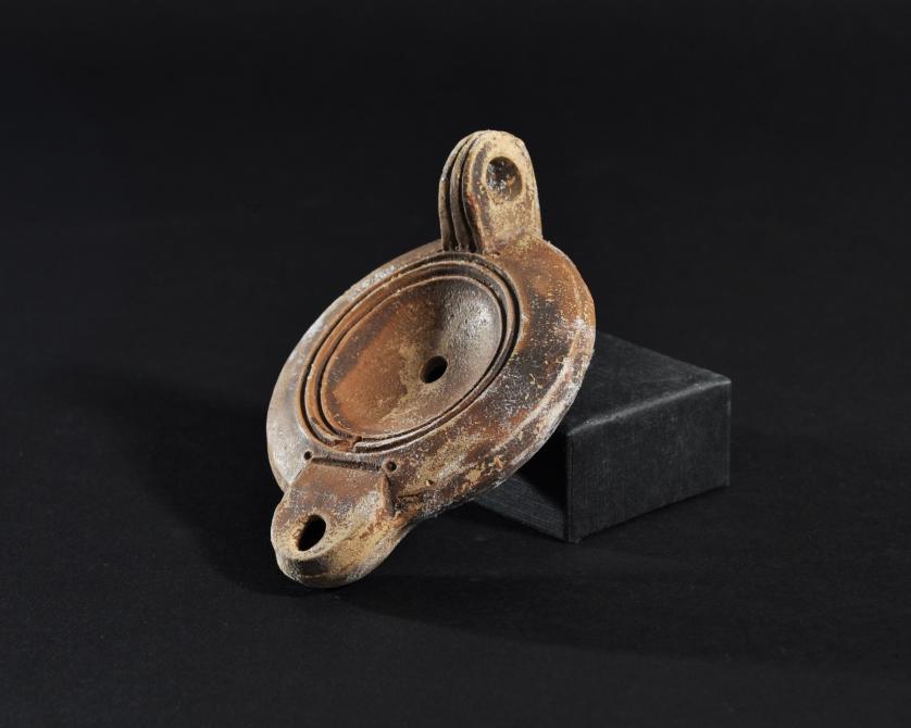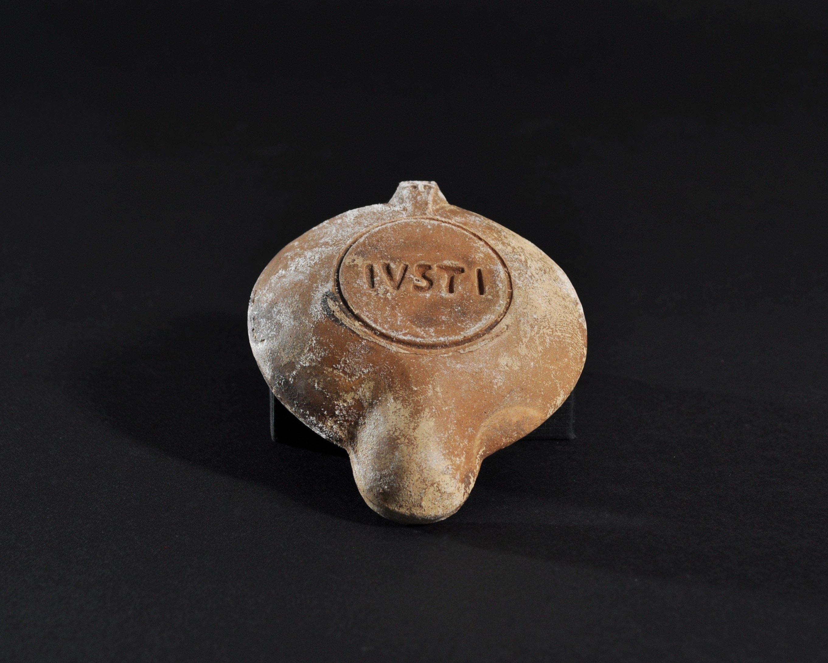 ARQUEOLOGÍA. ROMA. Lucerna con decoración de círculos concéntricos y marca de alfarero IVSTI (ss. I-II d.C.). Terracota. Longitud 10 cm.