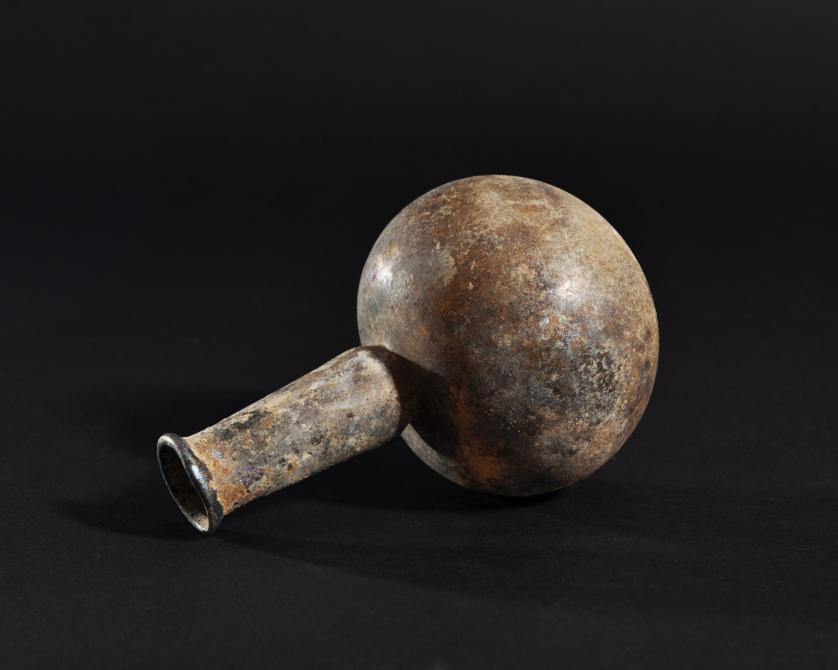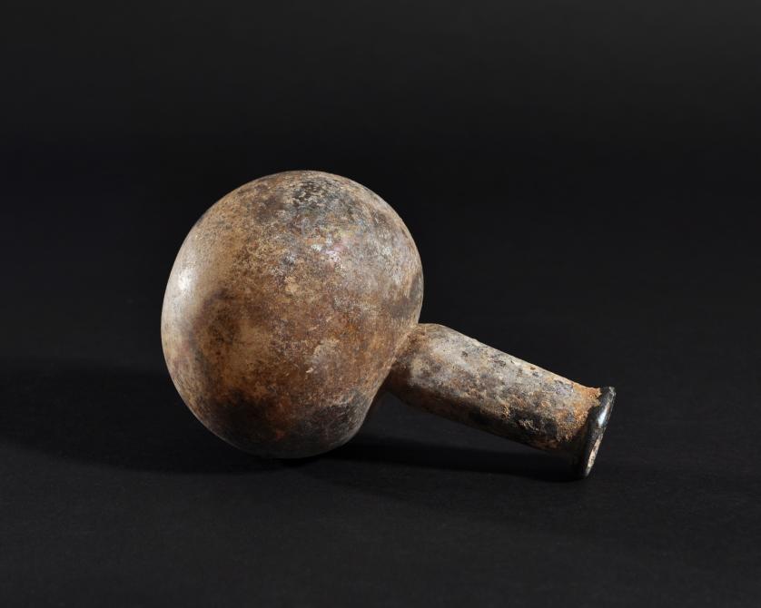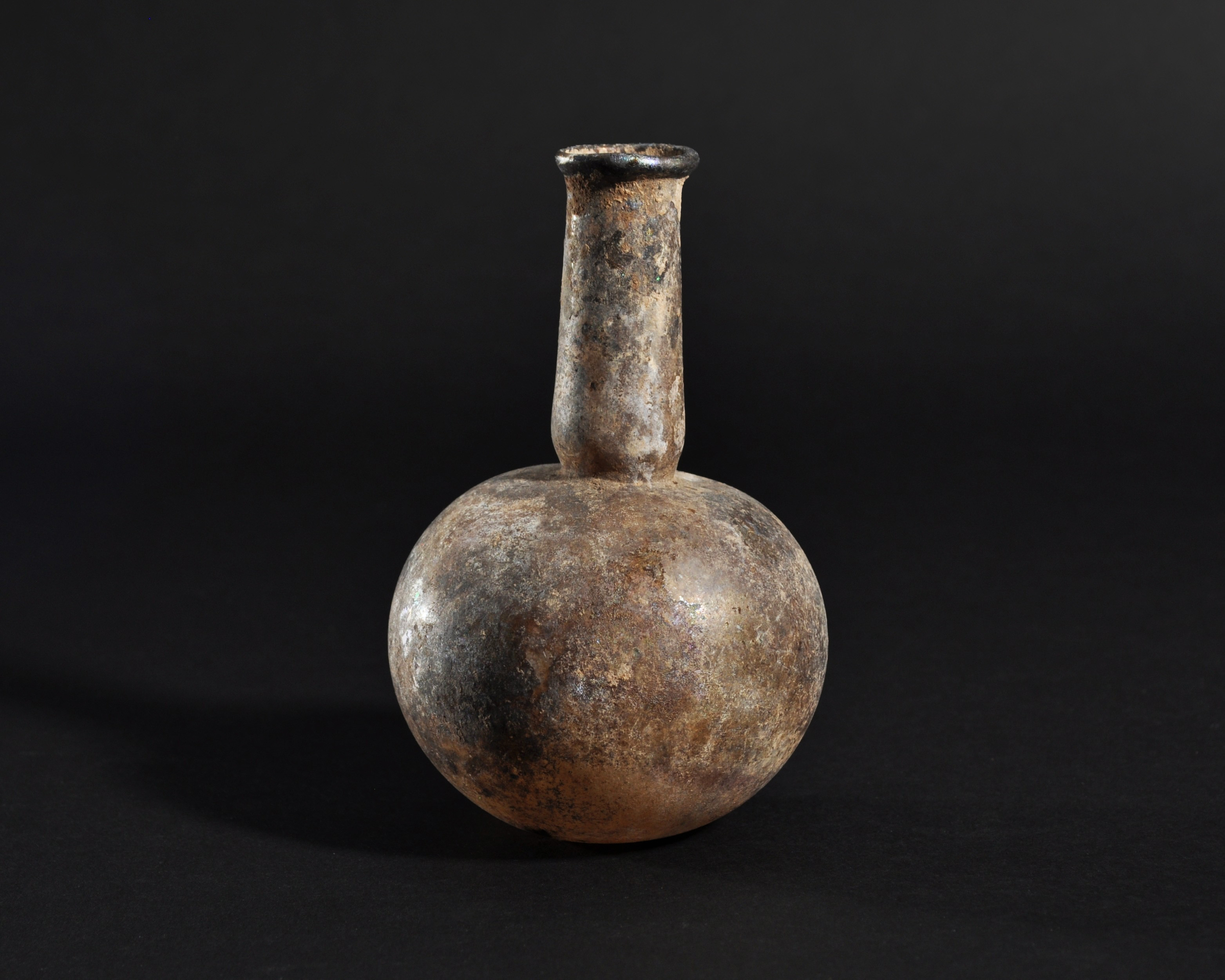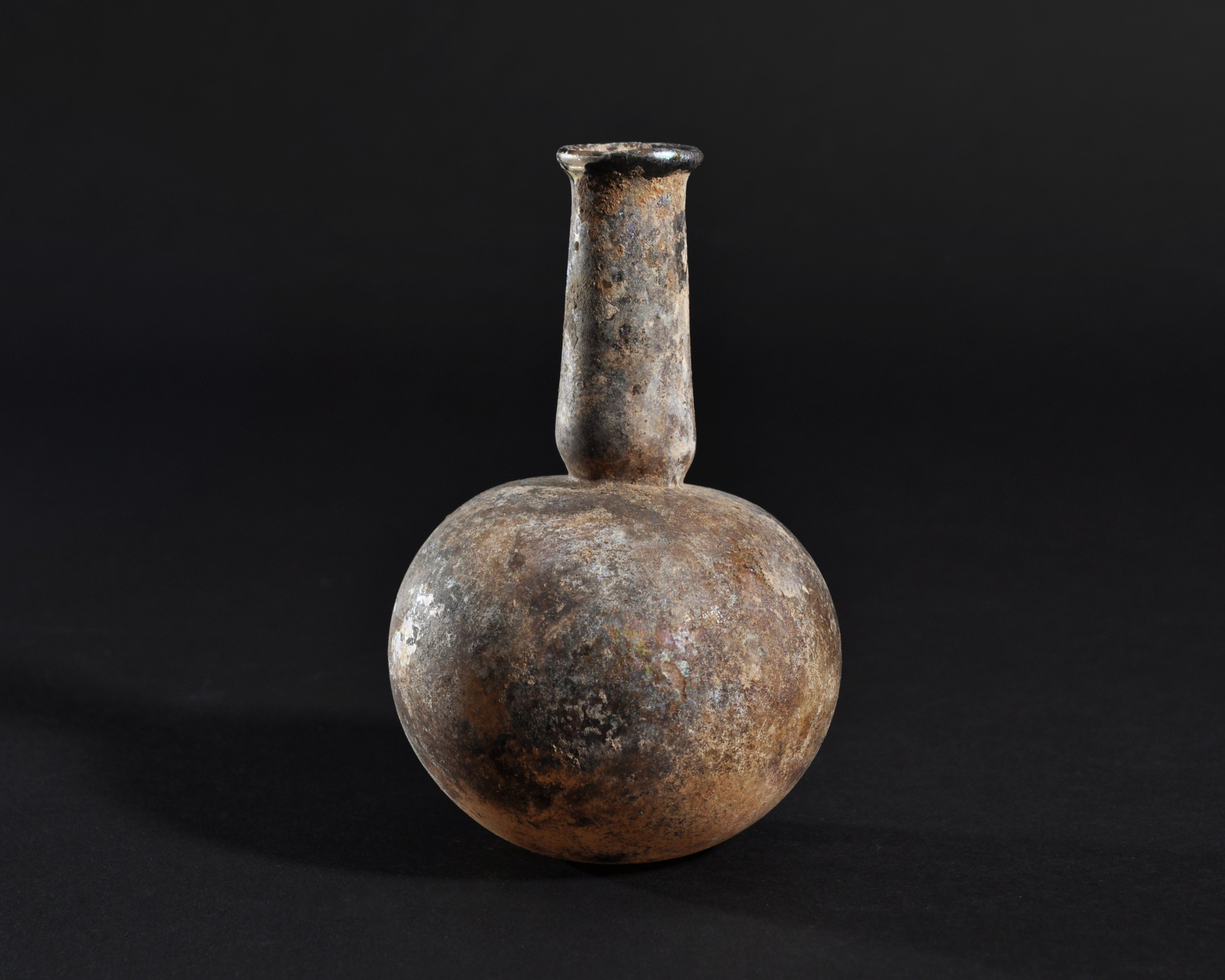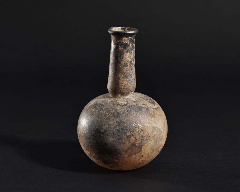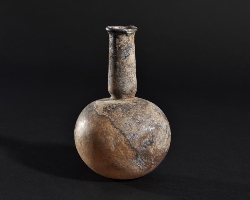 ARQUEOLOGÍA. ROMA. Ungüentario de cuerpo globular y cuello ancho (ss. I-IV d.C.). Vidrio con irisaciones. Altura 12,2 cm.
