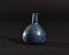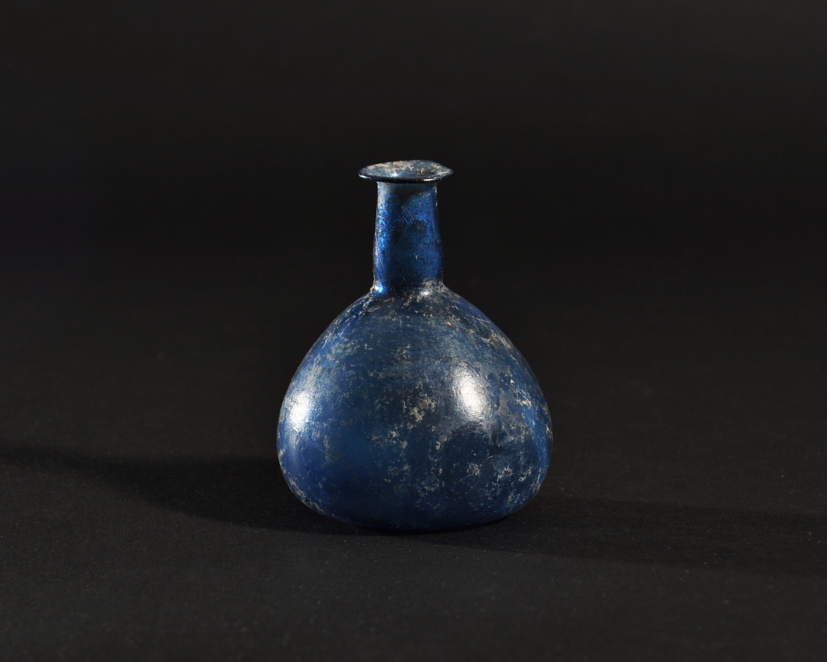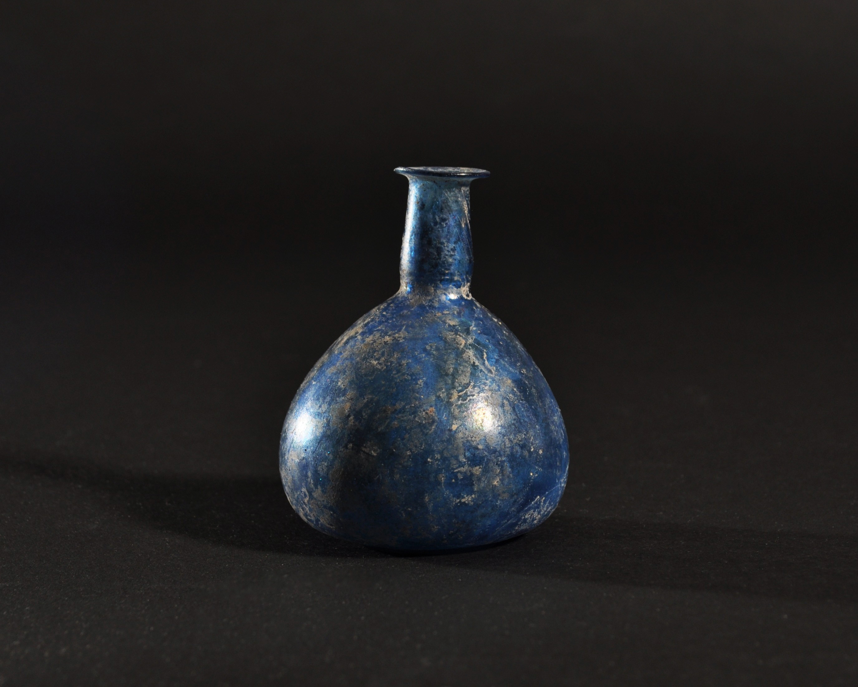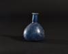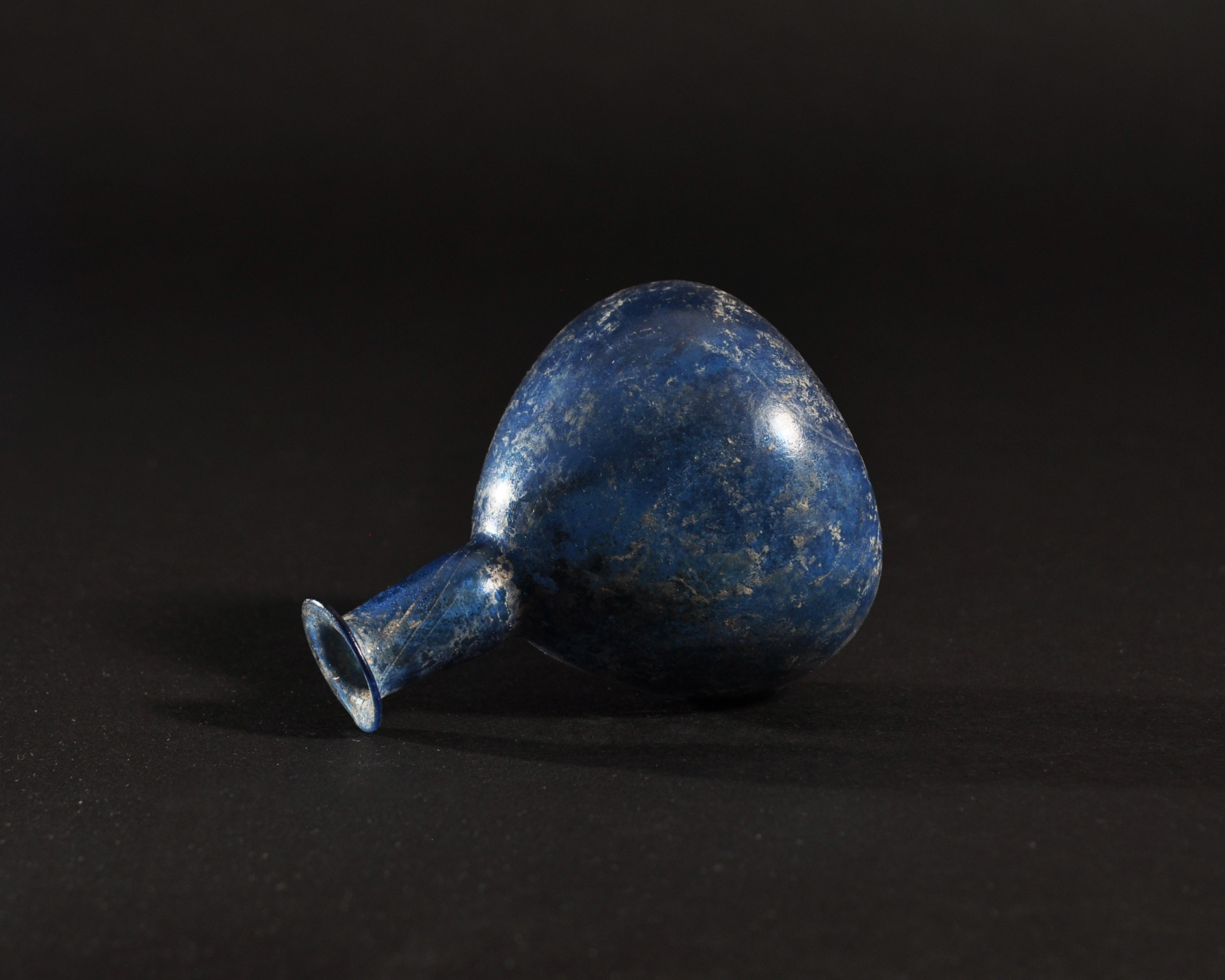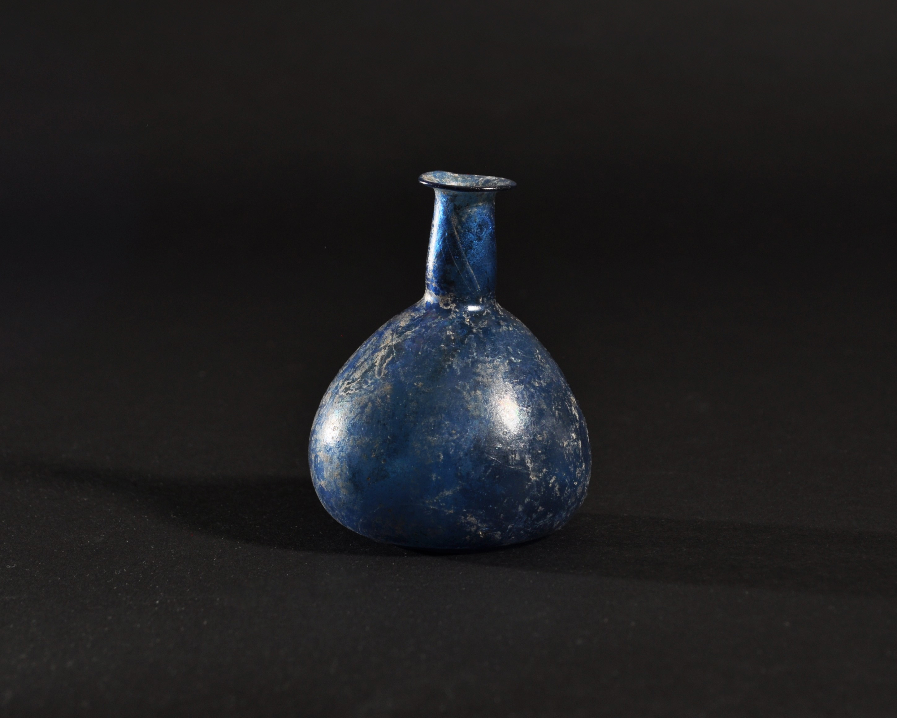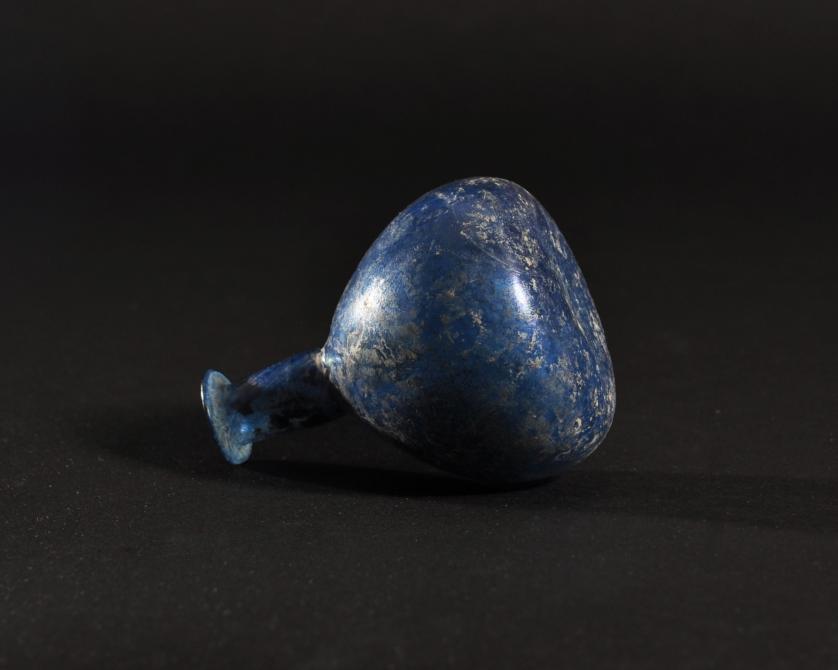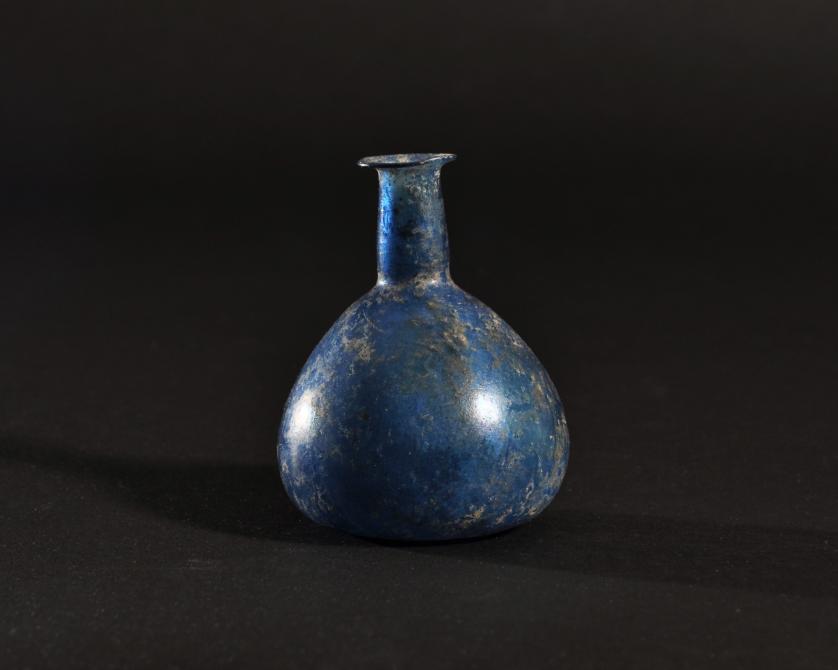 ARQUEOLOGÍA. ROMA. Ungüentario de tonalidad azul con cuerpo globular, cuello corto y boca exvasada (ss. I-IV d.C.). Vidrio con irisaciones. Altura 7,4 cm.