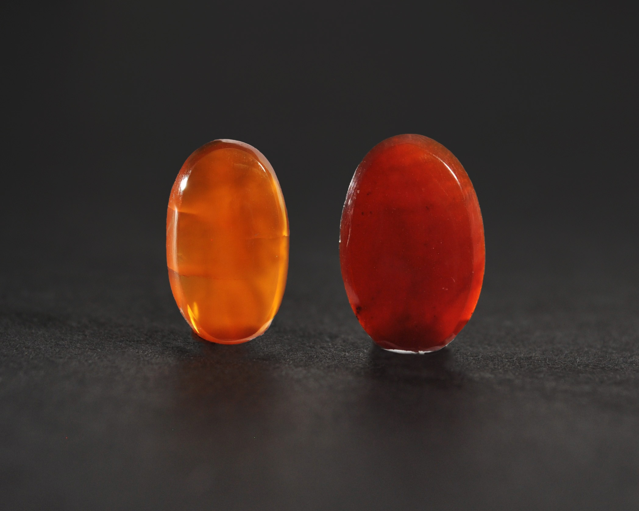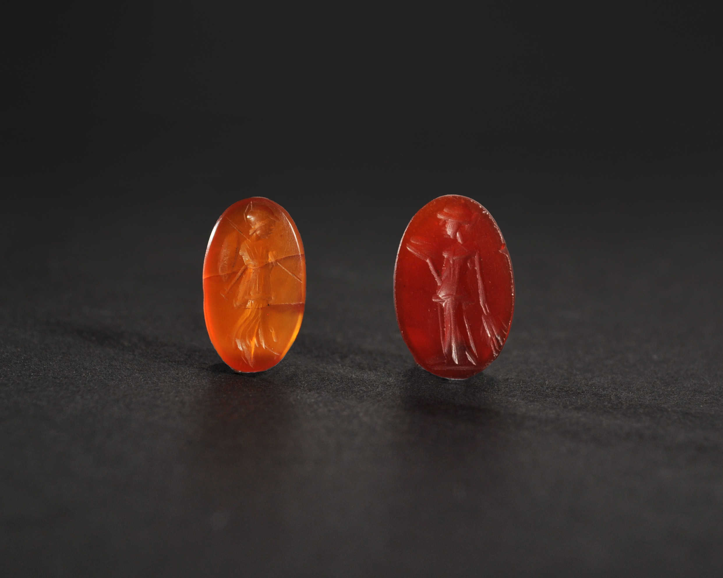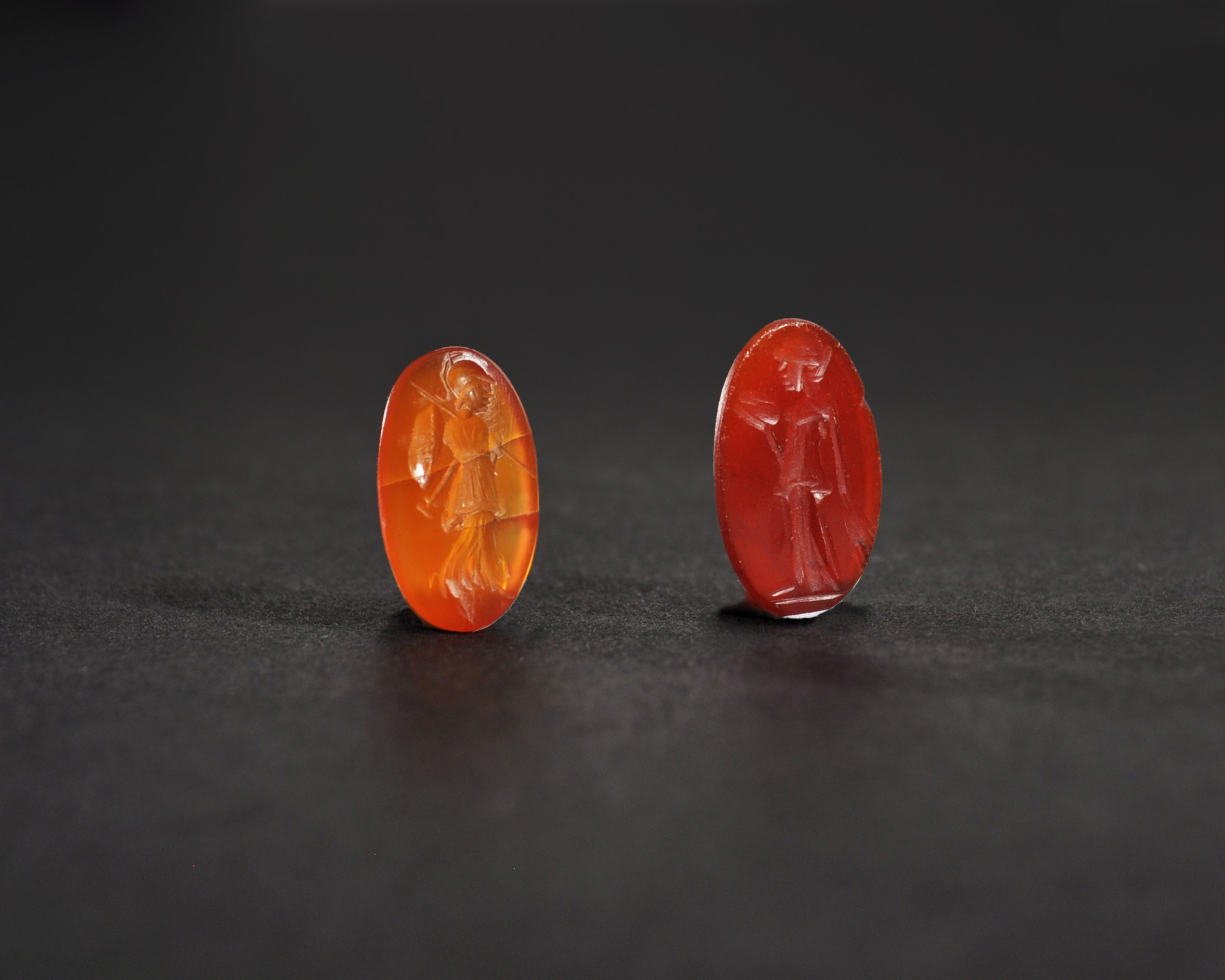 ARQUEOLOGÍA. ROMA. Lote de 2 entalles, con representaciones de Minerva y Ceres (ss. I-III d.C.). Cornalina. Longitud de 1,4 a 1,5 cm.