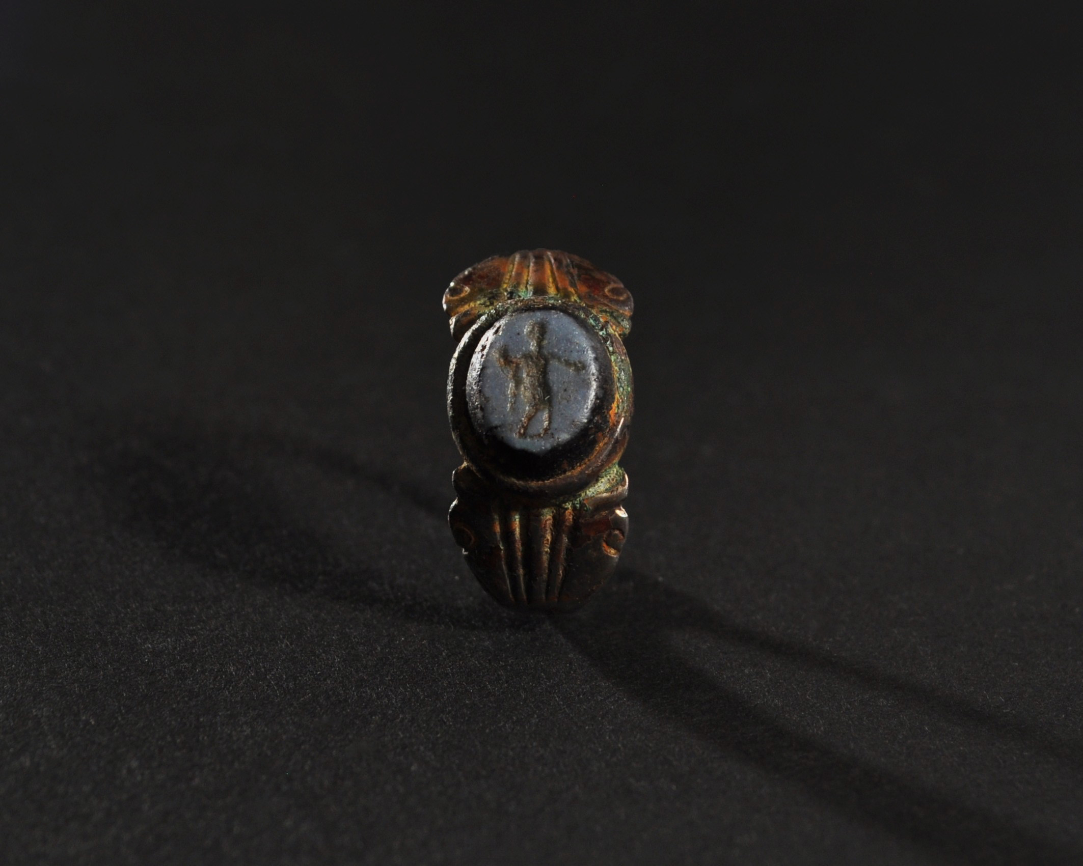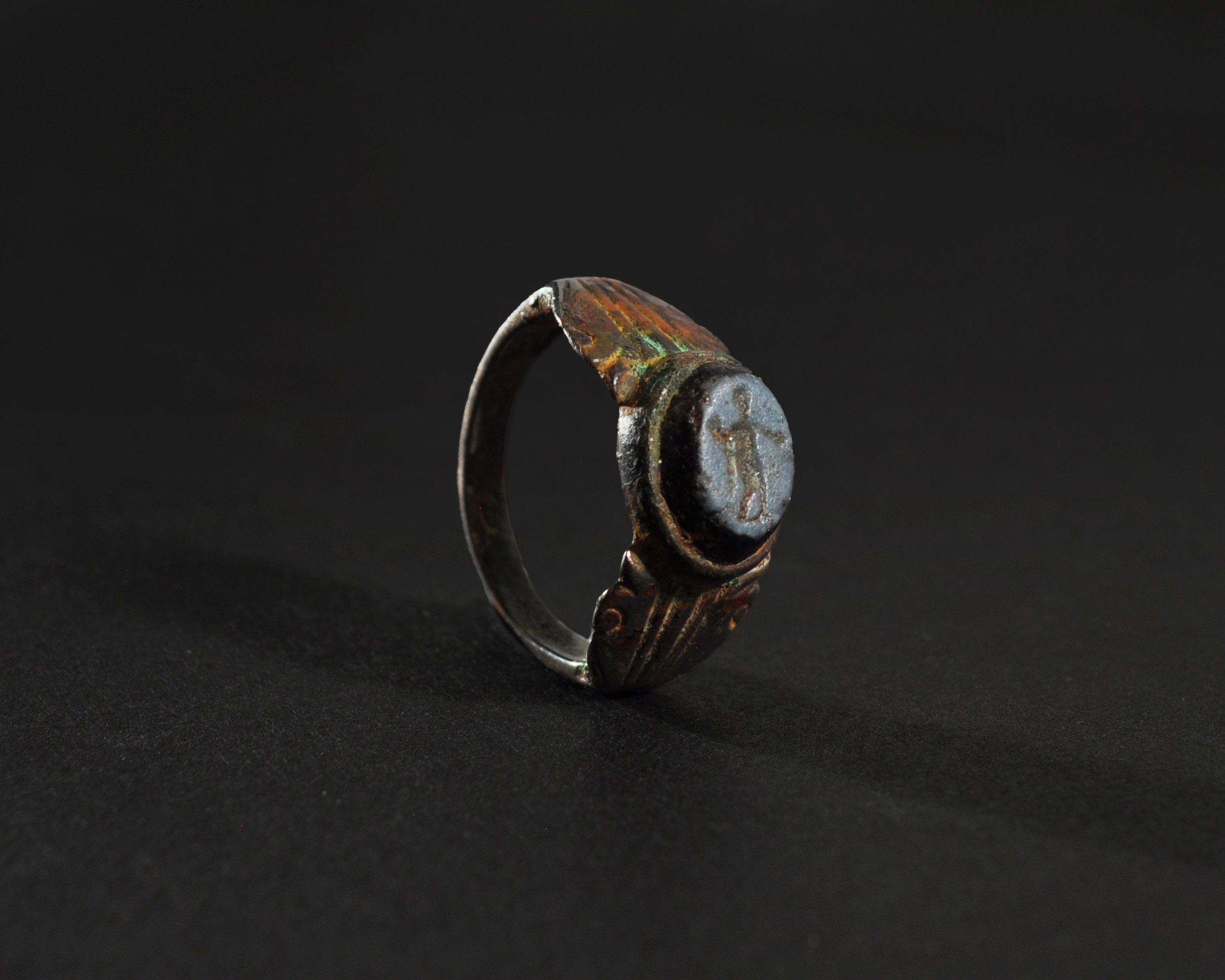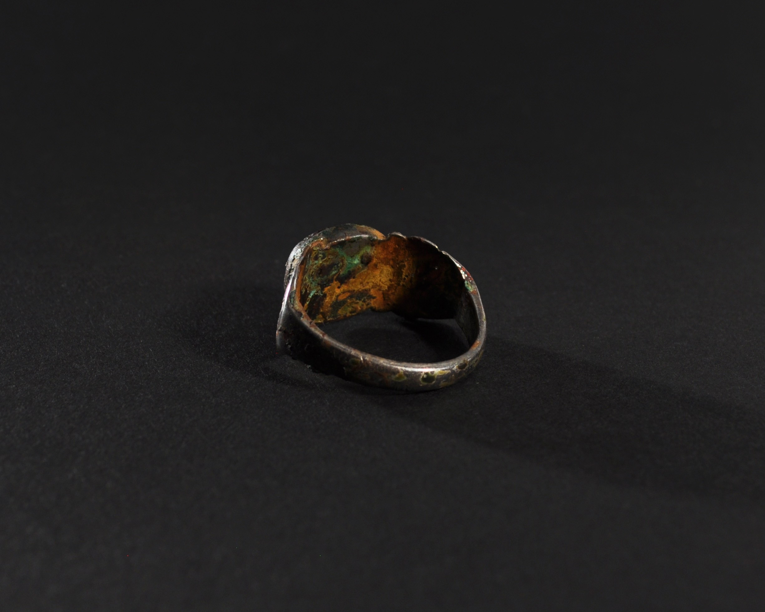 ARQUEOLOGÍA. ROMA. Anillo con entalle imitando nicolo con figura a der. (siglo III d.C.). Plata y pasta vítrea. Longitud 2,3 cm. Presenta adherencias.