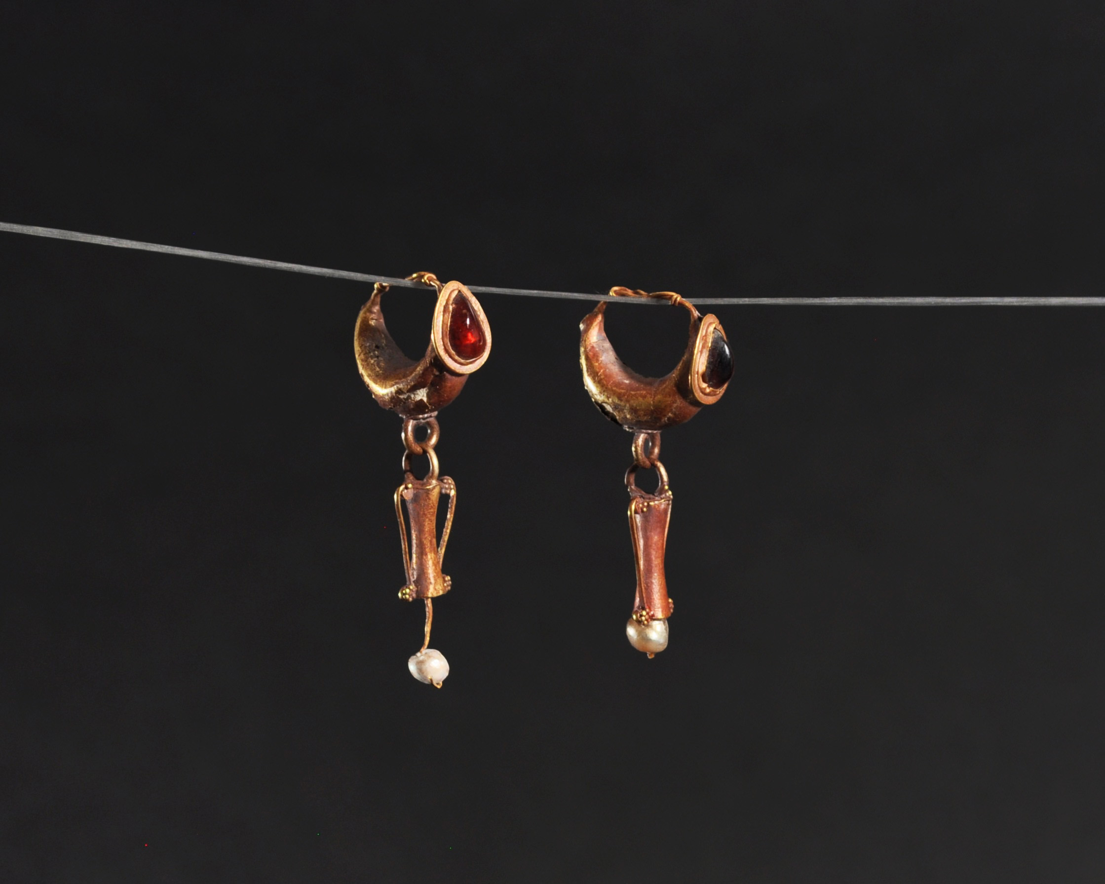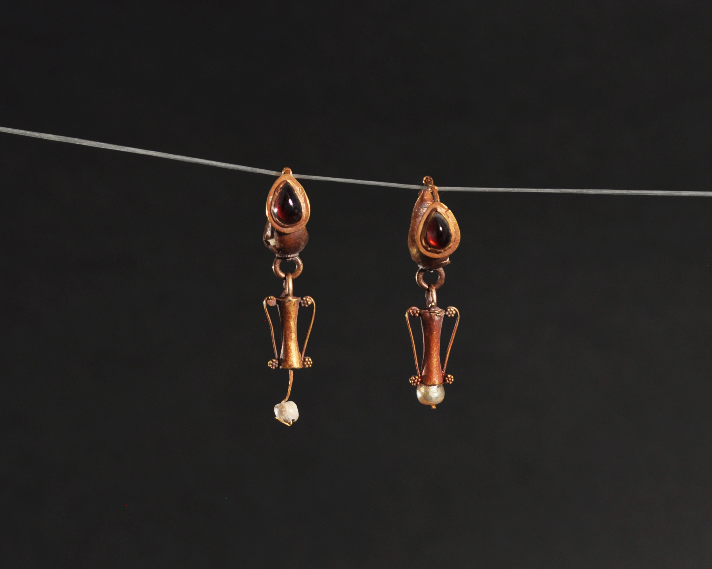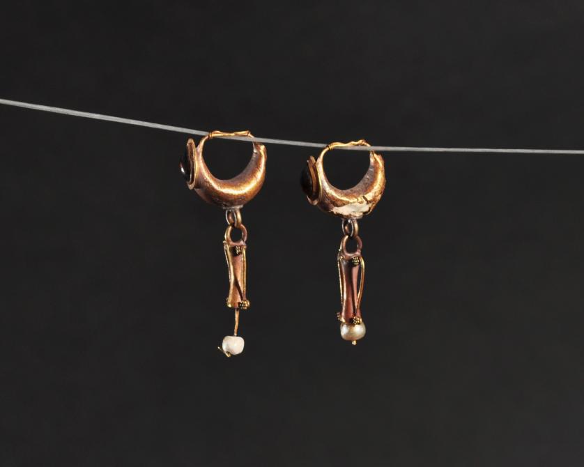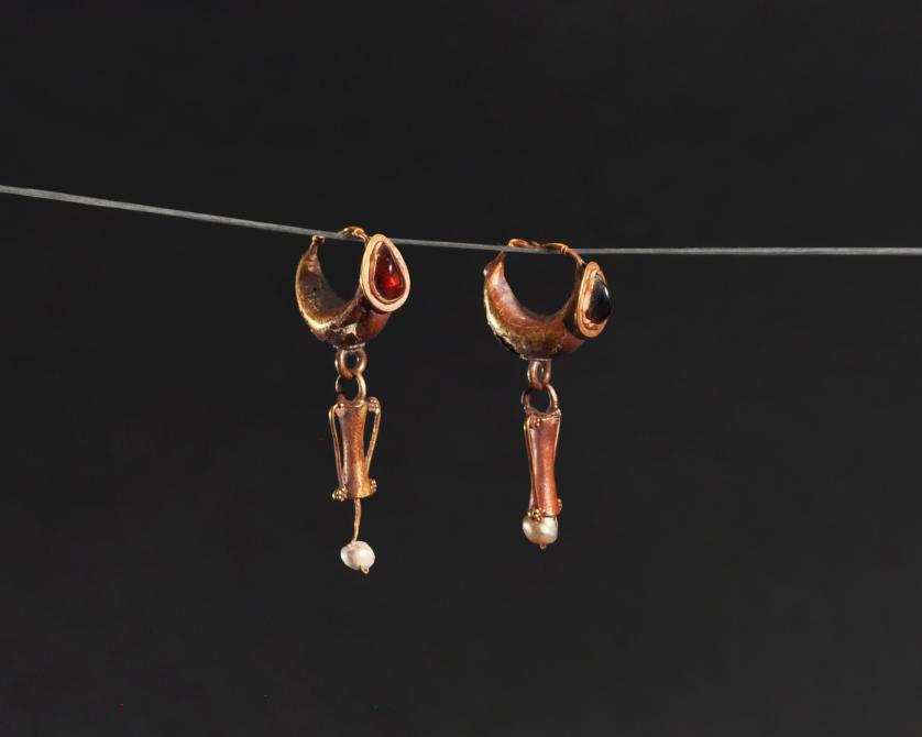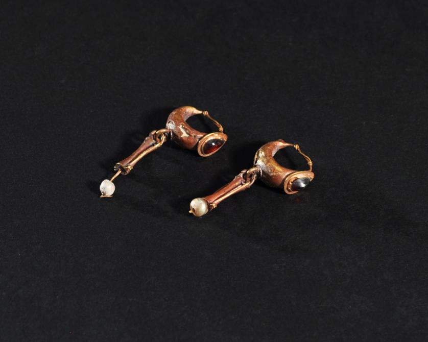 ARQUEOLOGÍA. ROMA. Par de pendientes decorados con piedra en forma de gota engastada y con colgantes en forma de ánfora (ss. I-IV d.C.). Longitud 3,8 cm. Recubiertos en pan de oro. Presenta faltas en el recubrimiento. Adjunta declaración de importación del Ministerio de Cultura de España (no sujeto a tasas de exportación).