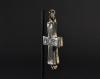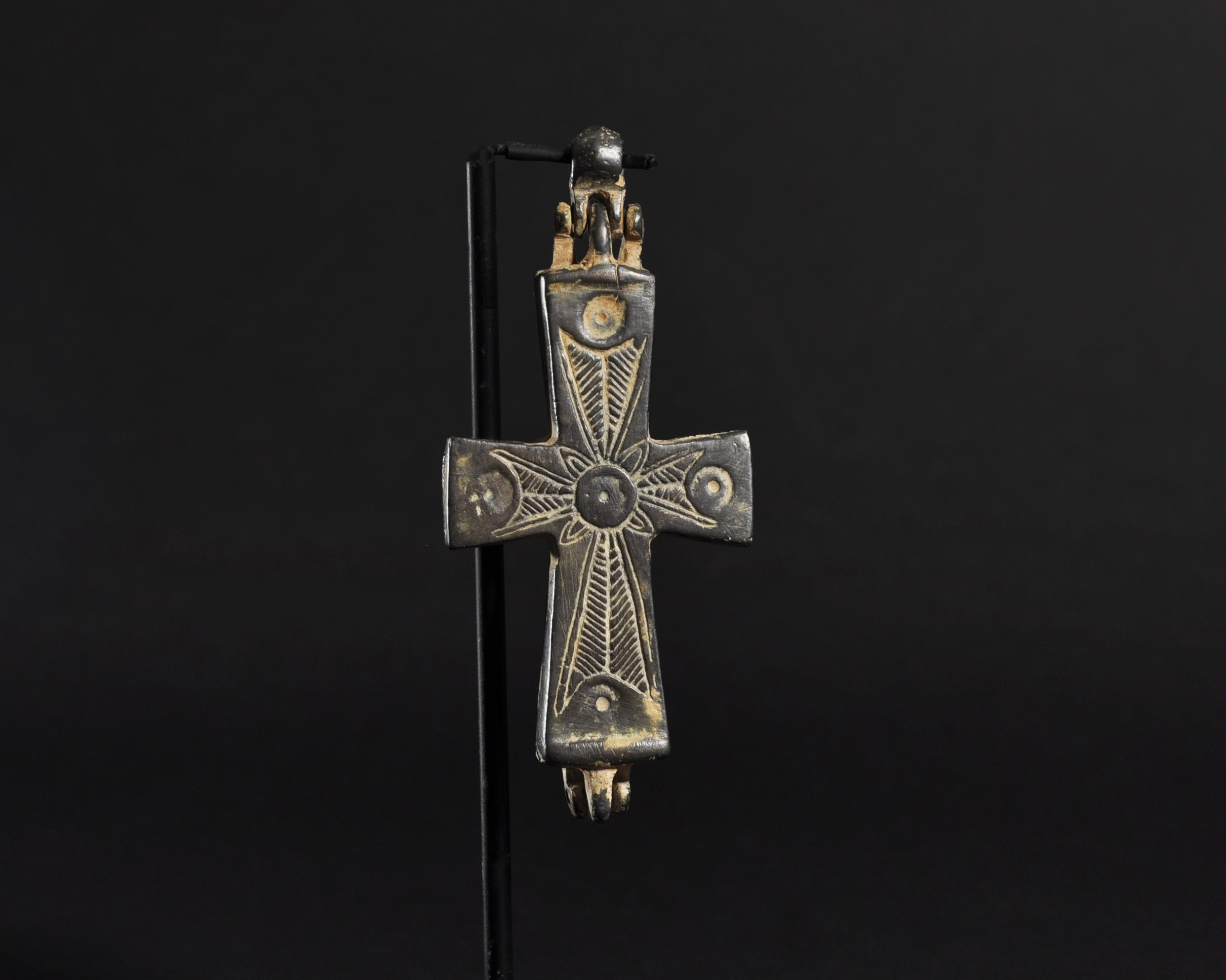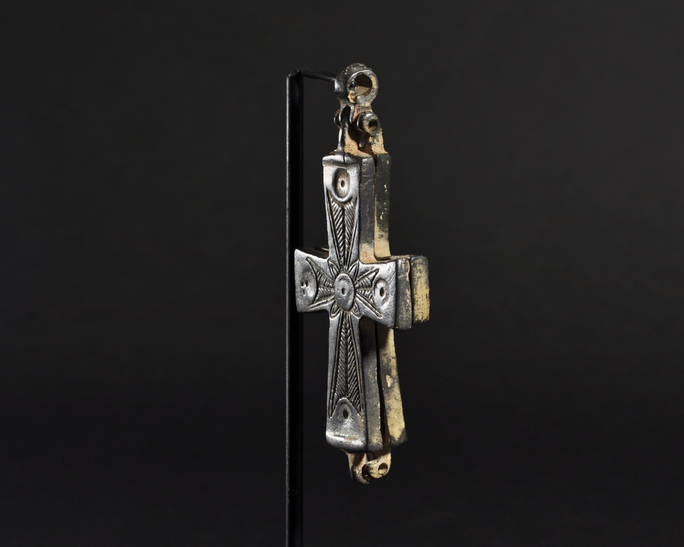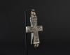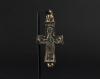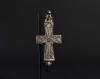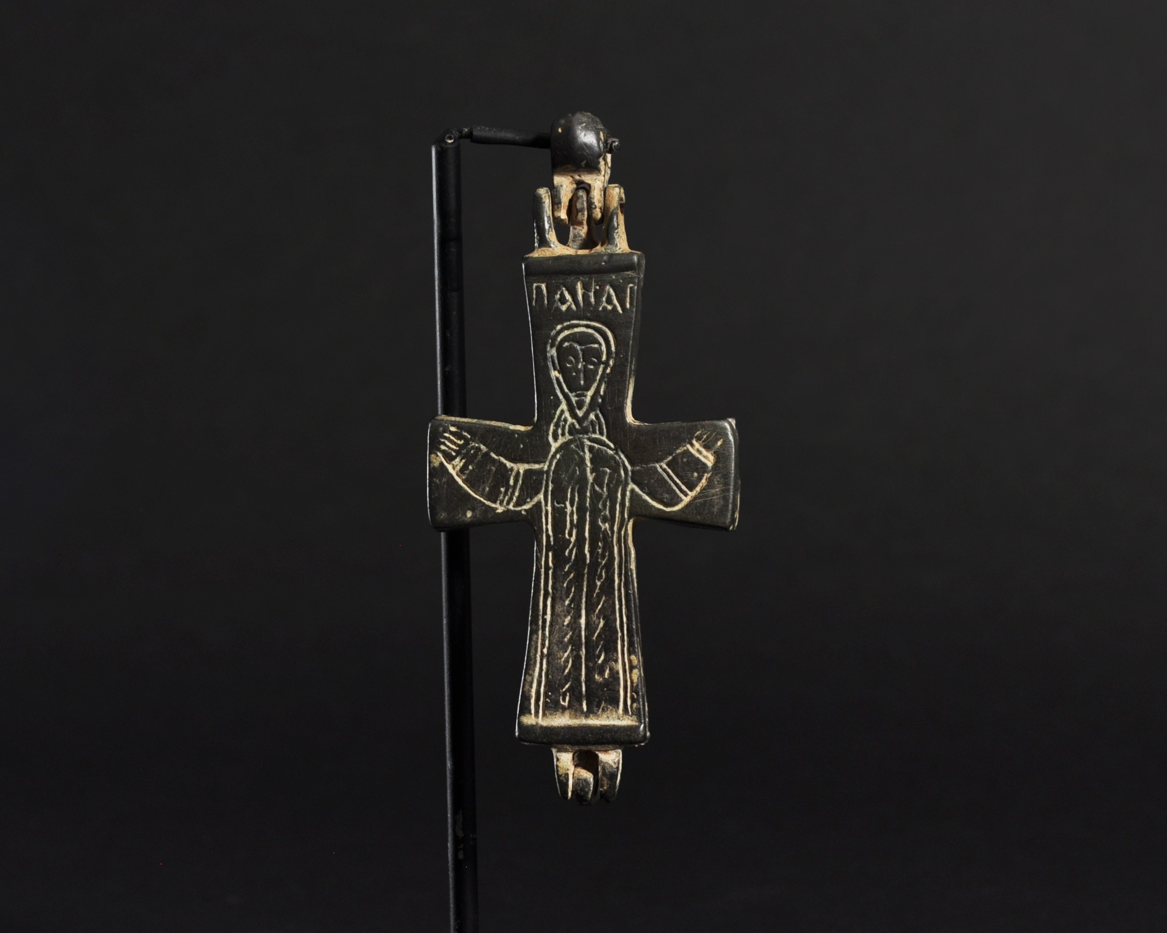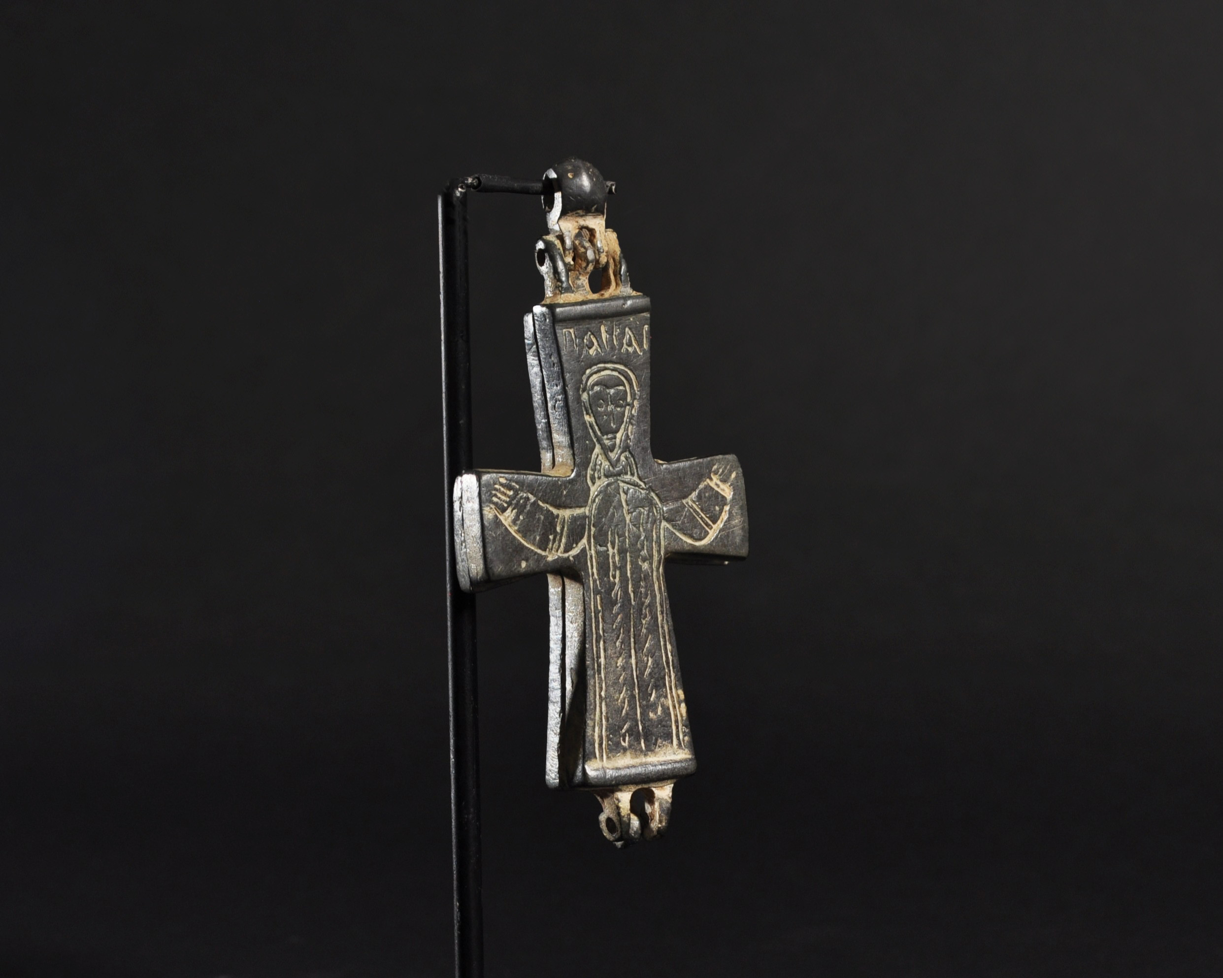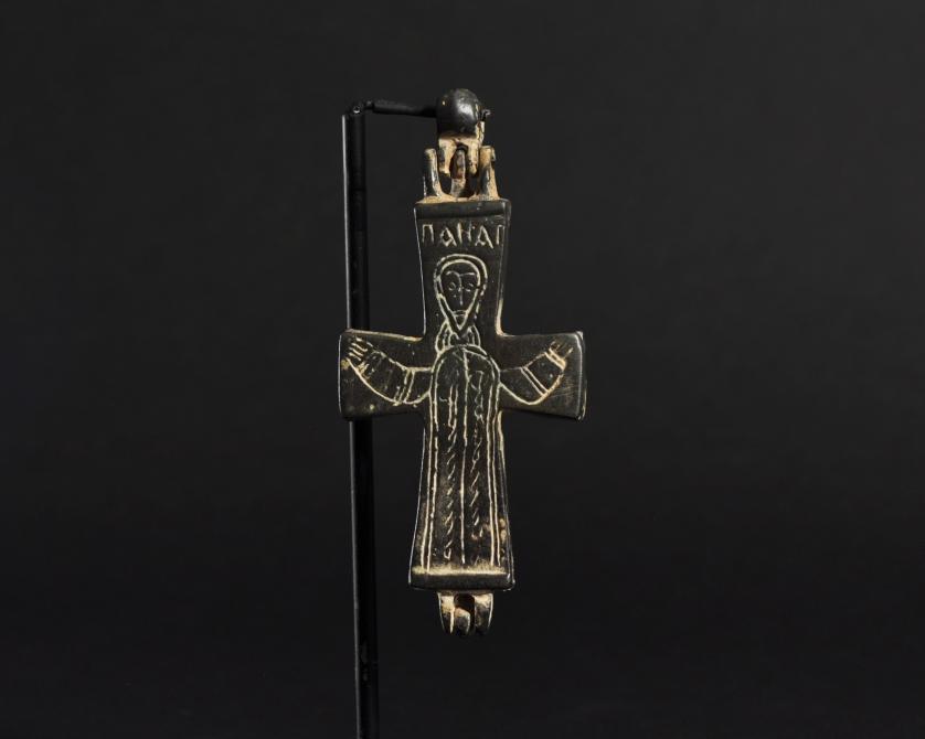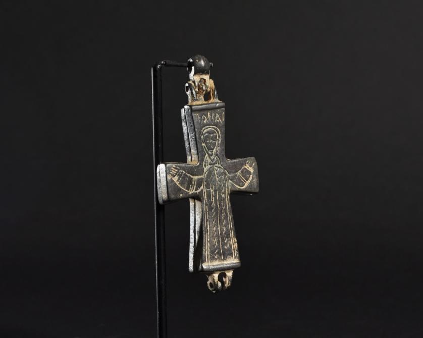 ARQUEOLOGÍA. BIZANCIO. Cruz relicario formada por dos valvas con decoración incisa, en una de las caras con la representación de la Virgen bajo el título de Panagia (ss. IX-XIII). Bronce. Longitud 9,5 cm. La argolla y las valvas se encuentran separadas.