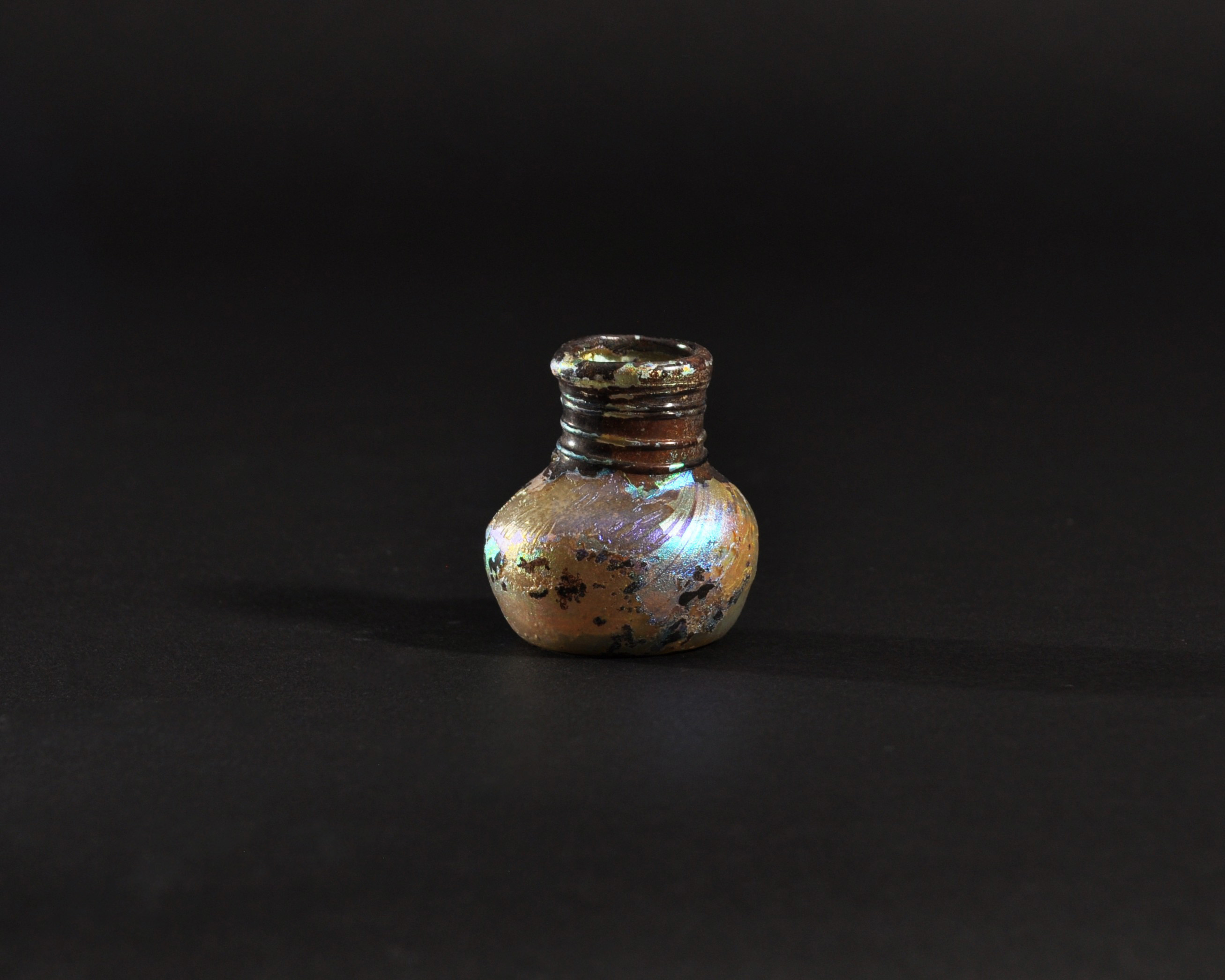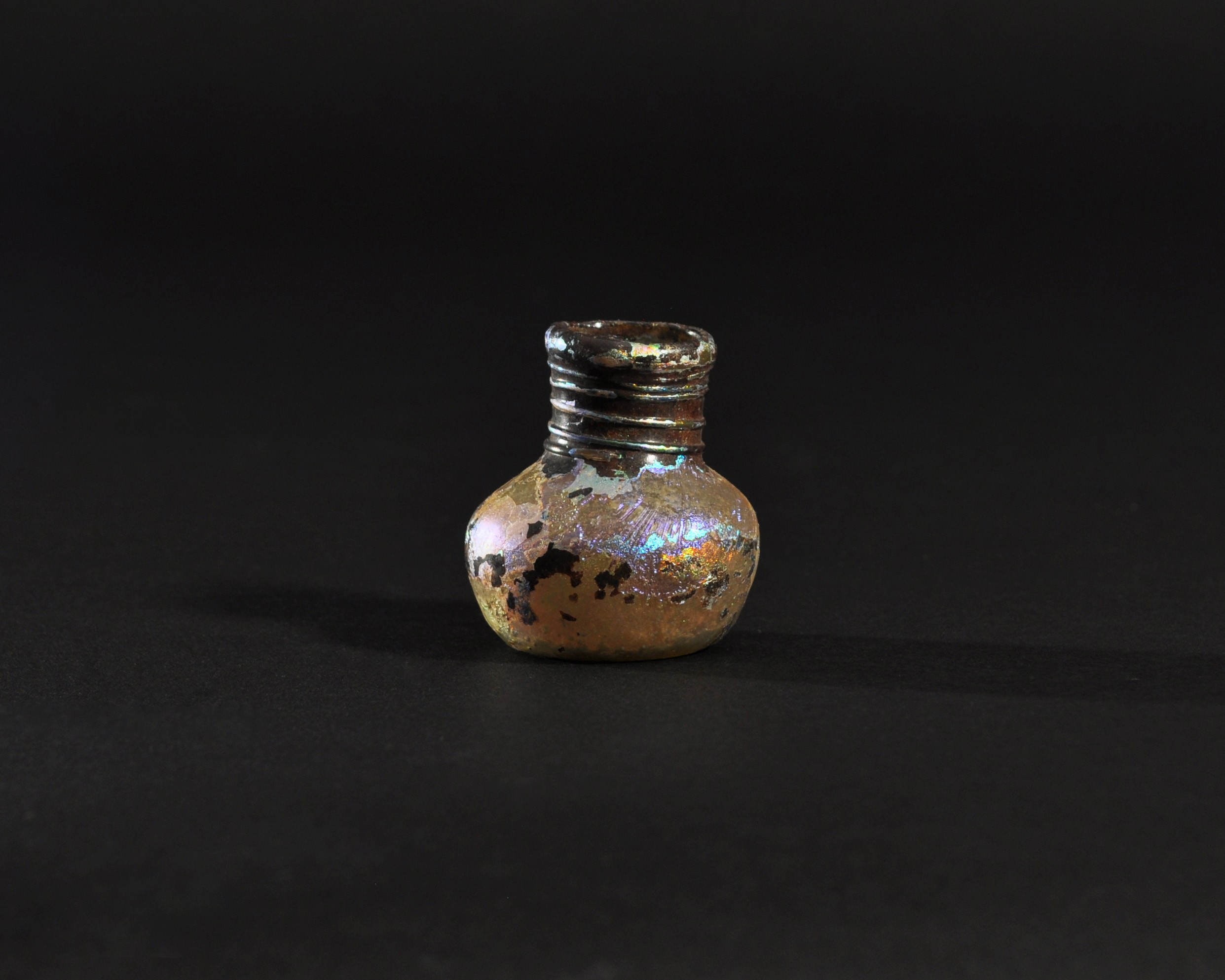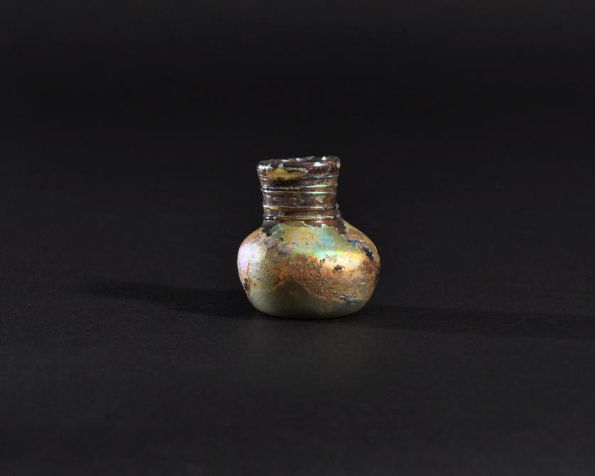 ARQUEOLOGÍA. BIZANCIO. Pequeño ungüentario de cuerpo globular con cuello cilíndrico, ancho, corto y con una decoración de un fino hilo de vidrio que comienza su recorrido en la parte inferior del cuello y finaliza en el labio (ss. IV-VII d.C.). Vidrio con irisaciones. Altura 4 cm.