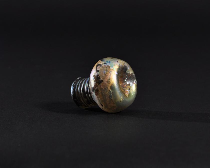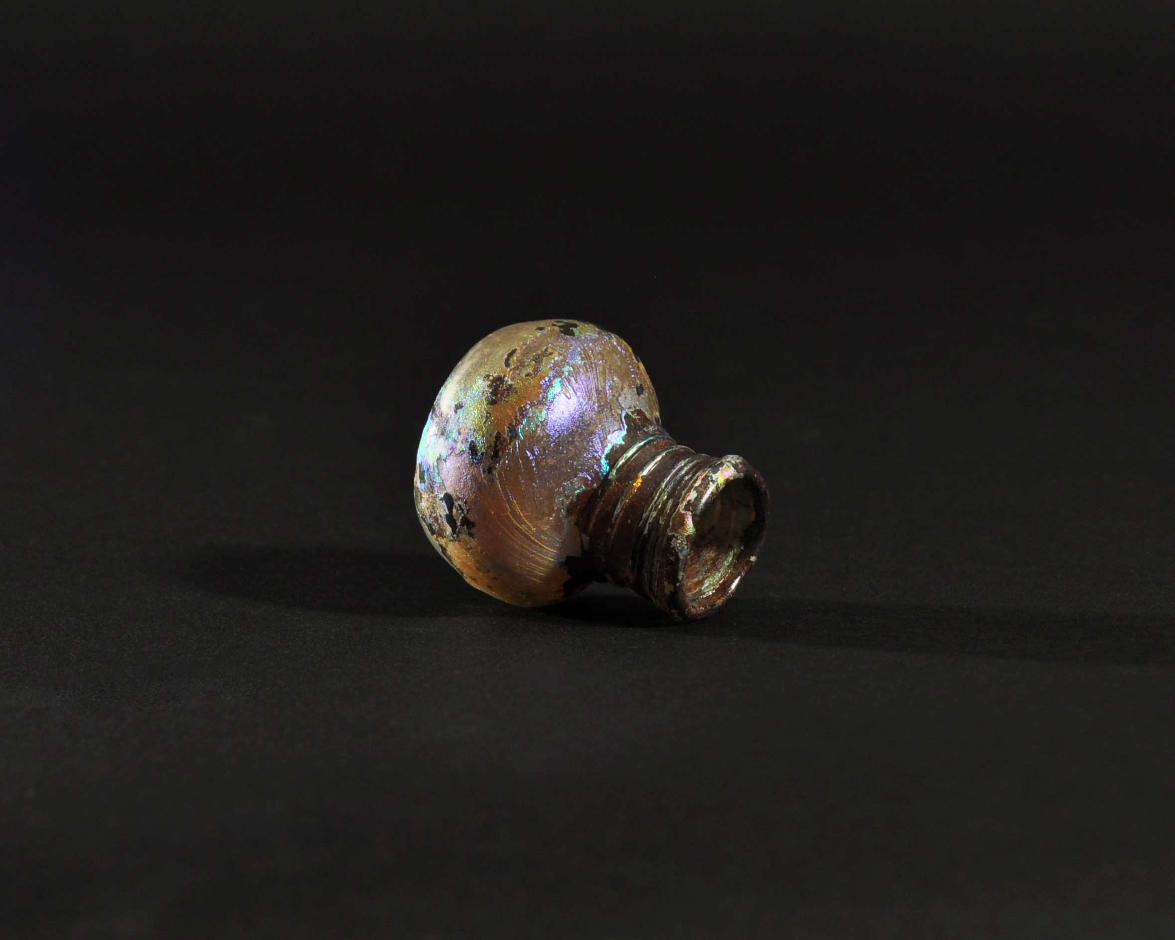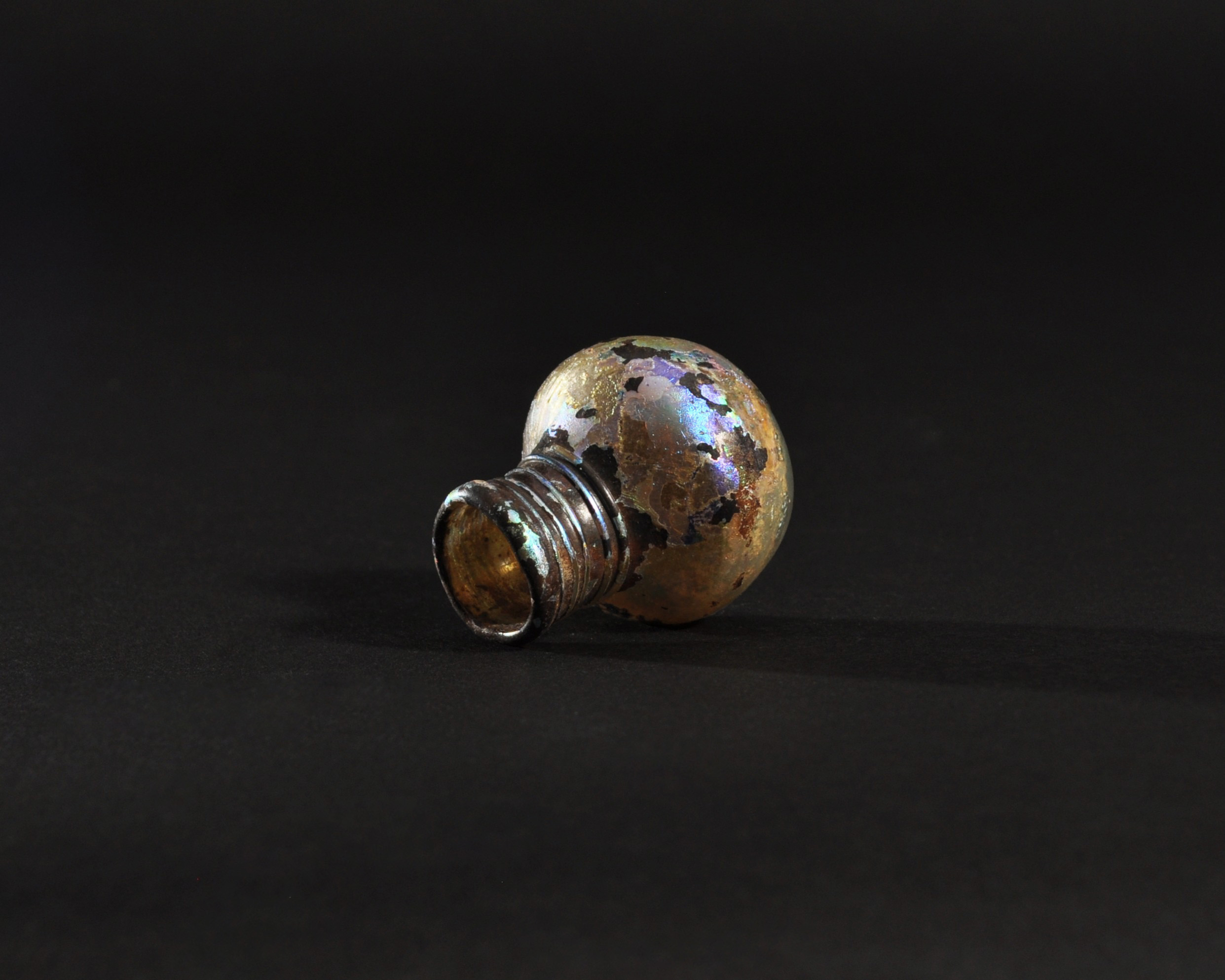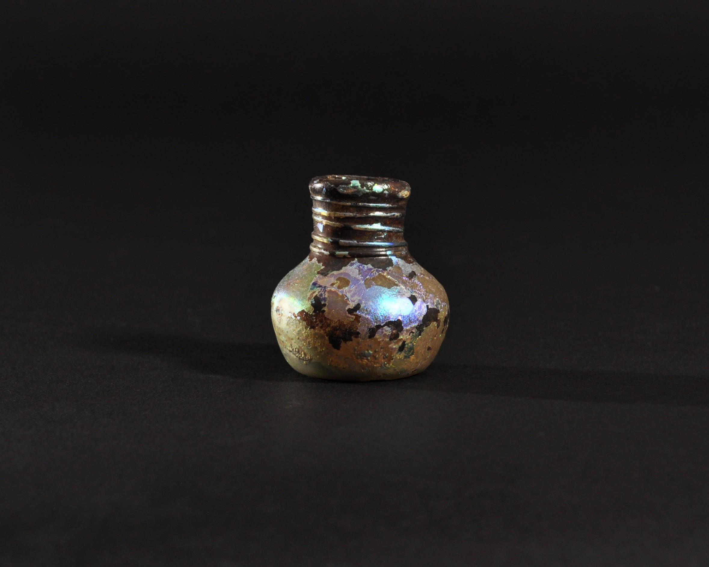 ARQUEOLOGÍA. BIZANCIO. Pequeño ungüentario de cuerpo globular con cuello cilíndrico, ancho, corto y con una decoración de un fino hilo de vidrio que comienza su recorrido en la parte inferior del cuello y finaliza en el labio (ss. IV-VII d.C.). Vidrio con irisaciones. Altura 4 cm.