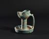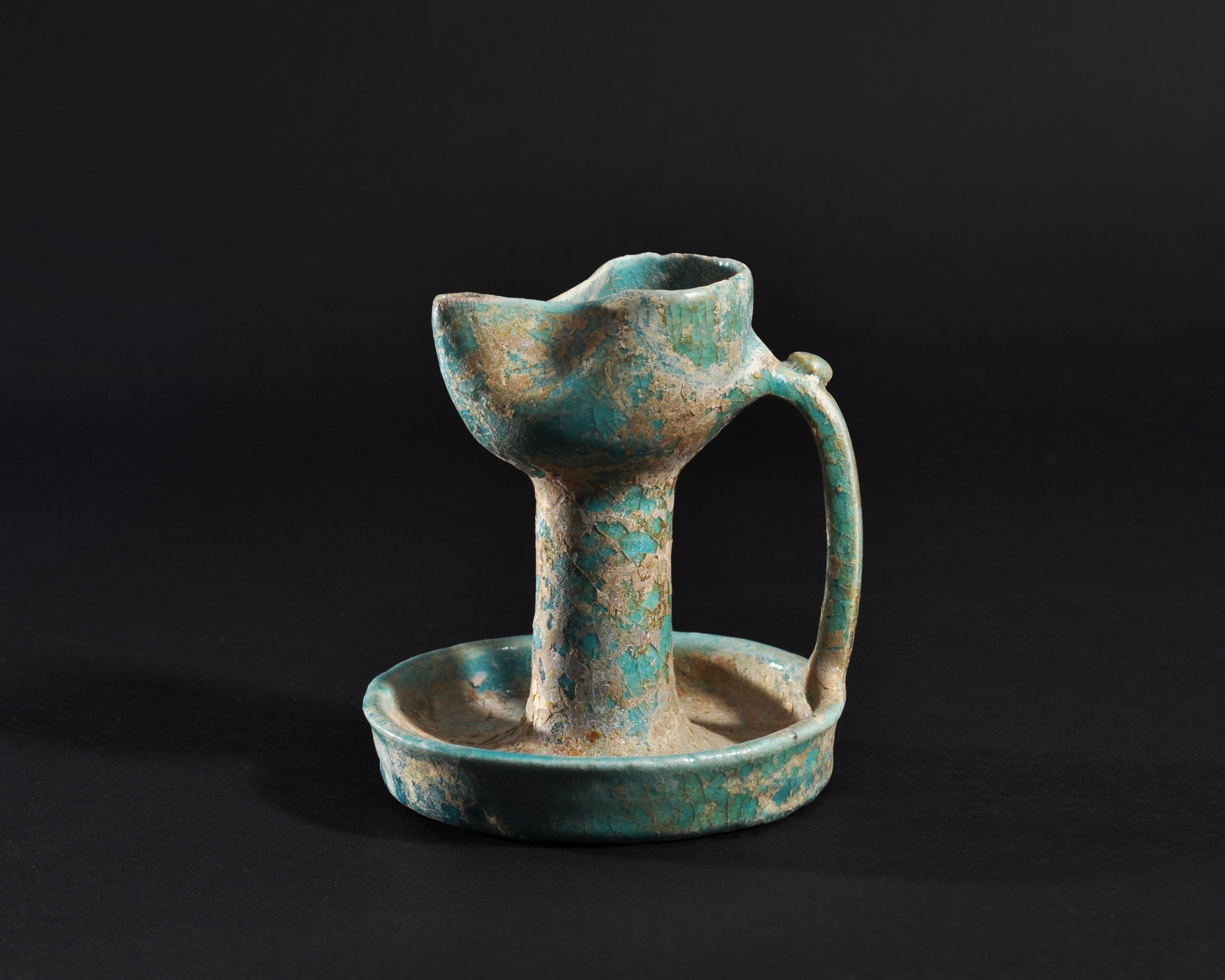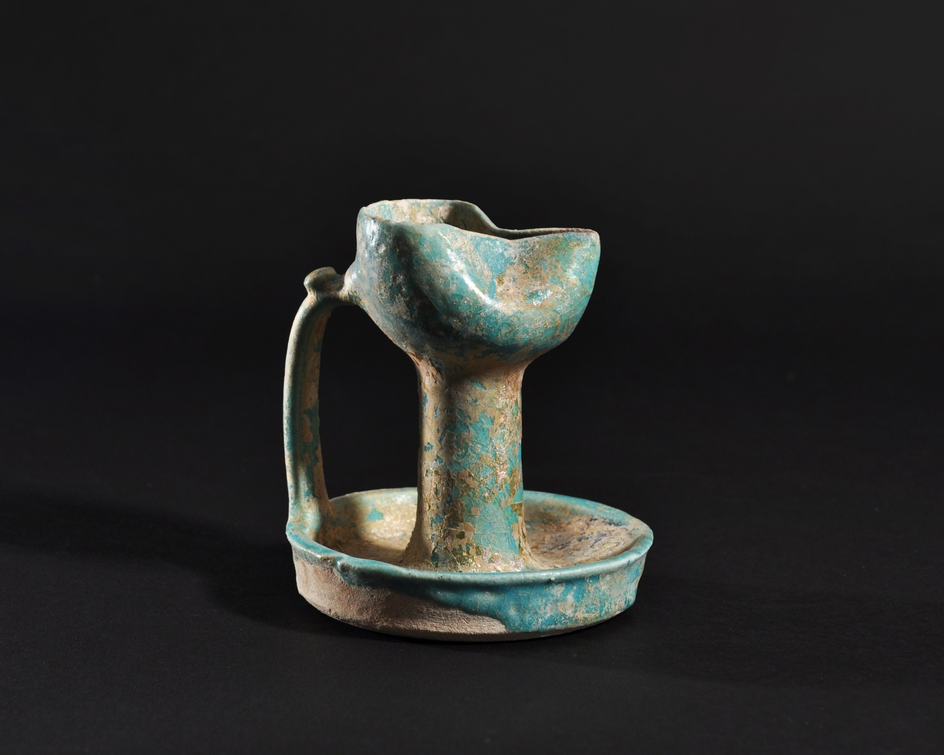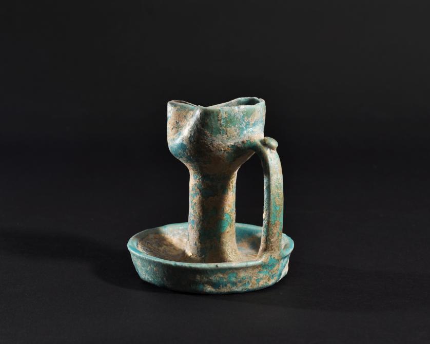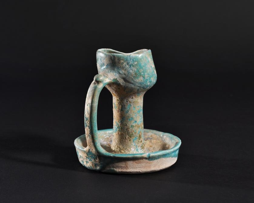 ARQUEOLOGÍA. AL-ÁNDALUS. Candil de pie alto, con plato circular, cazoleta con piquera de pellizco y asa (ss. XIII-XIV). Cerámica vidriada. Altura 10 cm. Lote no exportable.