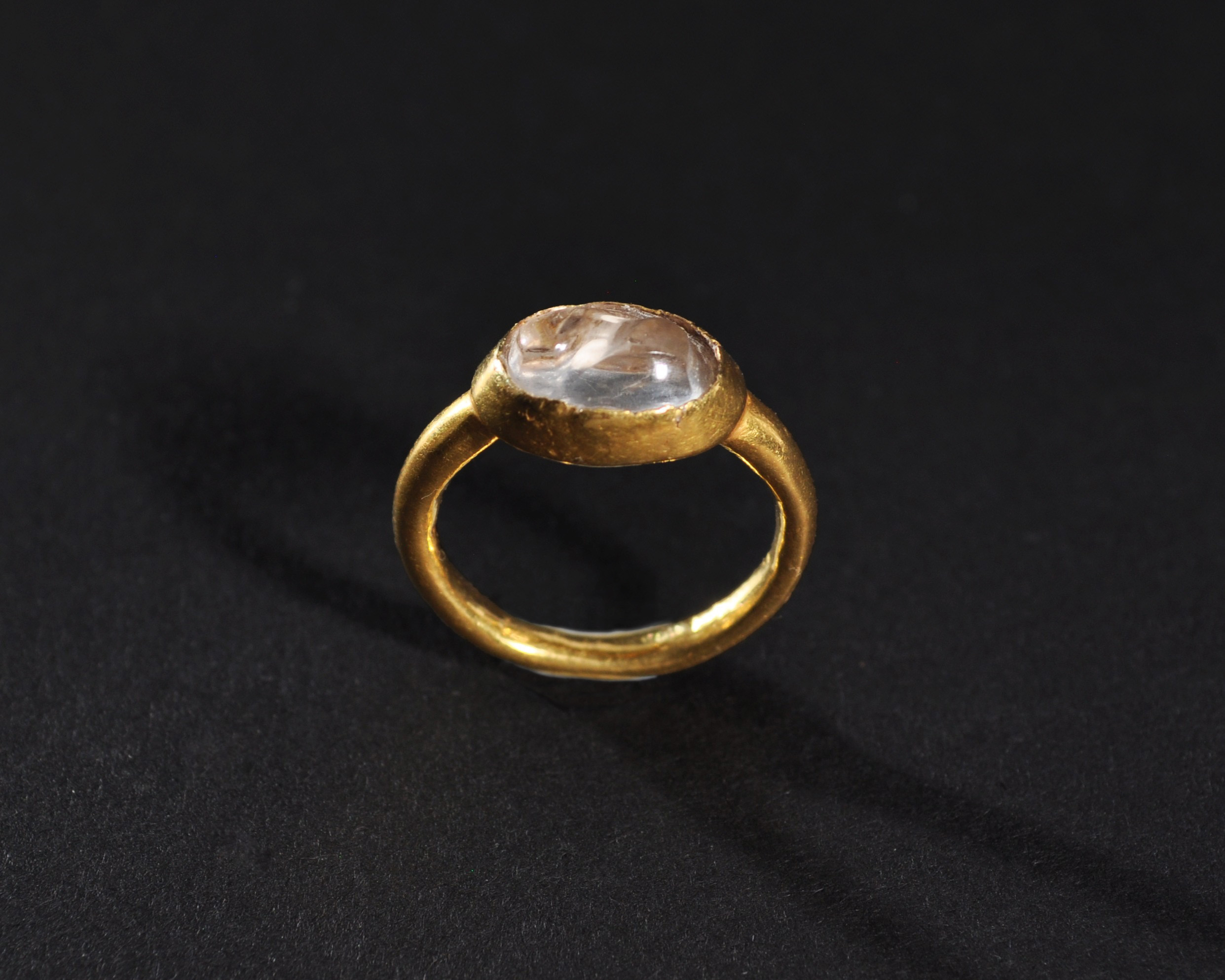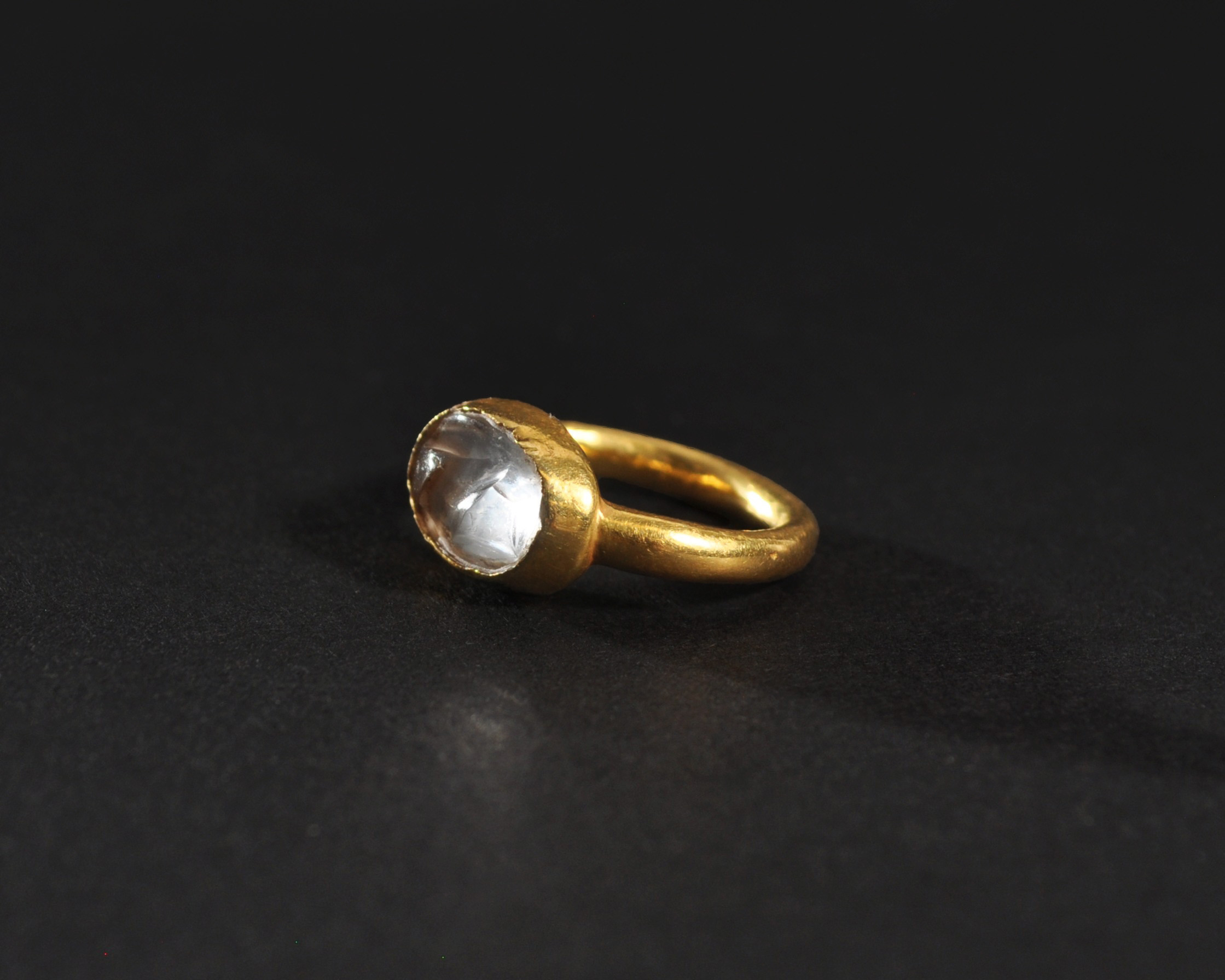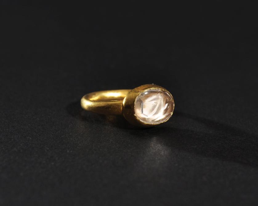 ARQUEOLOGÍA. MUNDO ISLÁMICO. Anillo de aro liso y cazoleta central con piedra de cristal de roca (post. ss. X-XI). Oro. Diámetro 2 cm.