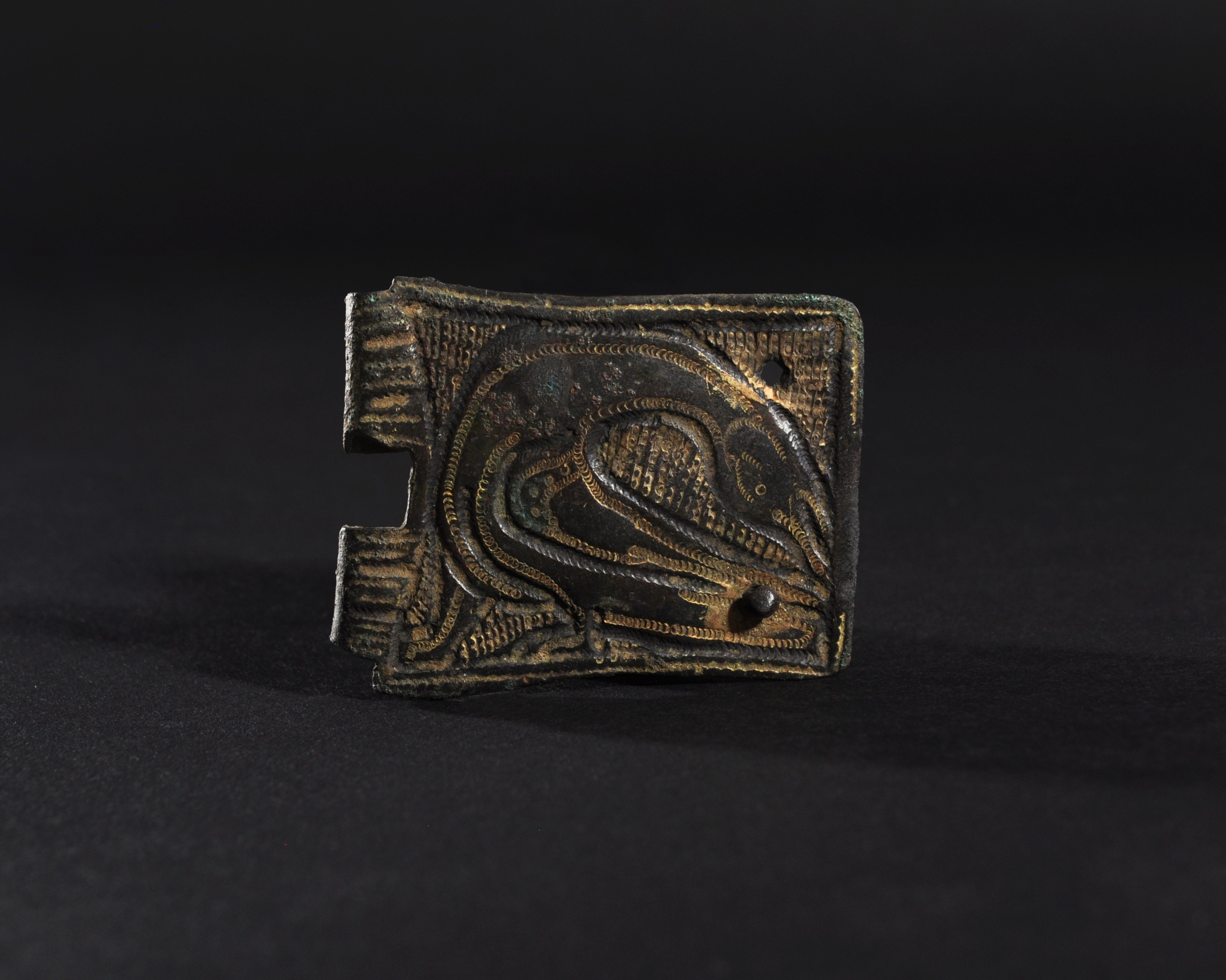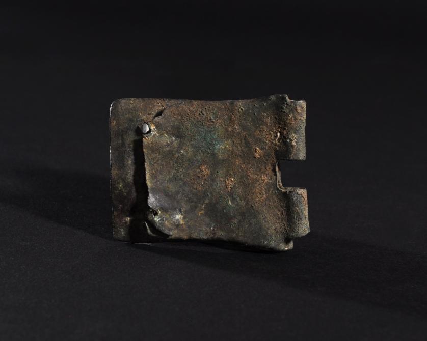 ARQUEOLOGÍA. EDAD MEDIA. Placa de hebilla de cinturón (ss. XIII-XV). Bronce. Longitud 5,2 cm.