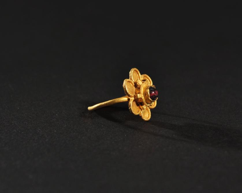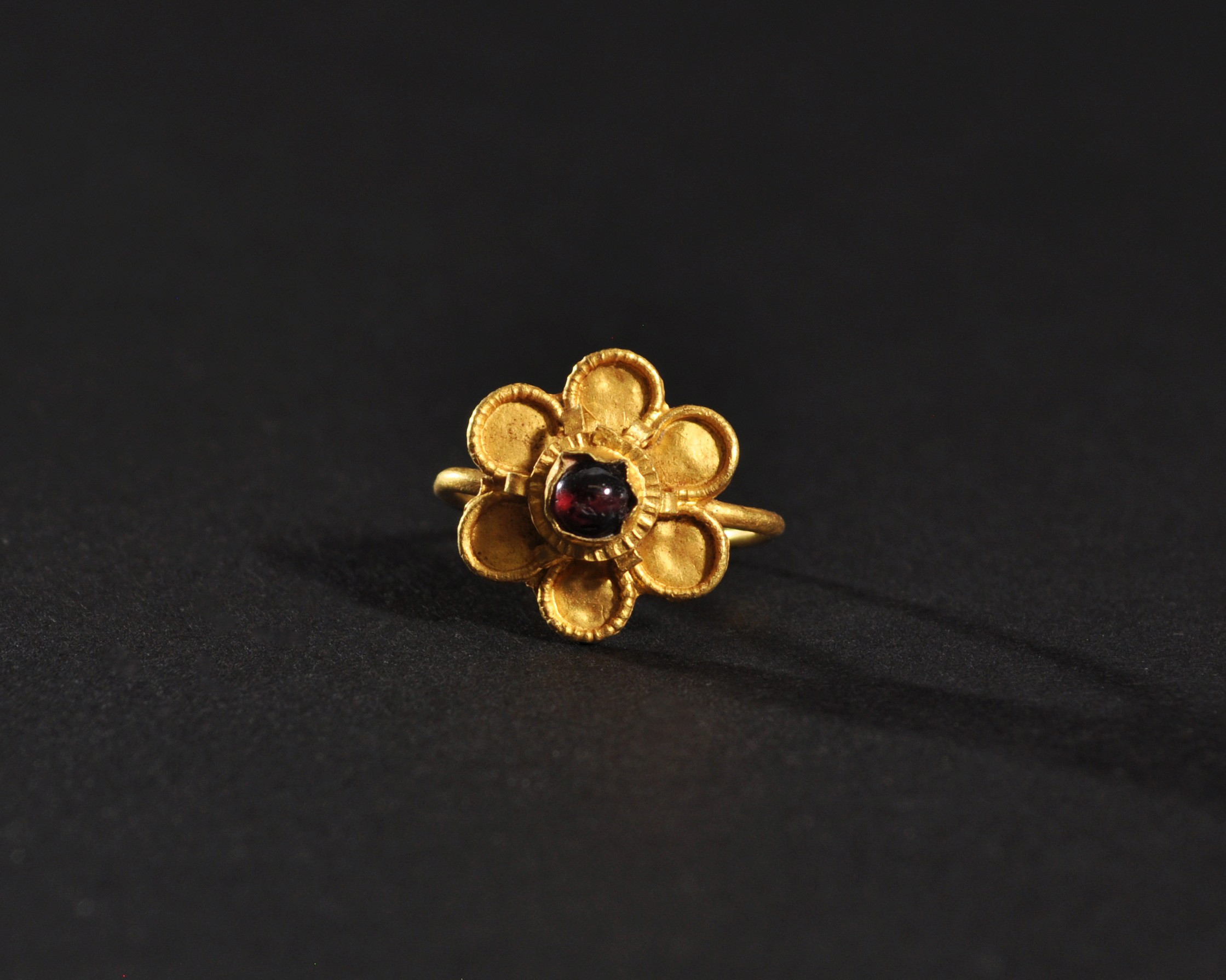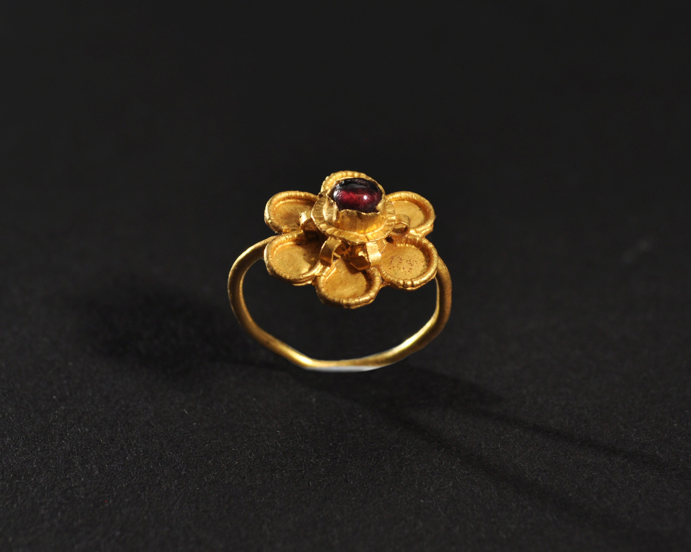ARQUEOLOGÍA. EDAD MODERNA. Anillo de aro liso con decoración de flor de seis pétalos, con centro de cabujón engastado (¿siglo XVI?). Oro. Diámetro 1,7 cm.